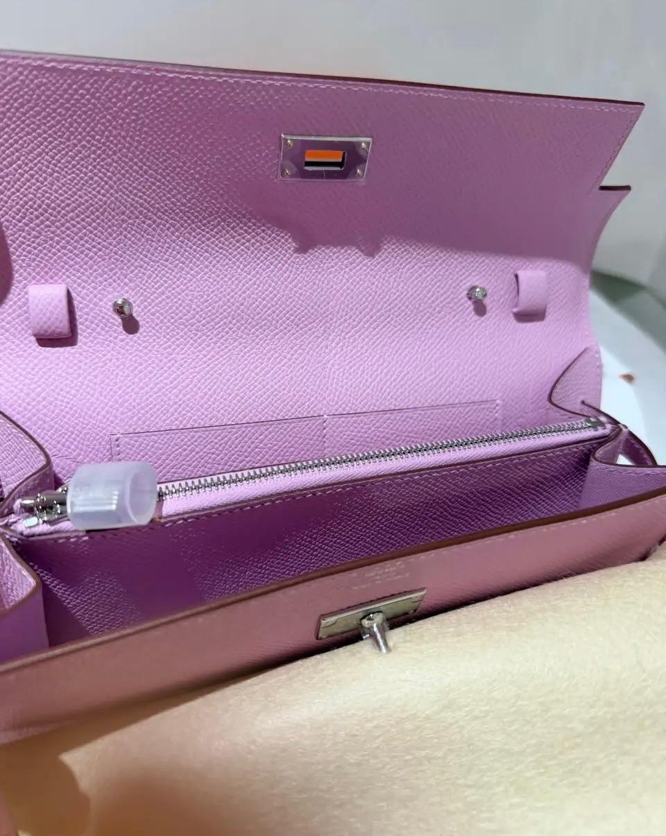 Hermès Kelly To Go in Epsom leather in Mauve Sylvestre color, 2025z This versatile model has a detachable shoulder strap, so it can be worn not only as a clutch but also as a shoulder bag. Despite its handy size, you can store your smartphone as well as your most frequently used cards inside. The Kelly To Go comes in a completely new condition with box dustbag, strap and receipt