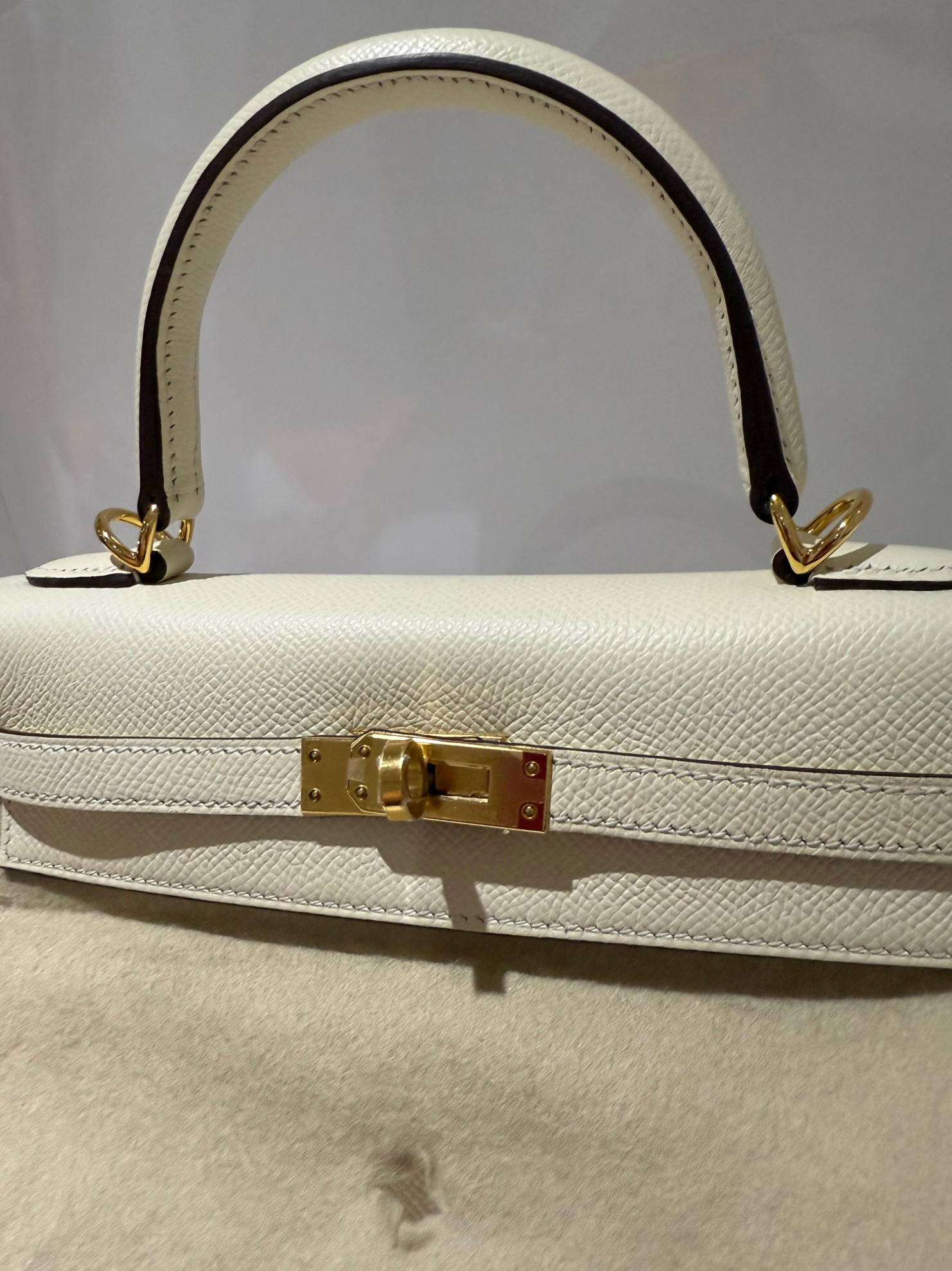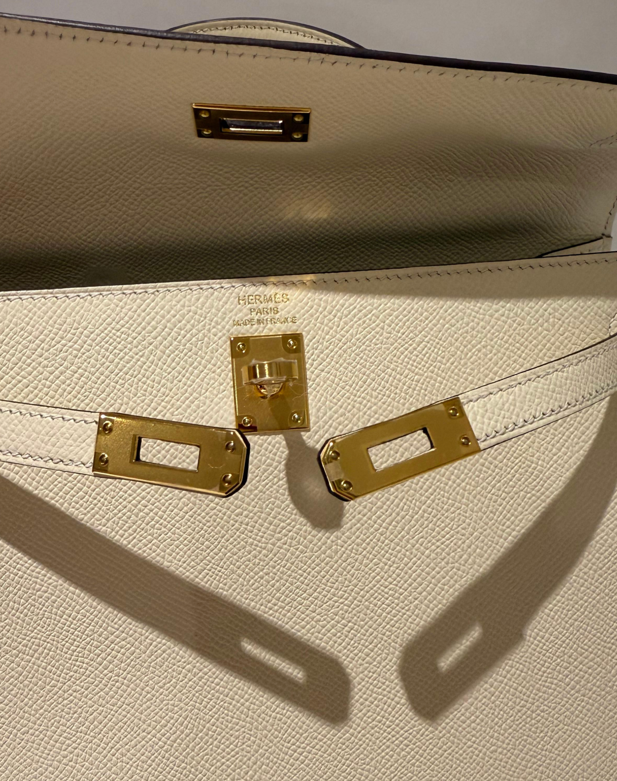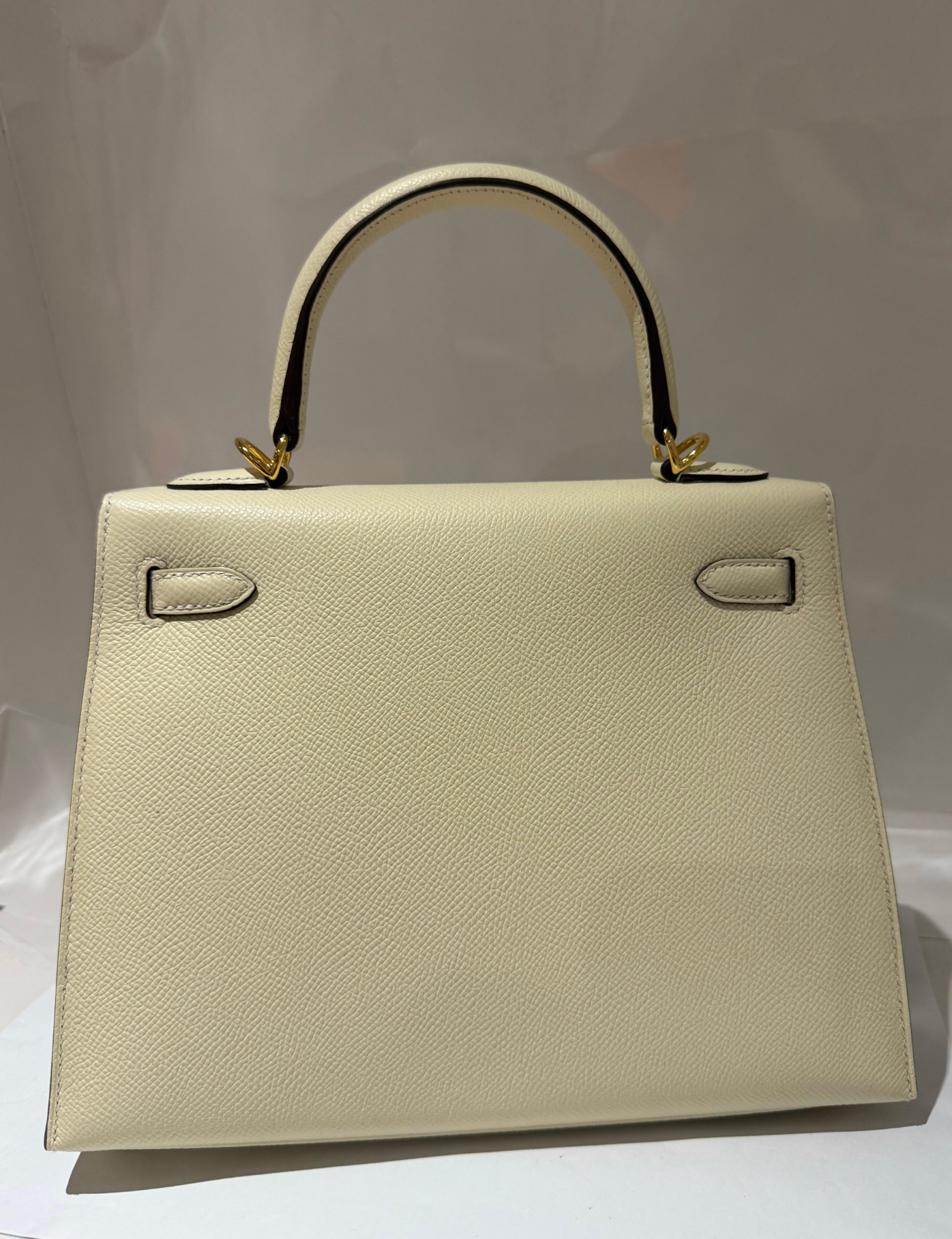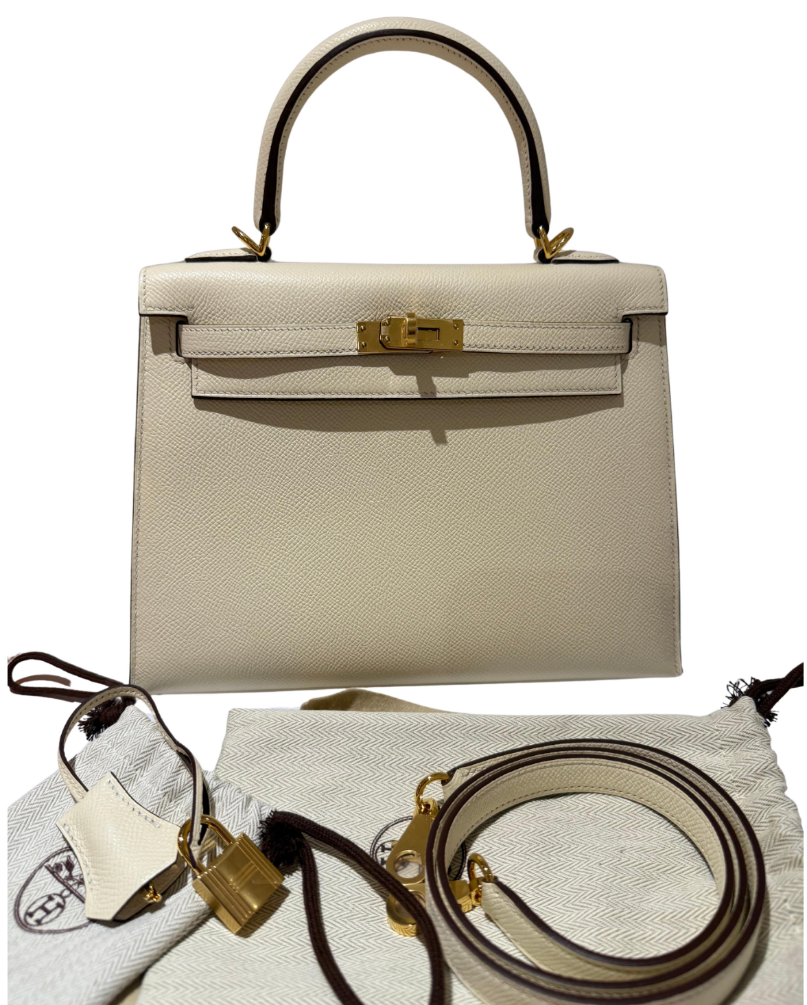 Hermes Kelly 25 Nata colour Epsom leather with gold hardware bag. All stickers on, in new condition. Comes with everything, box, dustbag, detachable strap, clochette lock and keys, raincover, leather booklet.