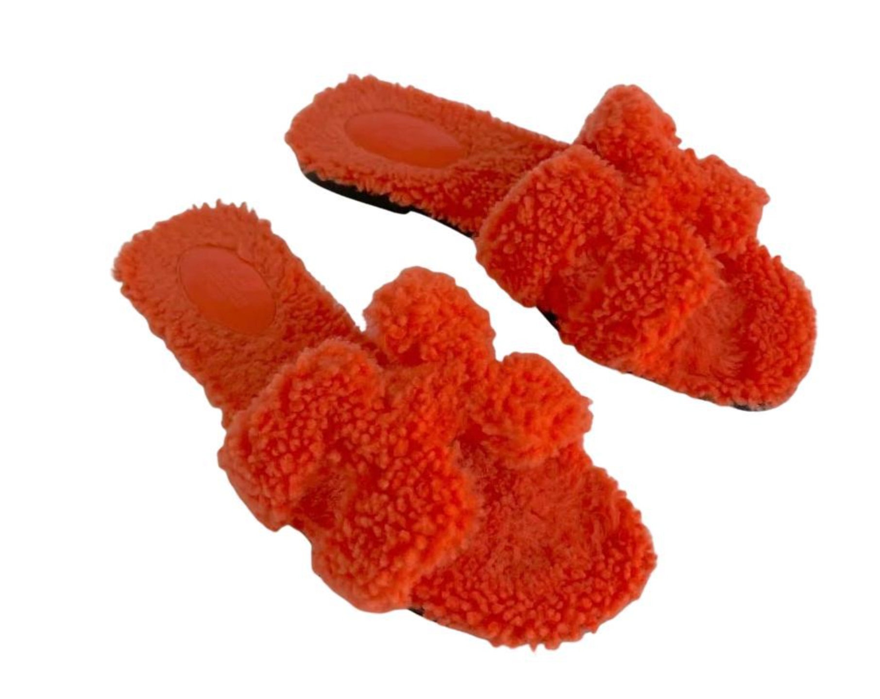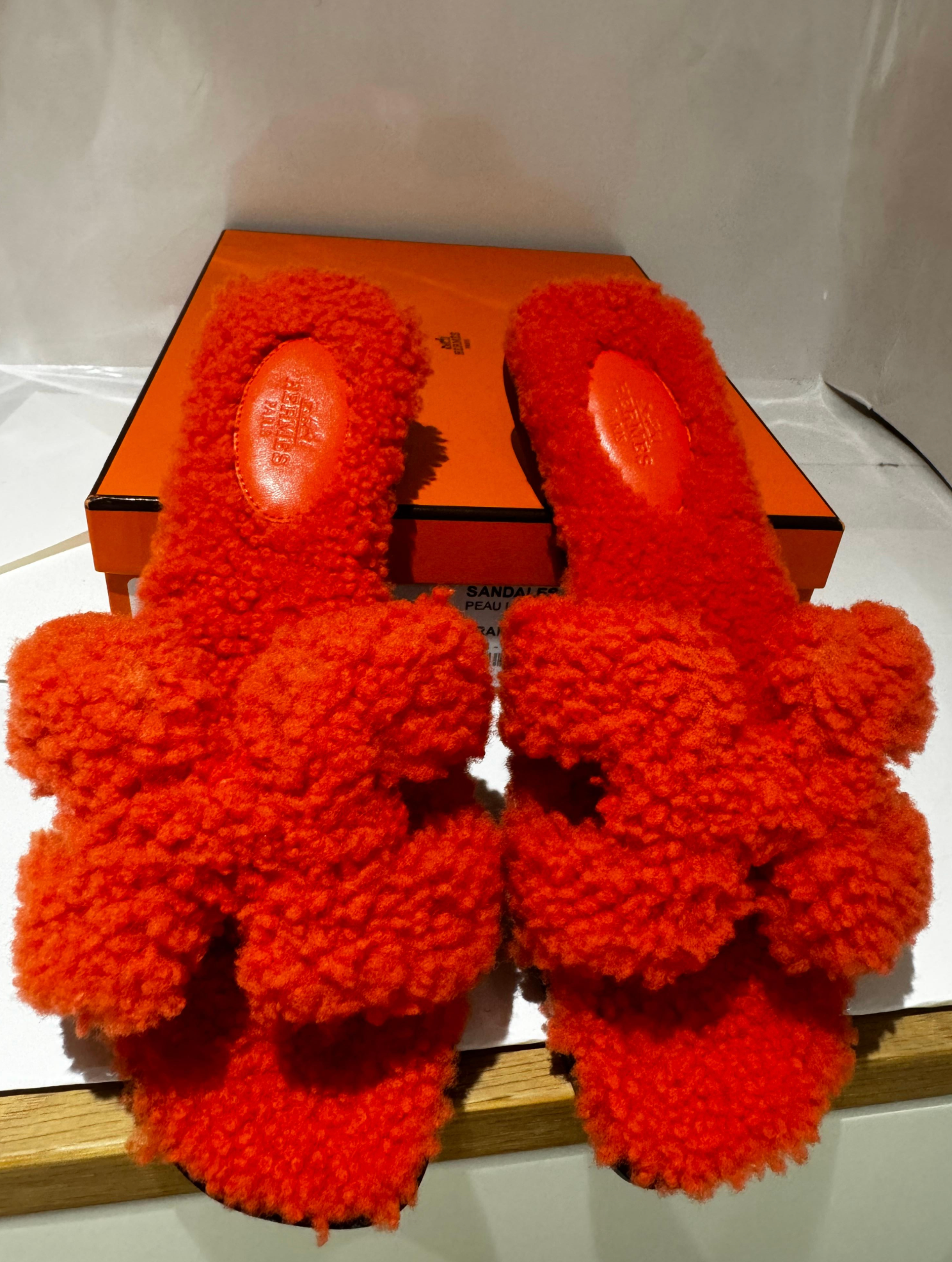 Hermes Oran Sandals are in Orange Shearling and feature the iconic H crossover strap with a black rubber sole. Size 37, with dustbags and box.