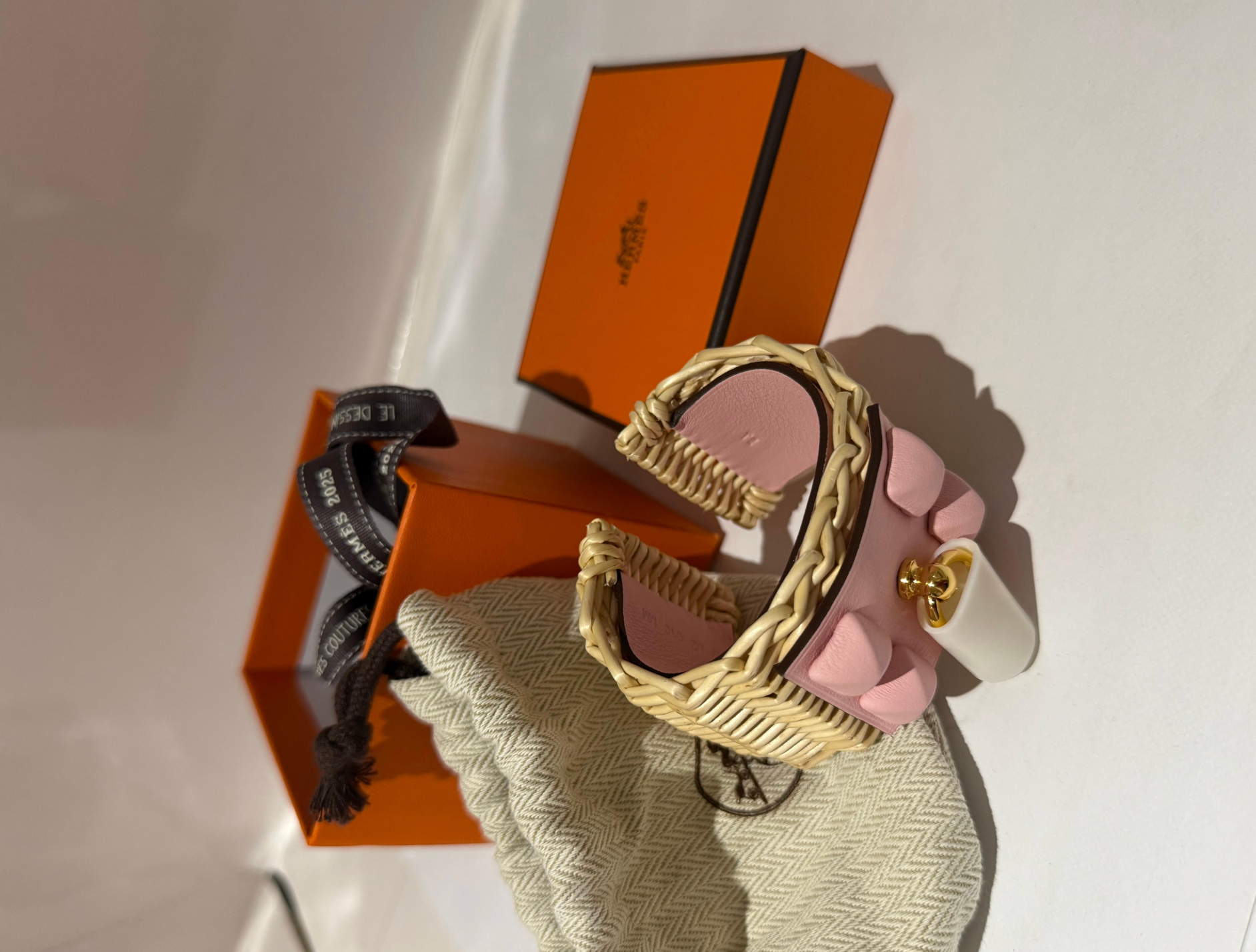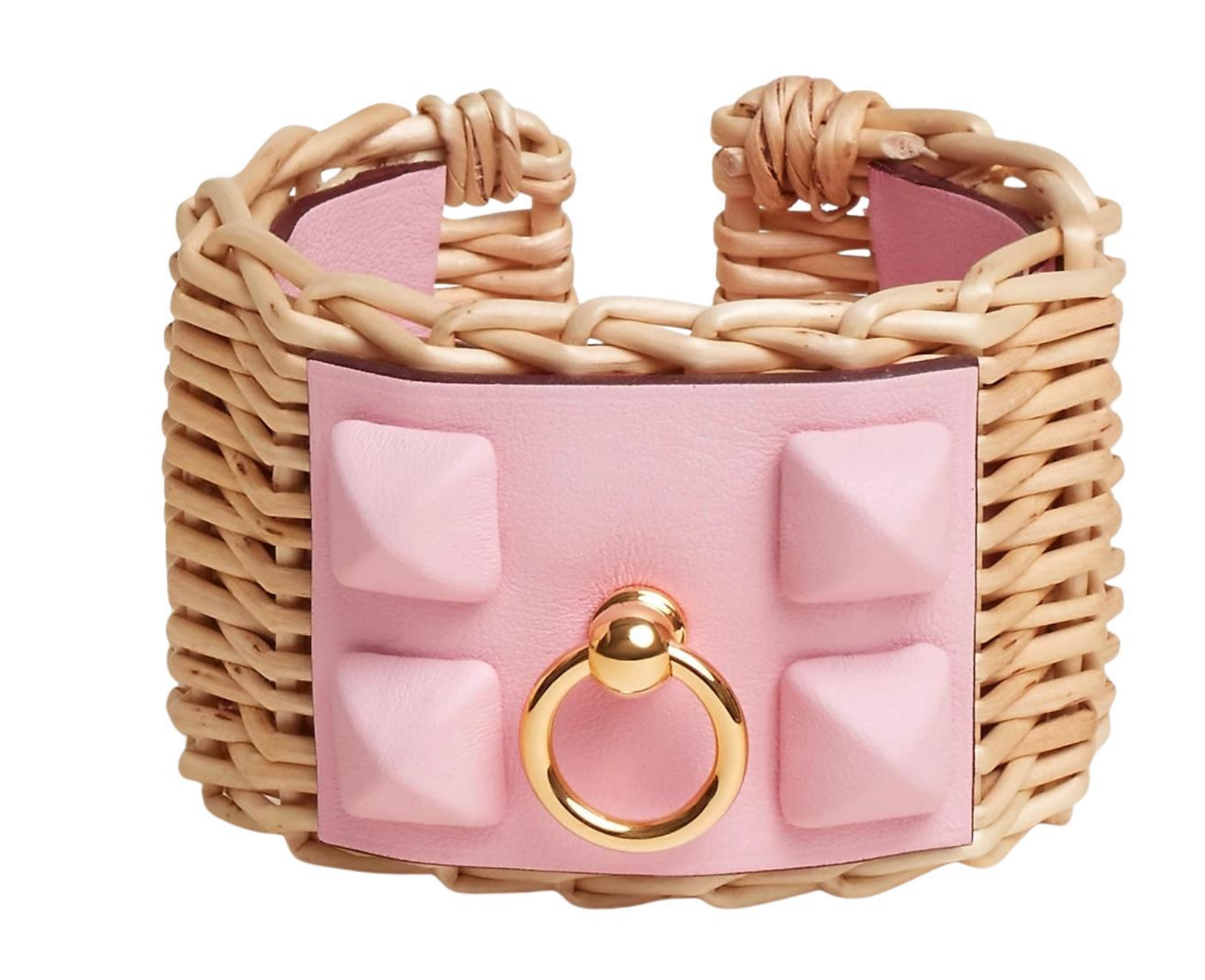Hermes Medor Picnic Pink Sakura cuff bracelet. This Cuff bracelet in Swift calfskin in the most desired Sakura colour. The combination of wicker and leather-sheathed Medor studs give the iconic Medor Picnic line a new summery look.