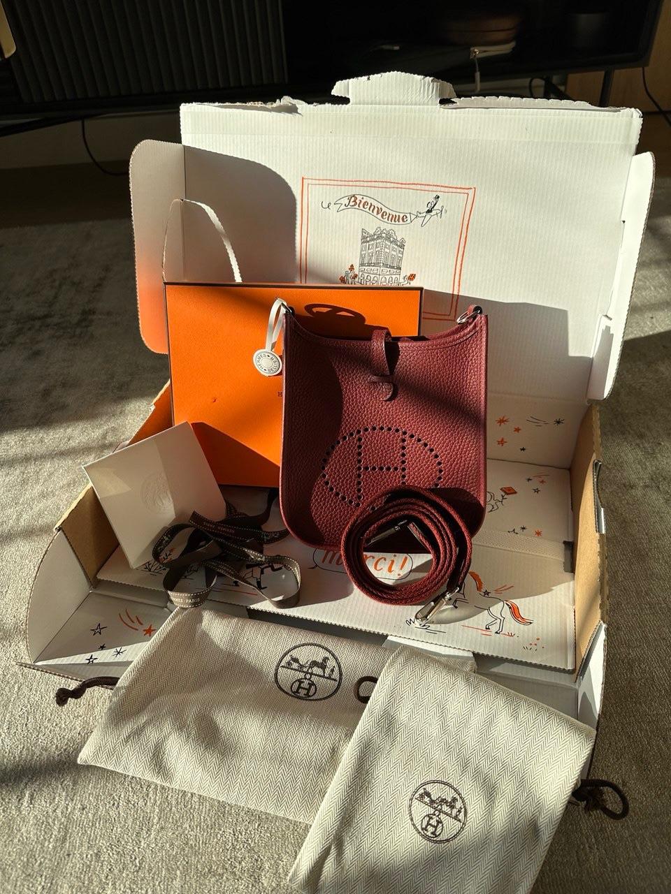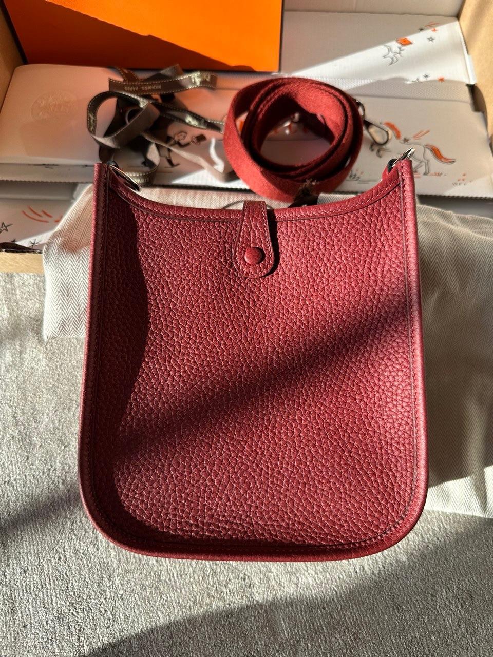 Hermès Évelyne 16 (TPM) in Rouge H with Palladium Hardware – Brand New For sale is a beautiful Hermès Évelyne 16 (TPM) in the iconic Rouge H color, paired with elegant palladium hardware. The bag is brand new, unworn, and was purchased directly online from Hermès. Crafted from high-quality Clemence leather, this model features the signature perforated “H” logo on the front, an adjustable canvas shoulder strap for comfortable crossbody wear, and a timeless, minimalist design suitable for both everyday use and special occasions. The deep Rouge H shade looks elegant and classic and can be paired with a variety of outfits. Condition: New, unused Purchase: Directly from the official Hermès online store Authenticity: the invoice from Hermès will be forwarded to the buyer A rare opportunity to acquire a coveted Hermès model in immaculate condition with full proof of purchase.Receipts and order confirmation seen by HEWI