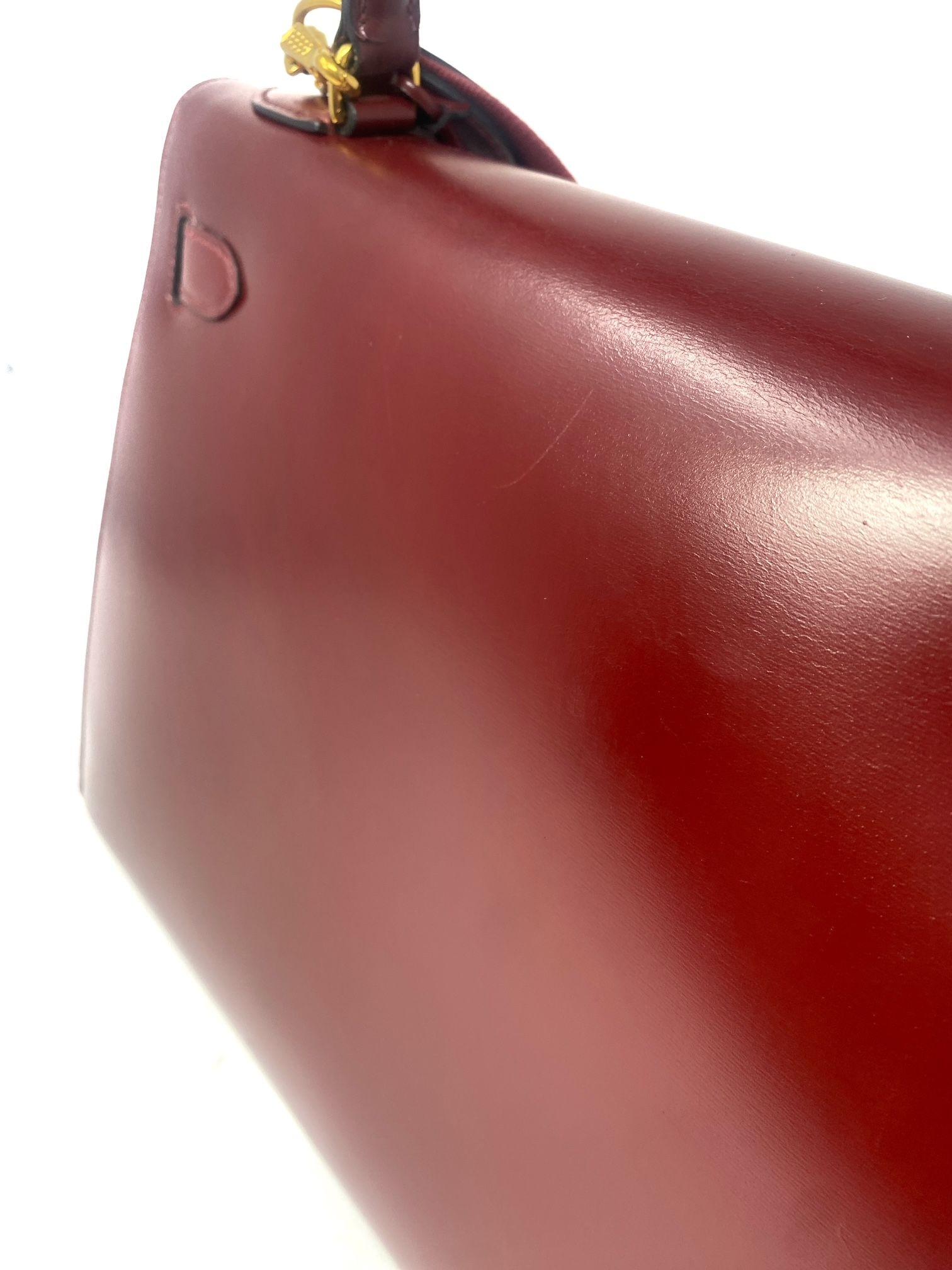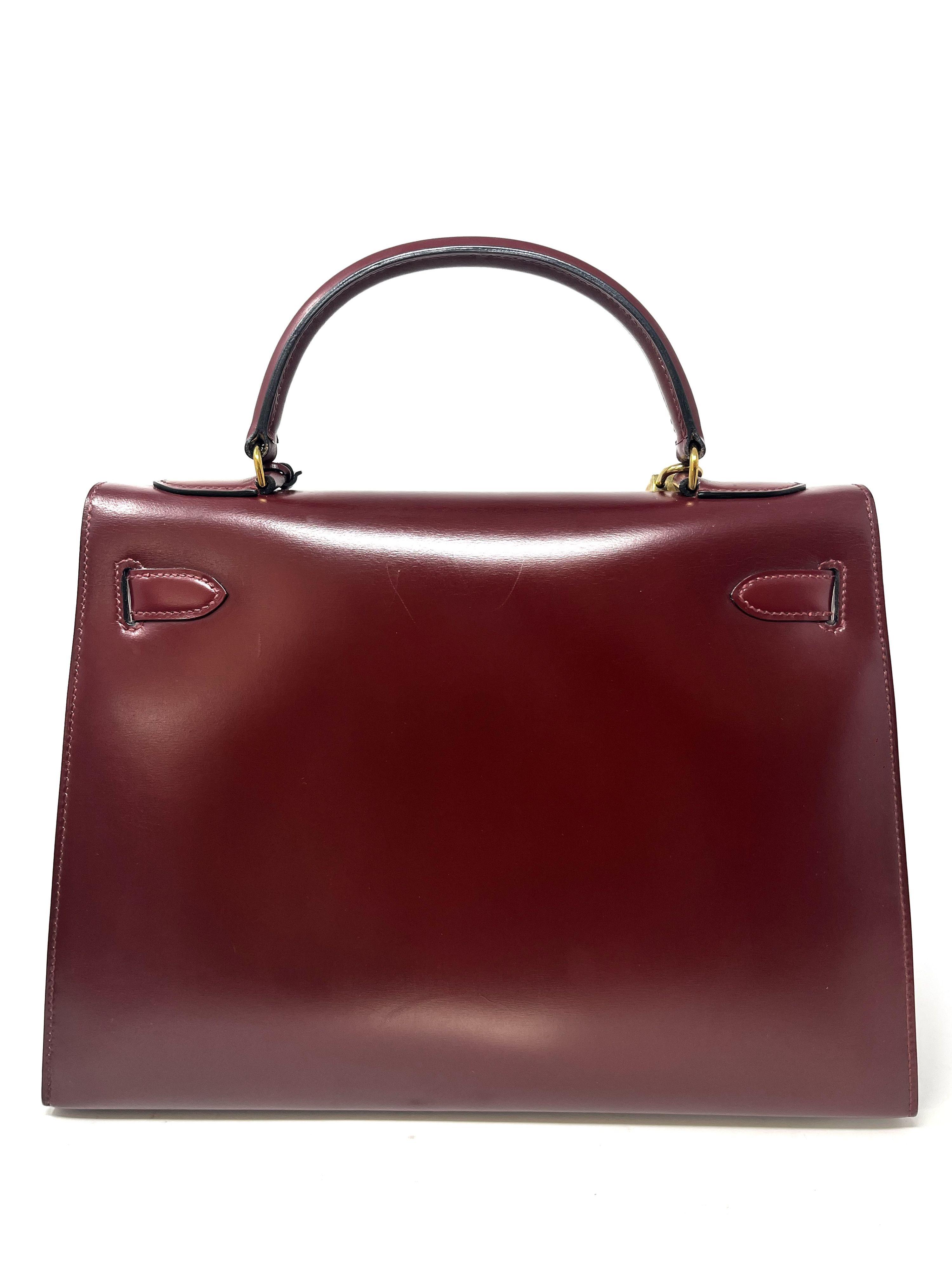 Rare! Lovely Hermes Kelly 32 Sellier bag Rouge H in box leather. A classic deep red / burgundy shade. Comes with padlock, keys, leather bell, cloth strap and authenticity certificate. A vintage gem that can be worn every day