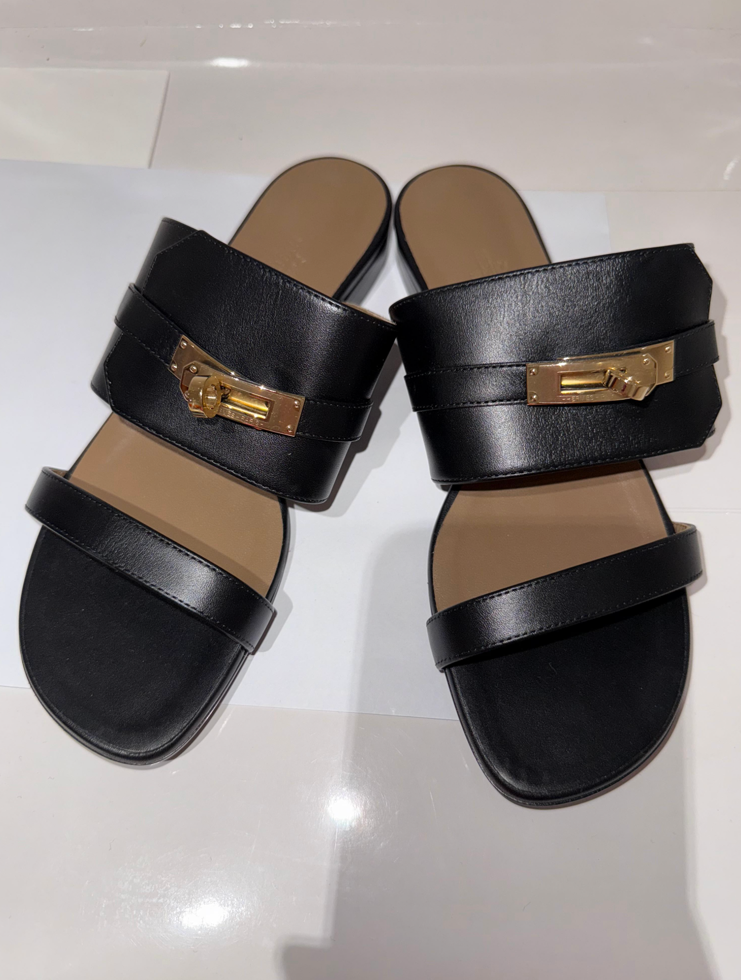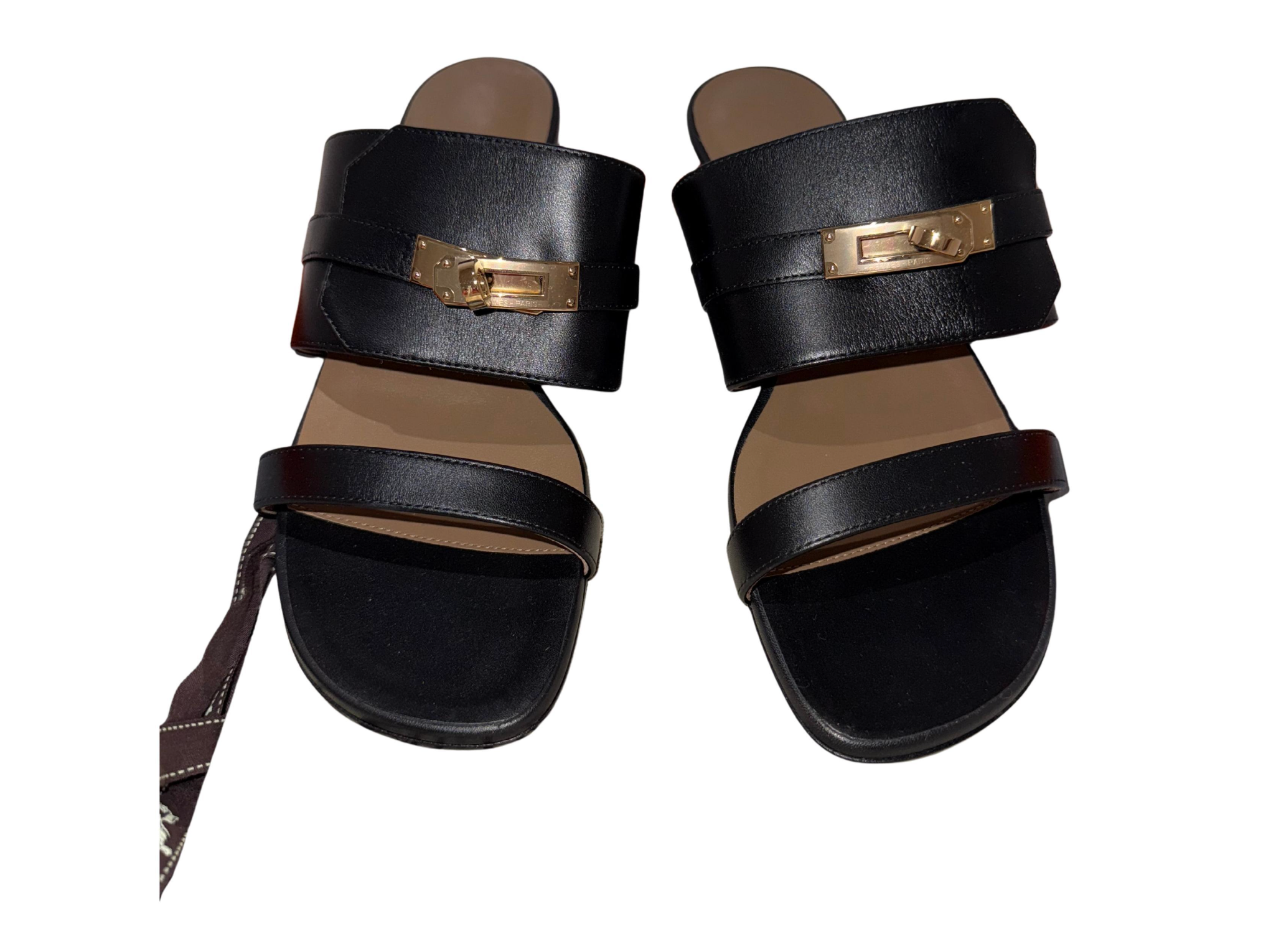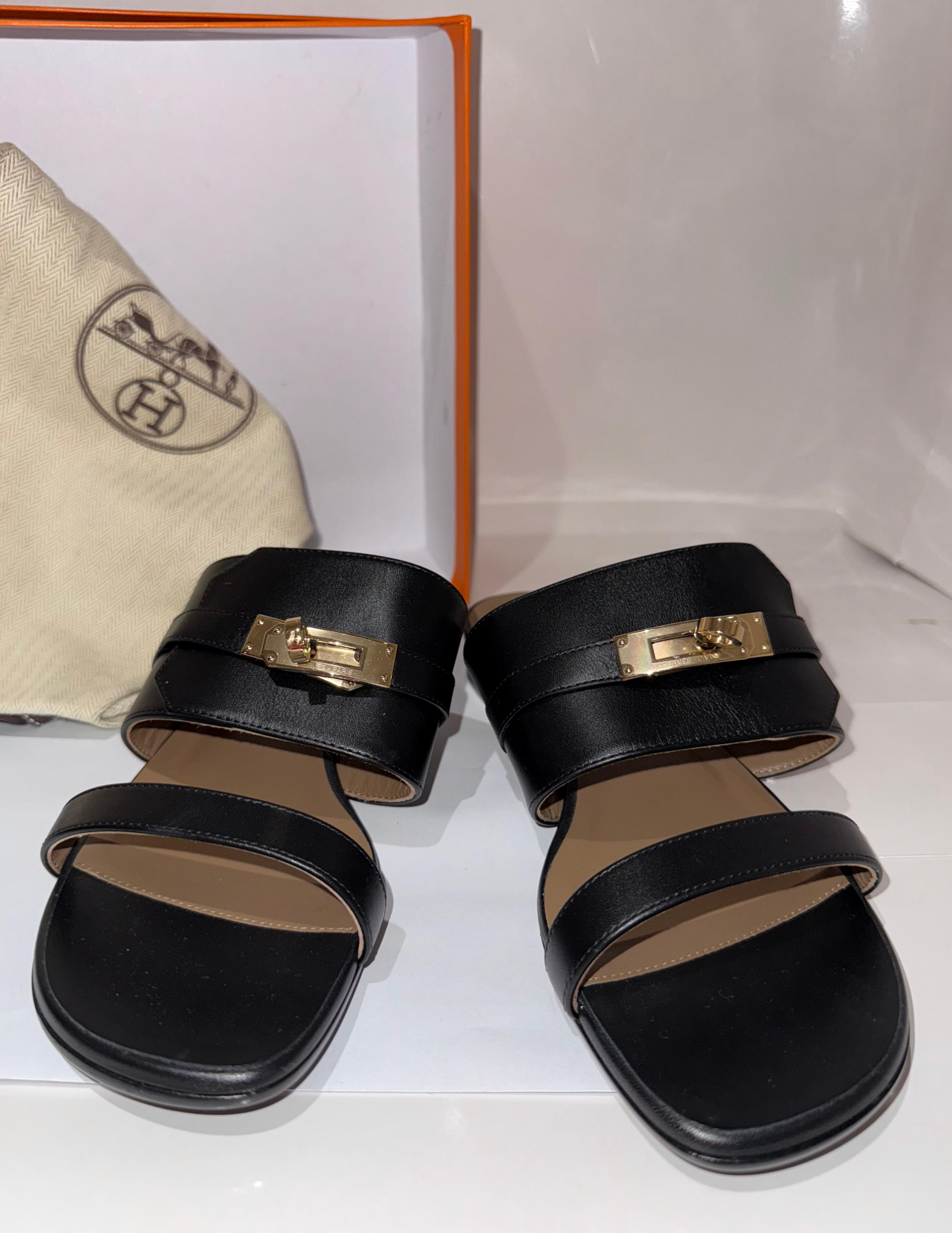 Hermes Avenue Sandal in calfskin with iconic Kelly gold buckle, Size 37. For everyday elegance.