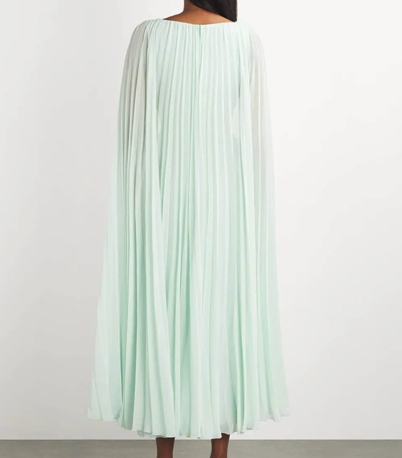 The Huishan Zhang Pleated Beryl Gown is a sophisticated and elegant choice for any occasion. This calf-length gown features a flowing cape that adds a touch of flair to the design. The gown is made of a soft, flowing fabric that is pleated throughout, creating a feminine and flattering silhouette. The pleats gently unravel at the hem, adding a touch of volume to the design. Bespoke alterations are available in-store or at home, within two miles of the Knightsbridge store.
