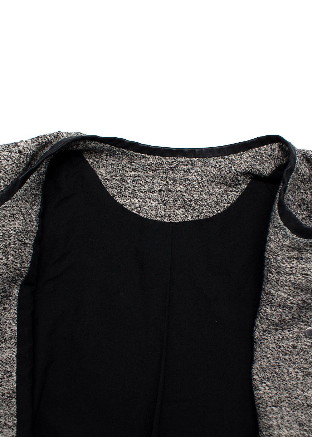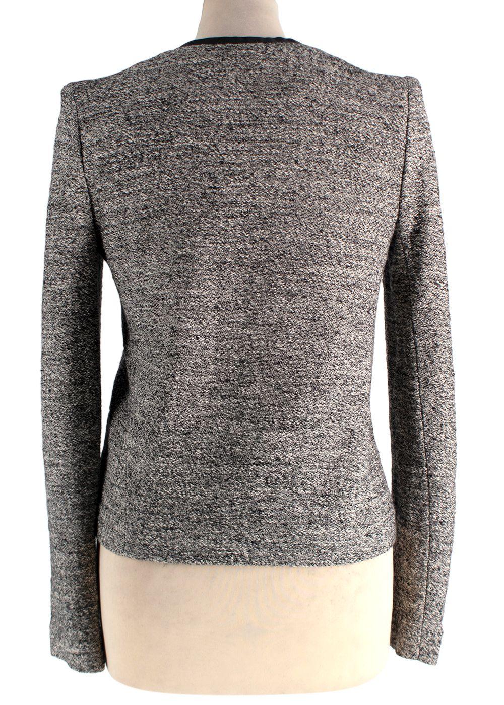 Style: Grey-black textured collarless snap-button jacket / blazer — classic, minimal, modern. The jacket has a round neckline, long sleeves, slim tailored lines; the front closes with concealed or minimal snap buttons, giving a clean silhouette. The fabric appears to be a mid-weight textured tweed or knit-blend. Inside is black lining, and the trim around the neckline and front opening is finished in a smooth black fabric (possibly faux leather or satin-like binding). The piece leans toward a structured lightweight jacket — ideal for transitional seasons (fall, spring) or layering.
