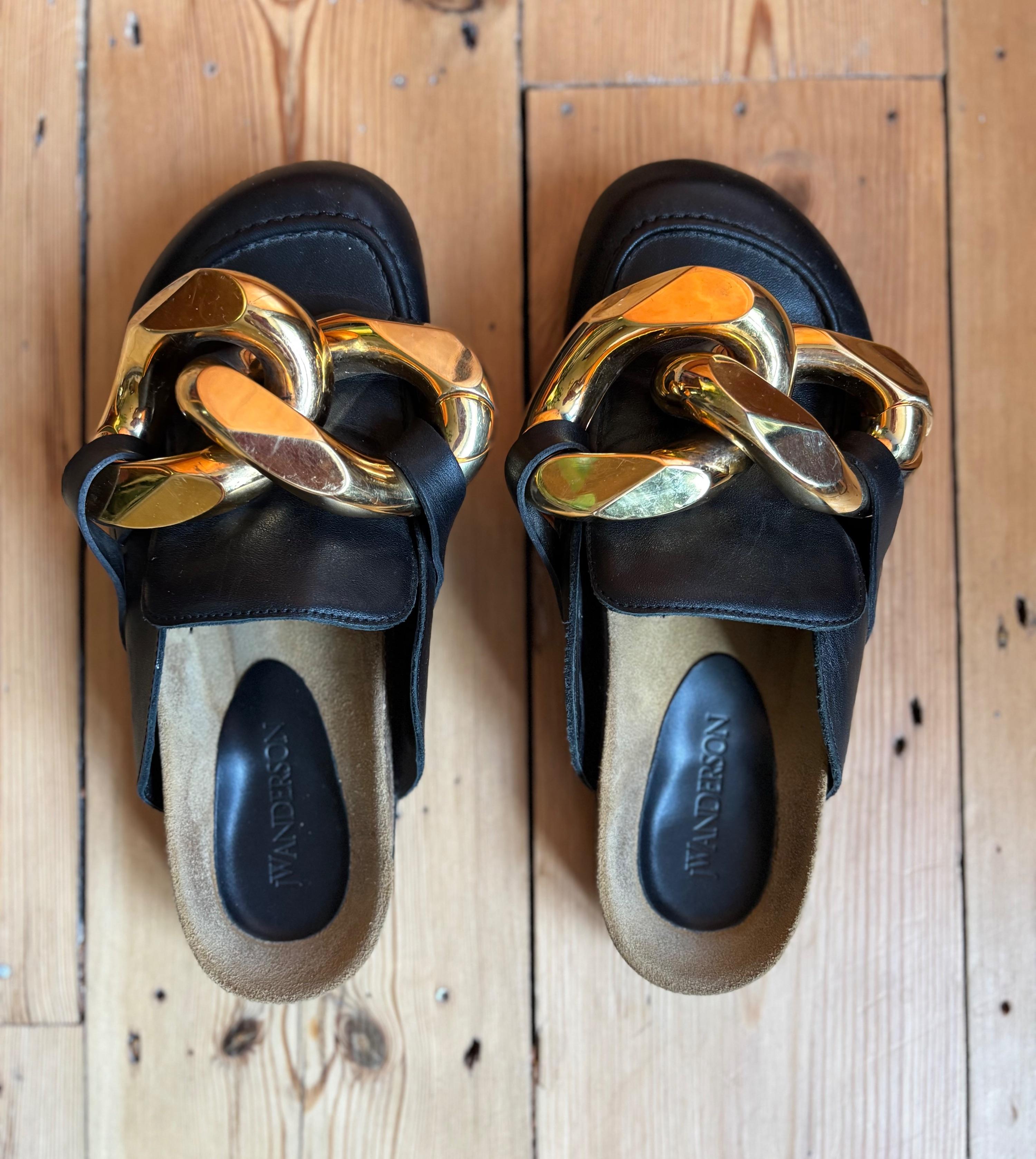 JW Anderson's iconic chain mules. Never break the chain. You won't be breaking your chain of impeccable outfits once these black calf leather Chain loafer mules from JW Anderson are thrown into the mix. You've got style!