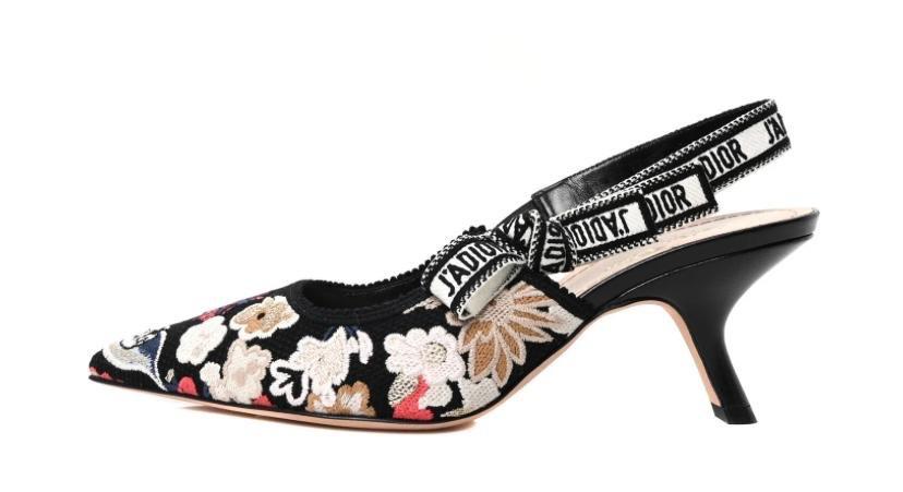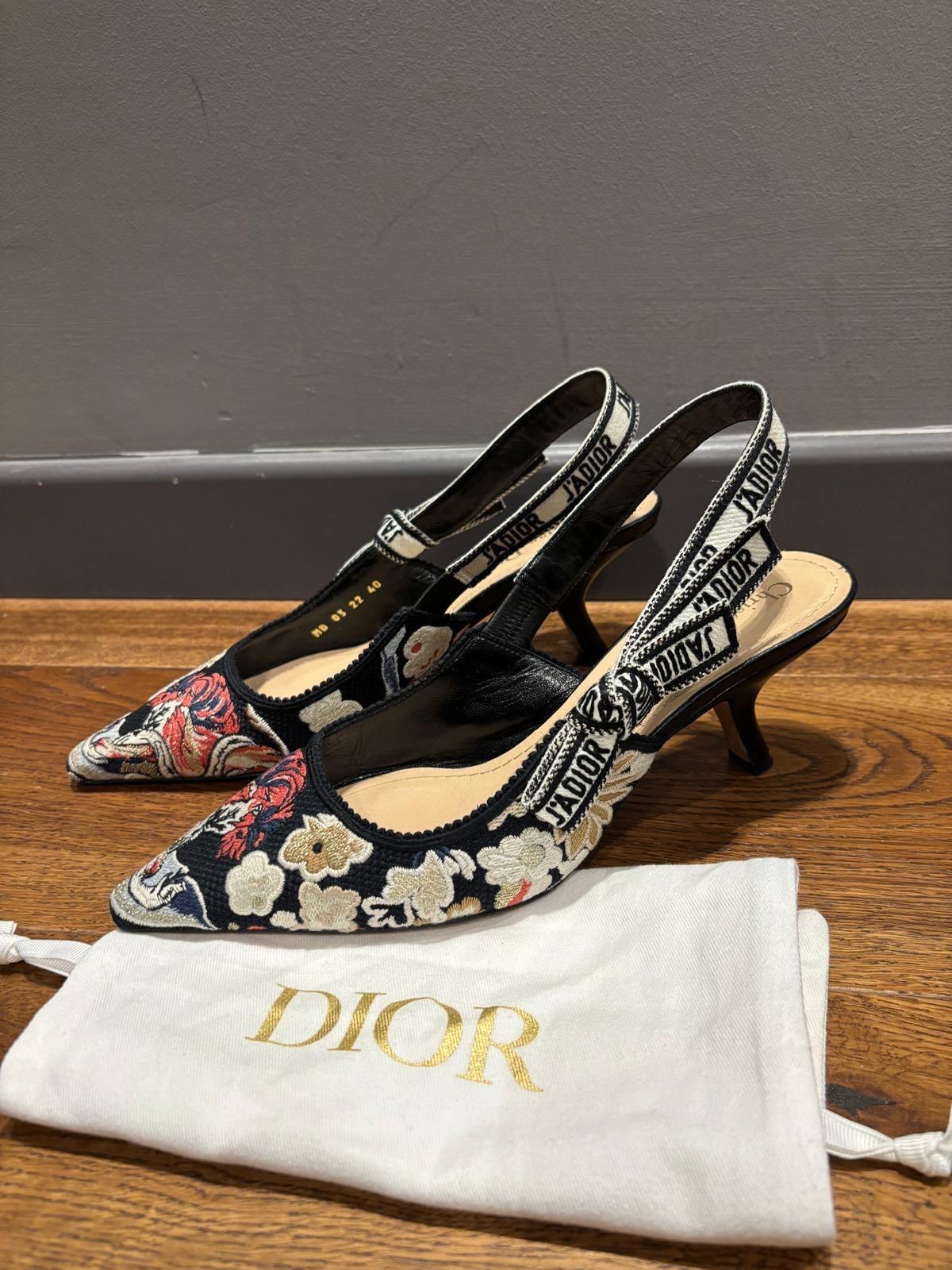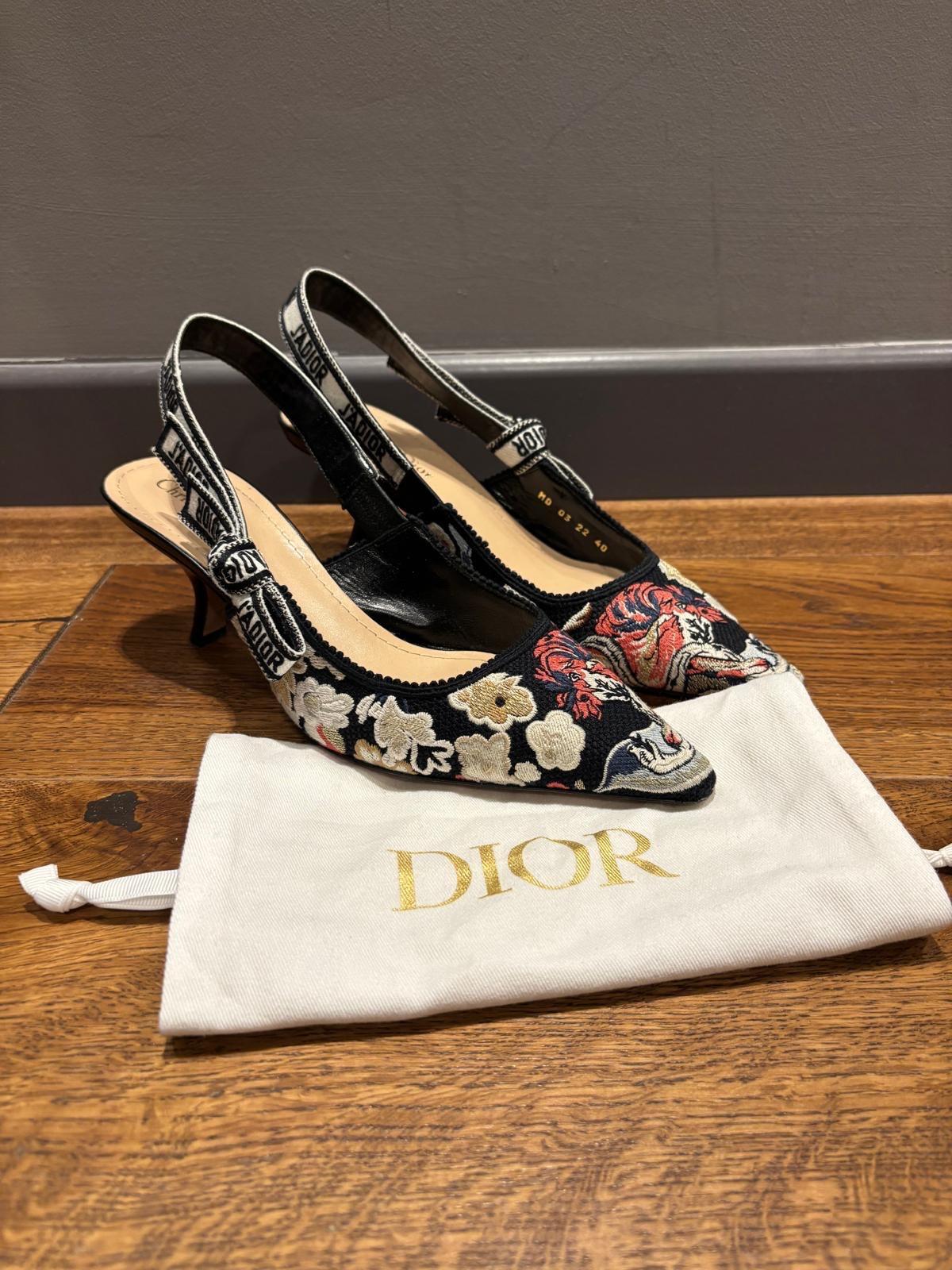 Christian Dior J'Adior slingback heels in black with intricate floral and tiger embroidery. Features the 'J'Adior' logo on the strap and a kitten heel. Made in Italy. Visible signs of wear on the soles and insoles.