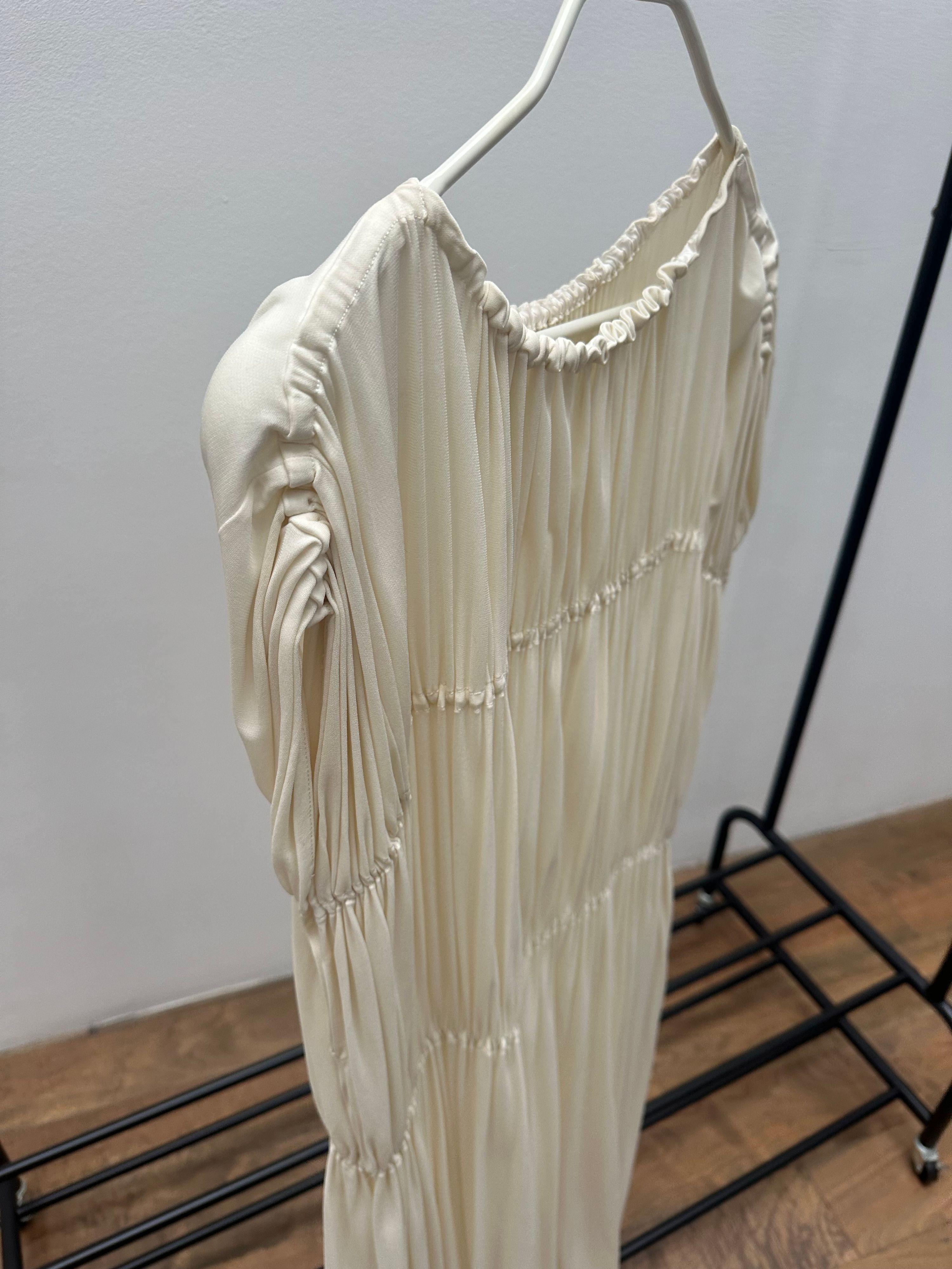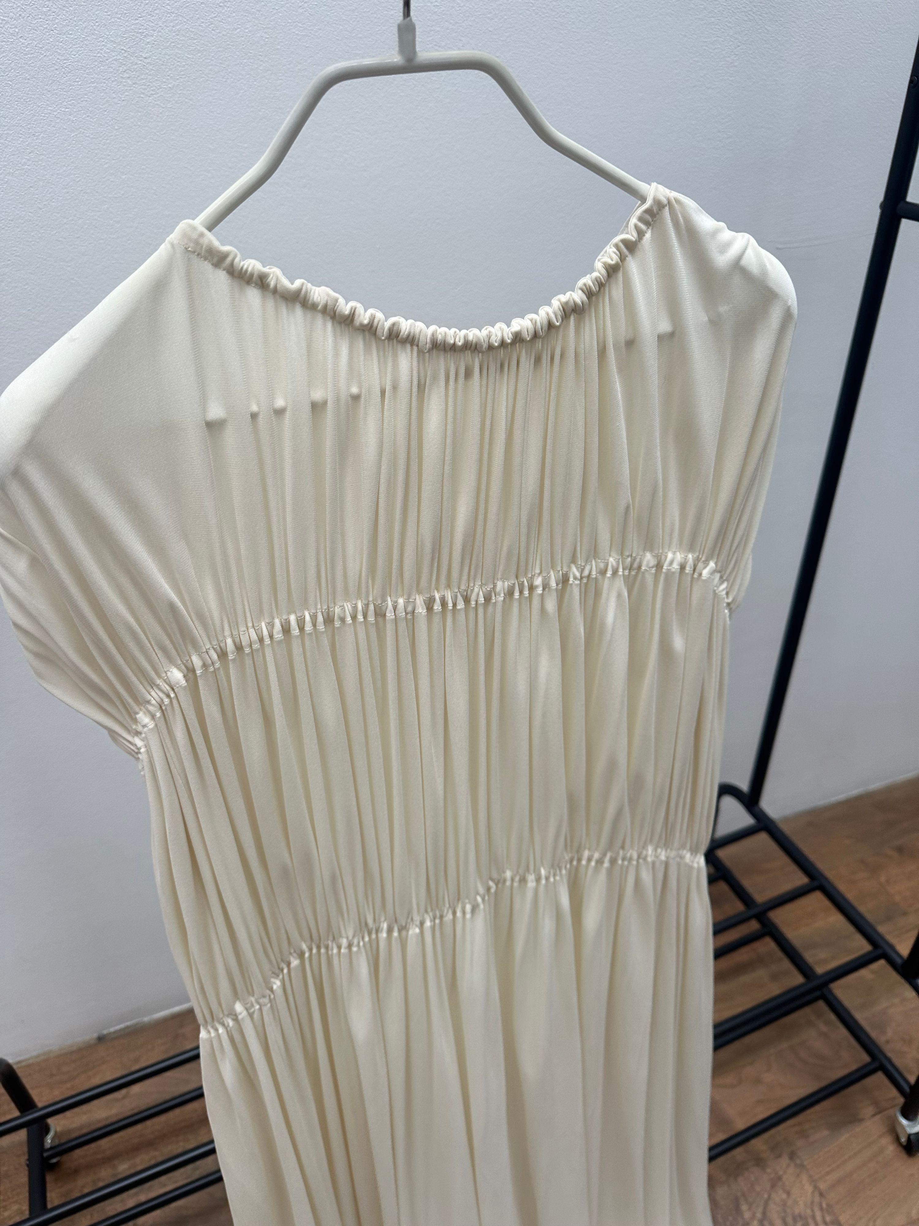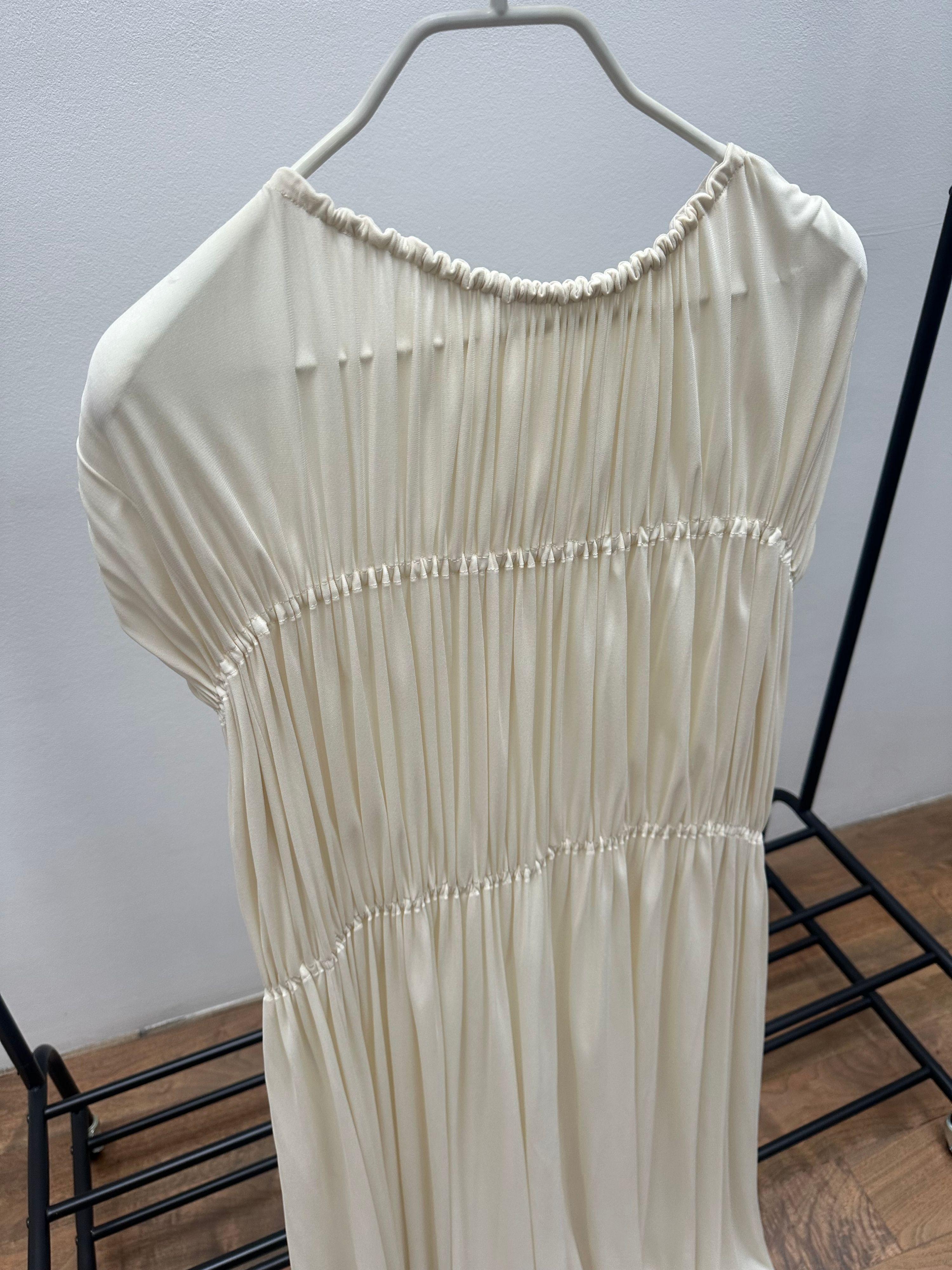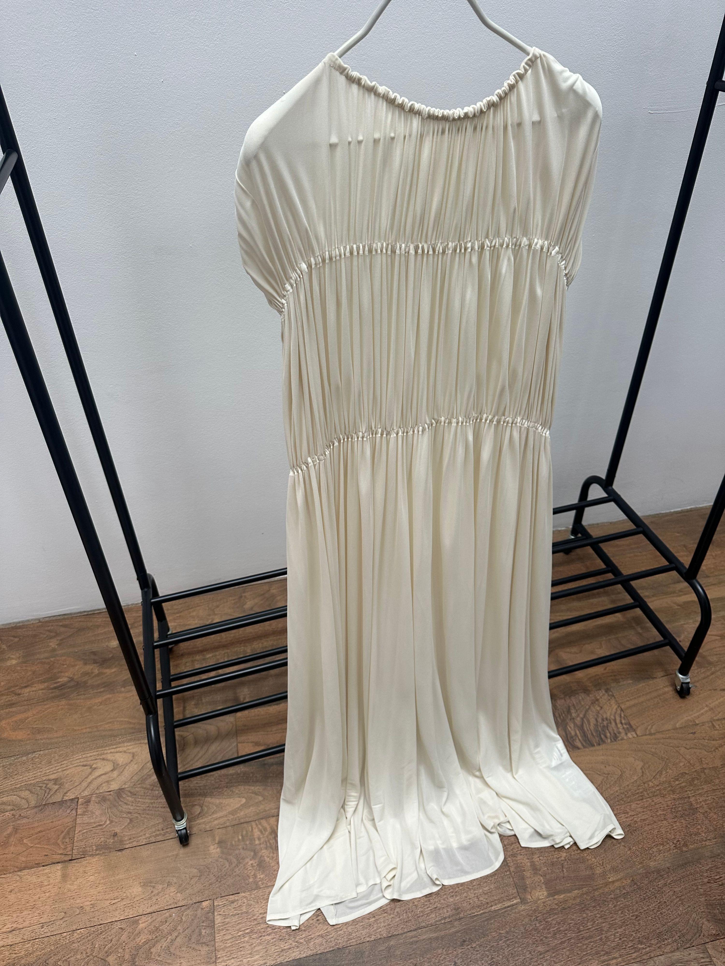 “For a minimalist look with maximum impact, consider this white midi dress from Jil Sander. Fully pleated throughout, it's ruched through the shoulder seams, bodice and waist to create a fluid silhouette with natural movement. Style with a pair of the label's flat sandals for contemporary elegance.
