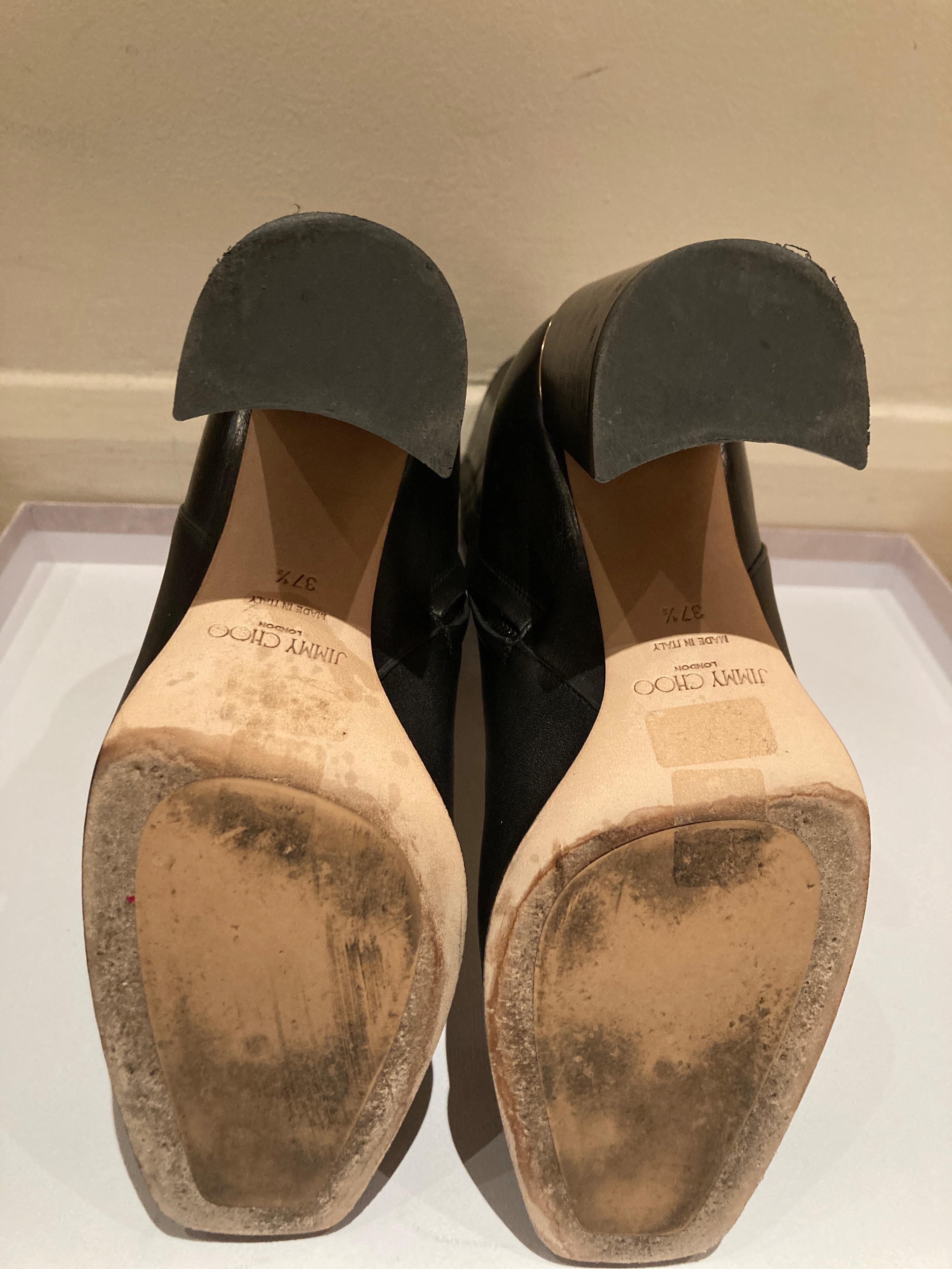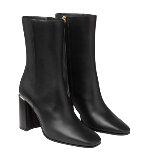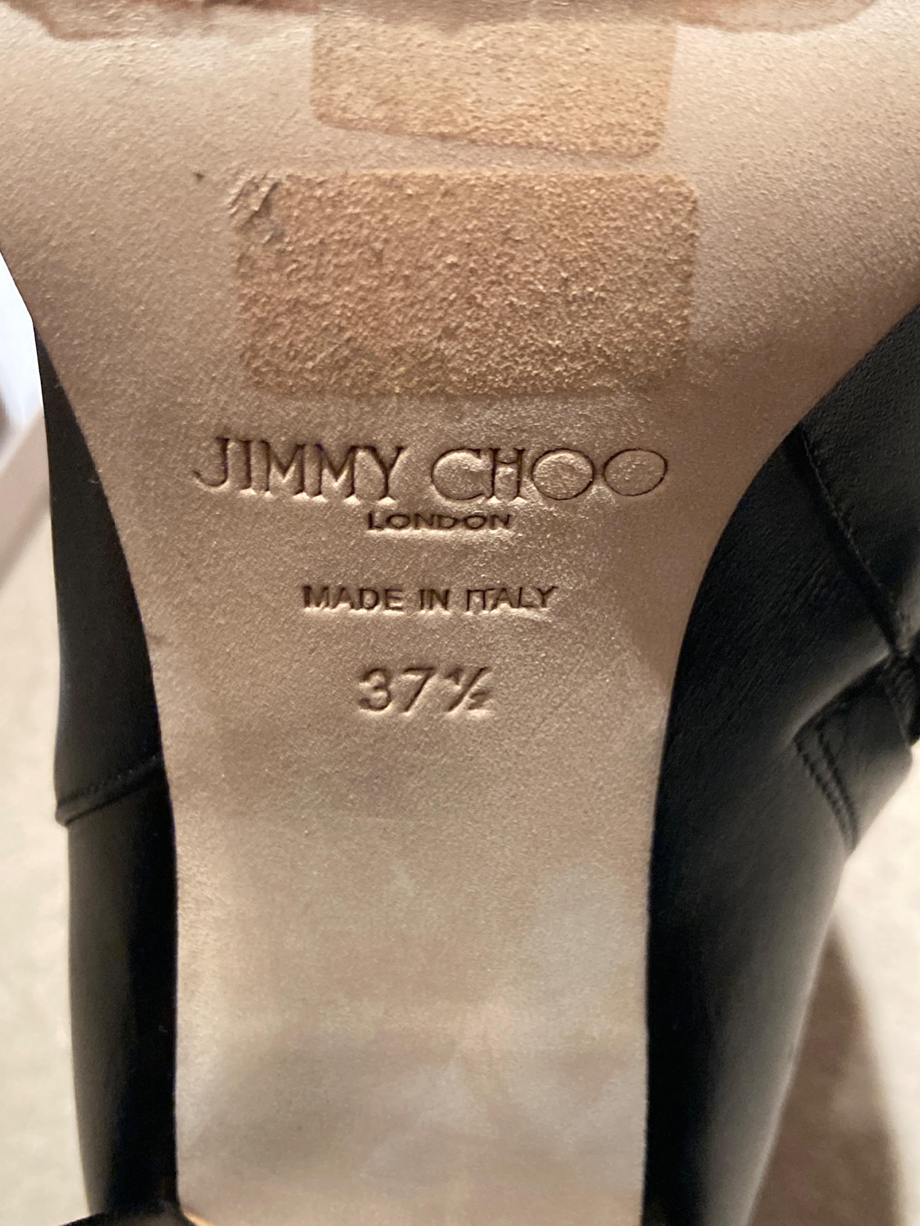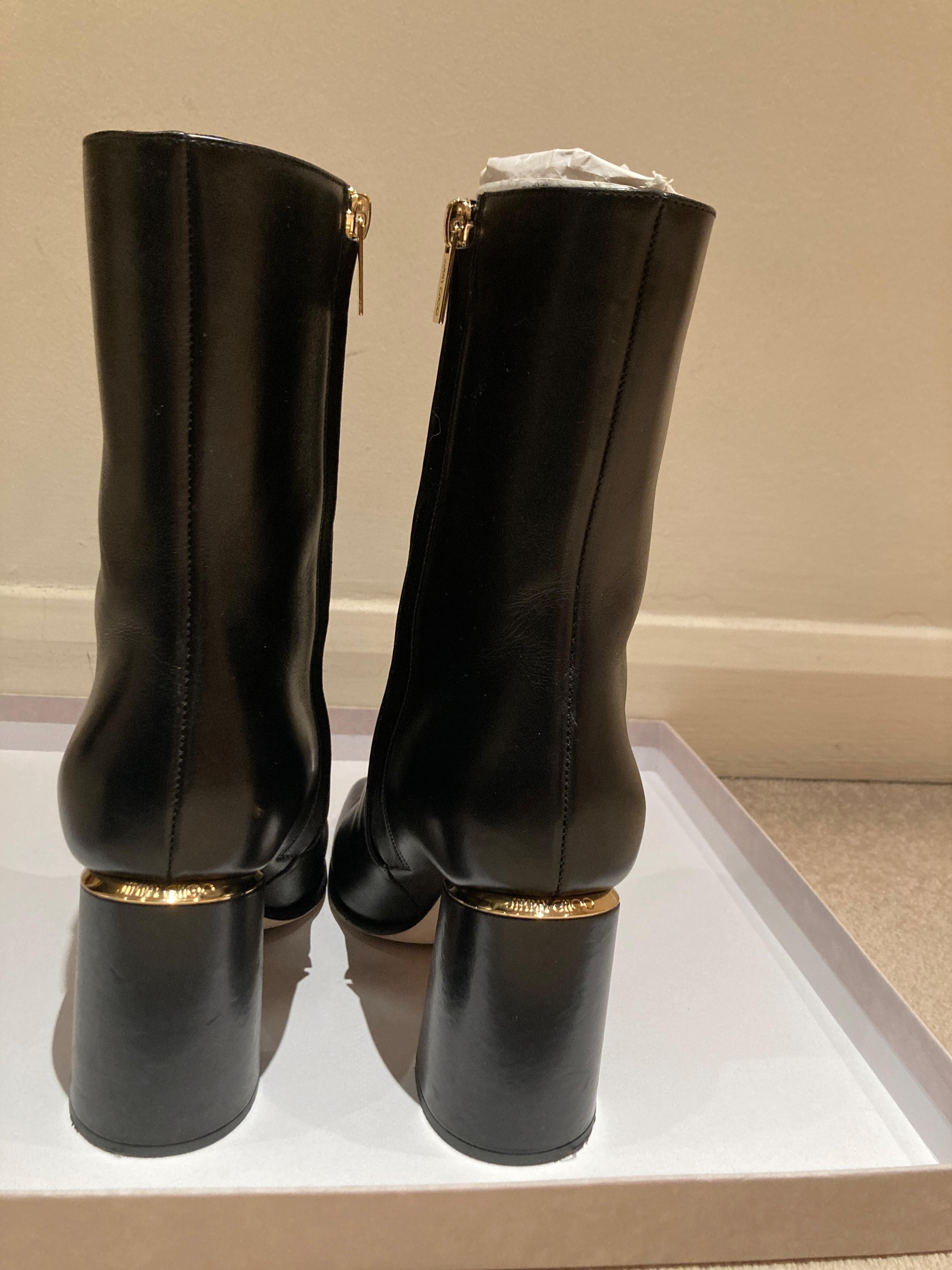 The Jimmy Choo Loren Ankle Boots are crafted of calf leather with gold-tone hardware. These boots feature tonal stitching, an engraved logo, an almond toe, a side zip fastening, a branded insole, and a leather sole. These high heel boots have an 85mm block heel. Image 1 is a screenshot