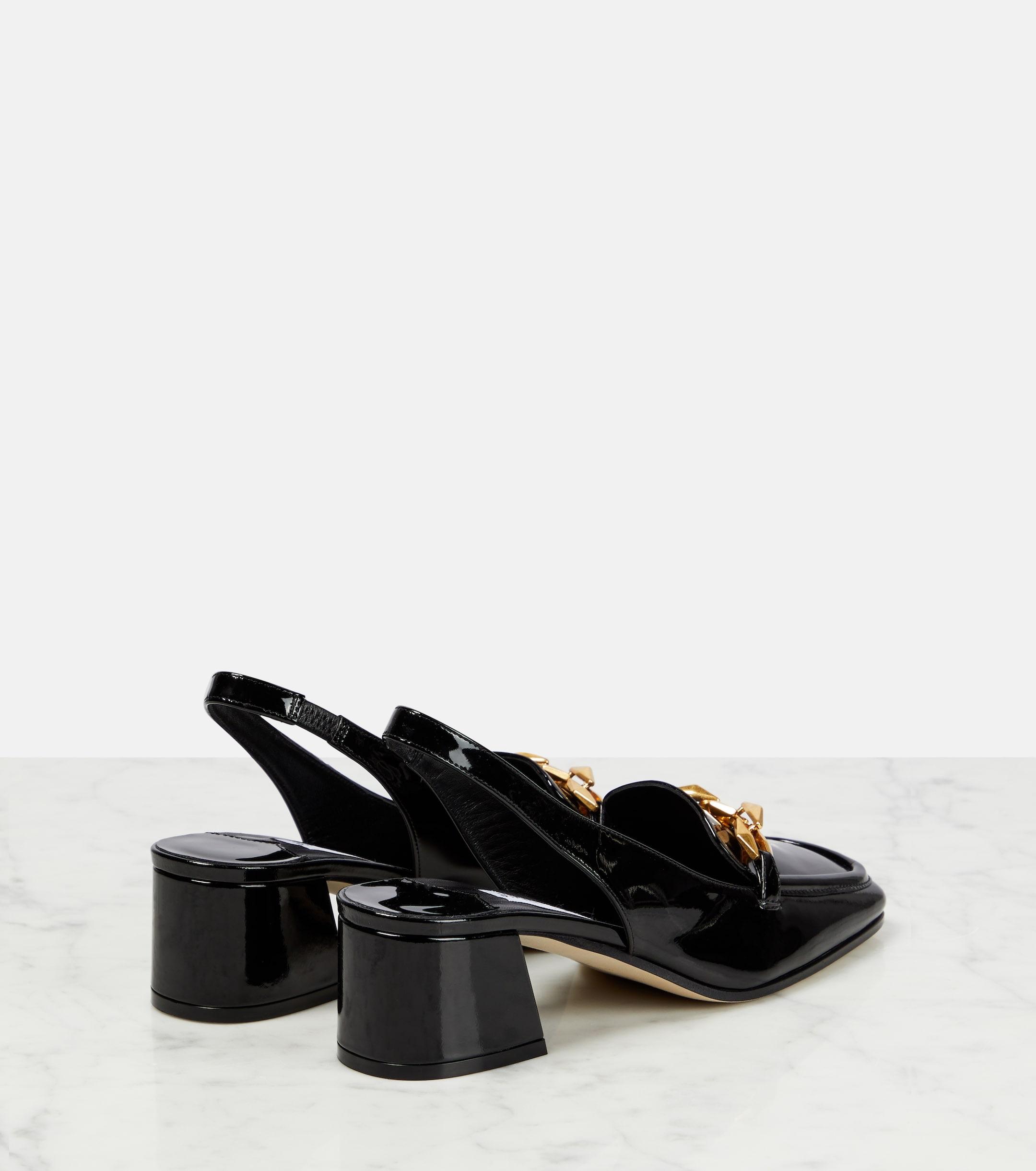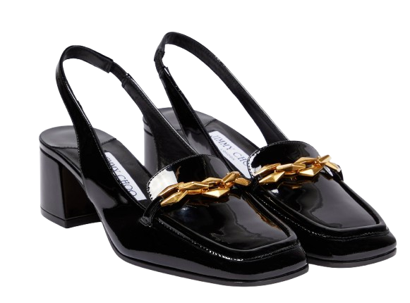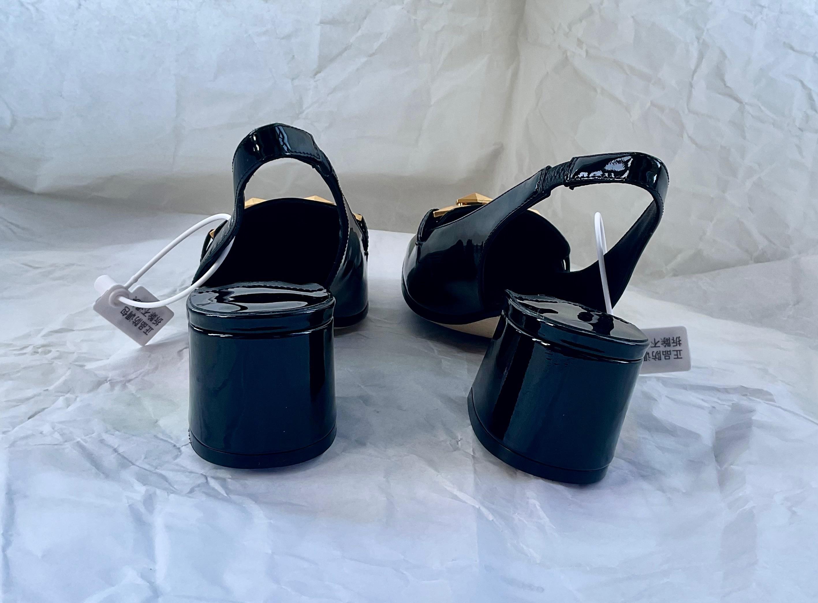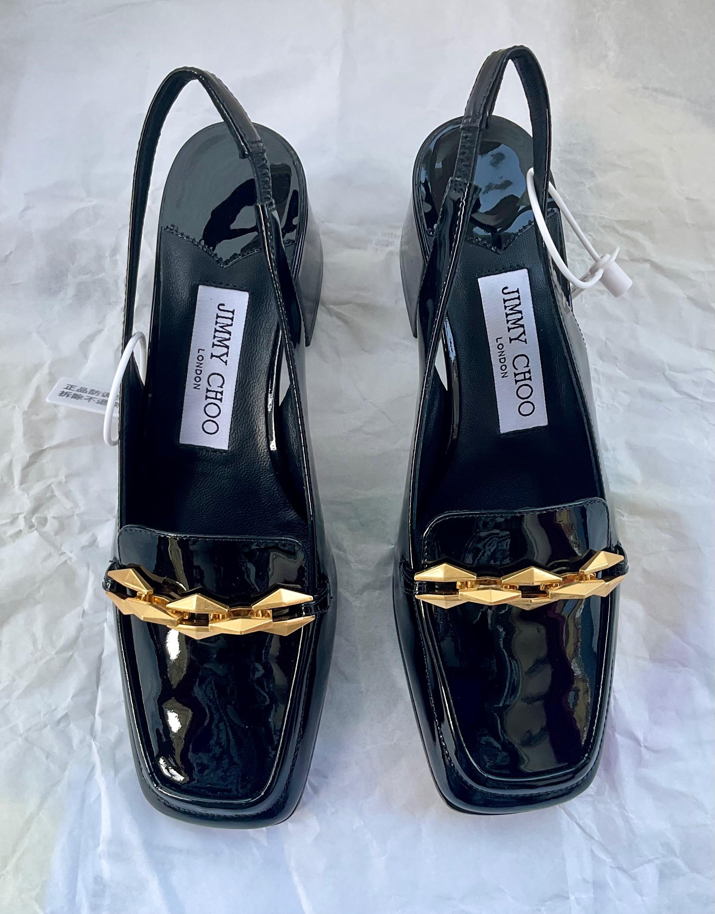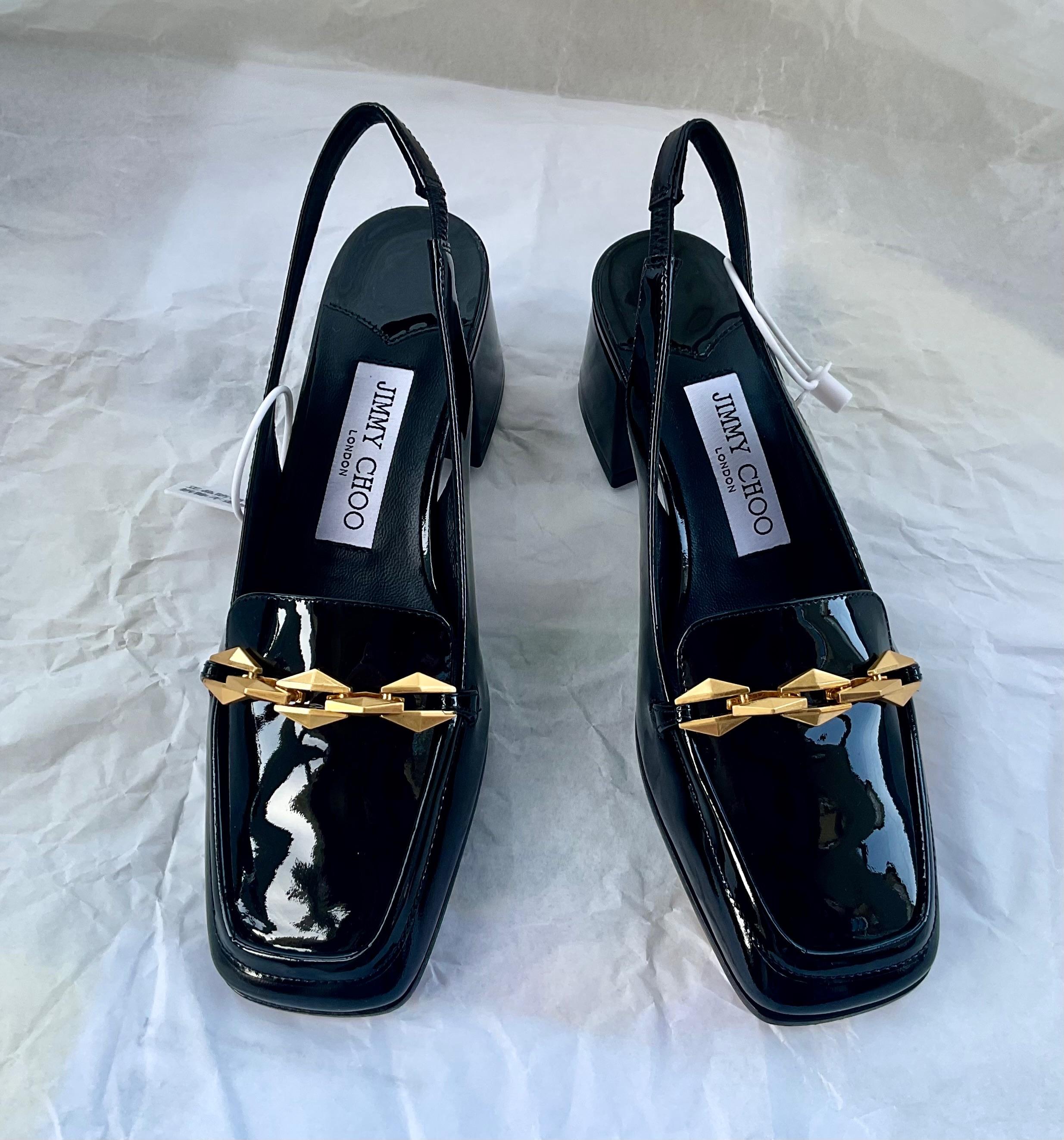 Brand new immaculate Jimmy Choo Tilda 45 sling backs in black patent leather with gold chain. Current season retails for £695. Size 36. No box or dust bags.