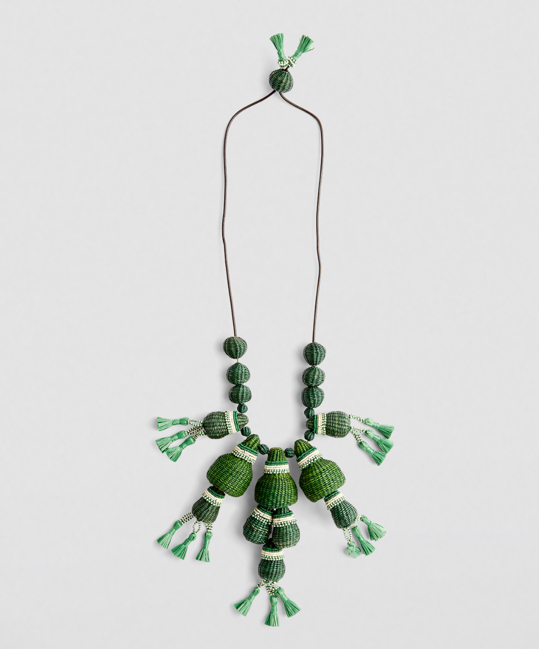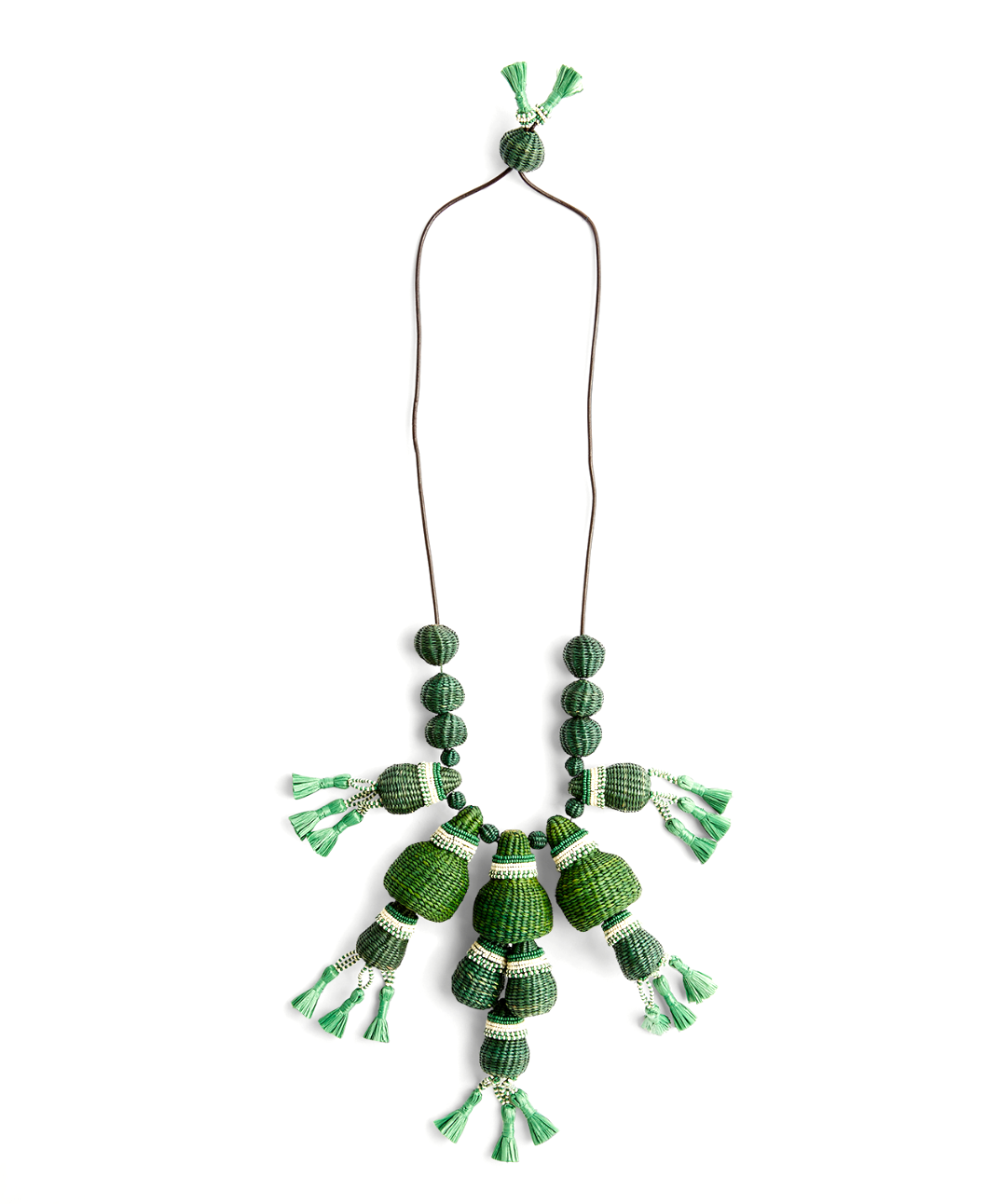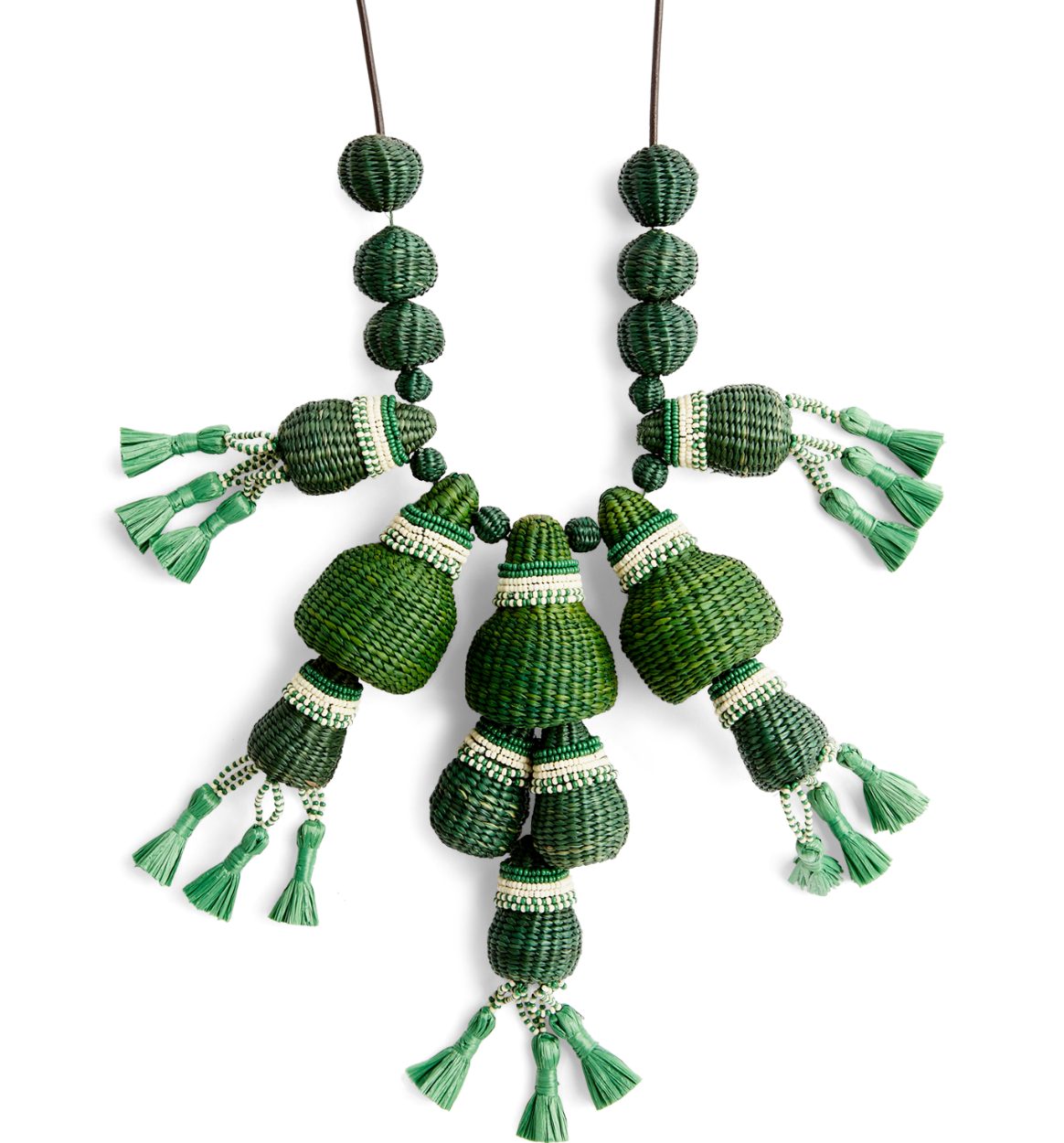The necklace features a series of hand-woven, textured green baubles and elongated drop elements, accented with contrasting cream/white beaded bands. The design is finished with multiple silk or fabric tassels at the ends of the pendant-like sections. This style is characteristic of Ortiz's jewelry, which often incorporates traditional Colombian weaving techniques and bohemian aesthetics