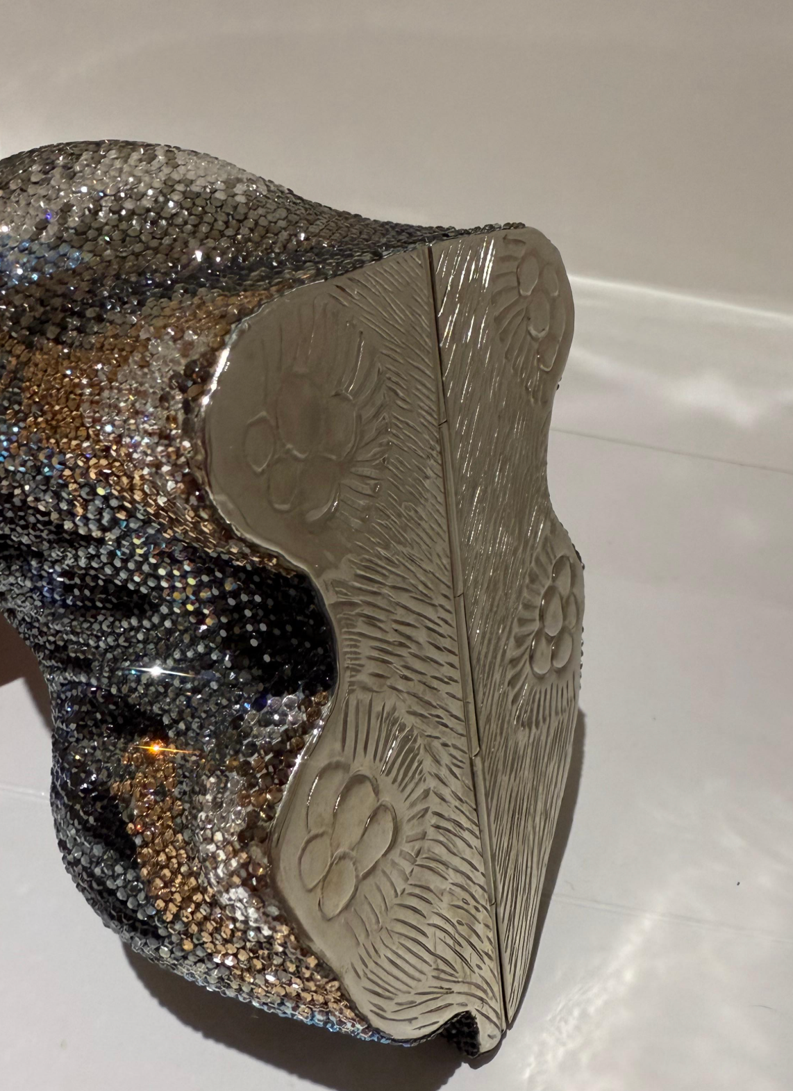 JUDITH LEIBER Crystal Terrier Minaudiere Clutch in Multicolor. This petite clutch is entirely covered in crystals with a hard silver shell, in the shape of an adorable dog. This clutch opens to an interior of metallic silver leather with a thin silver chain.