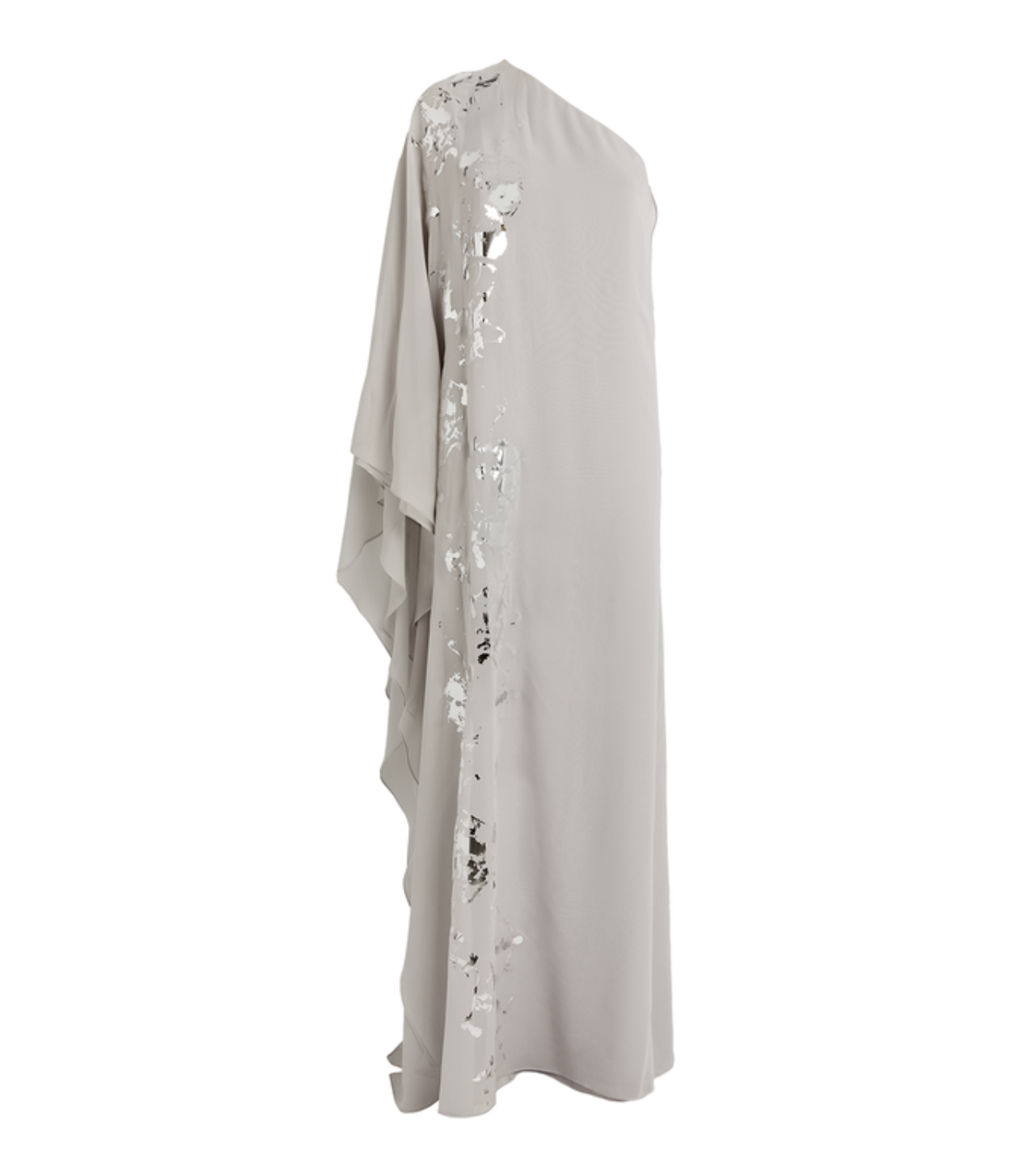 Kolston Metallic Foiled One-Shoulder Silk Chiffon Caftan Gown