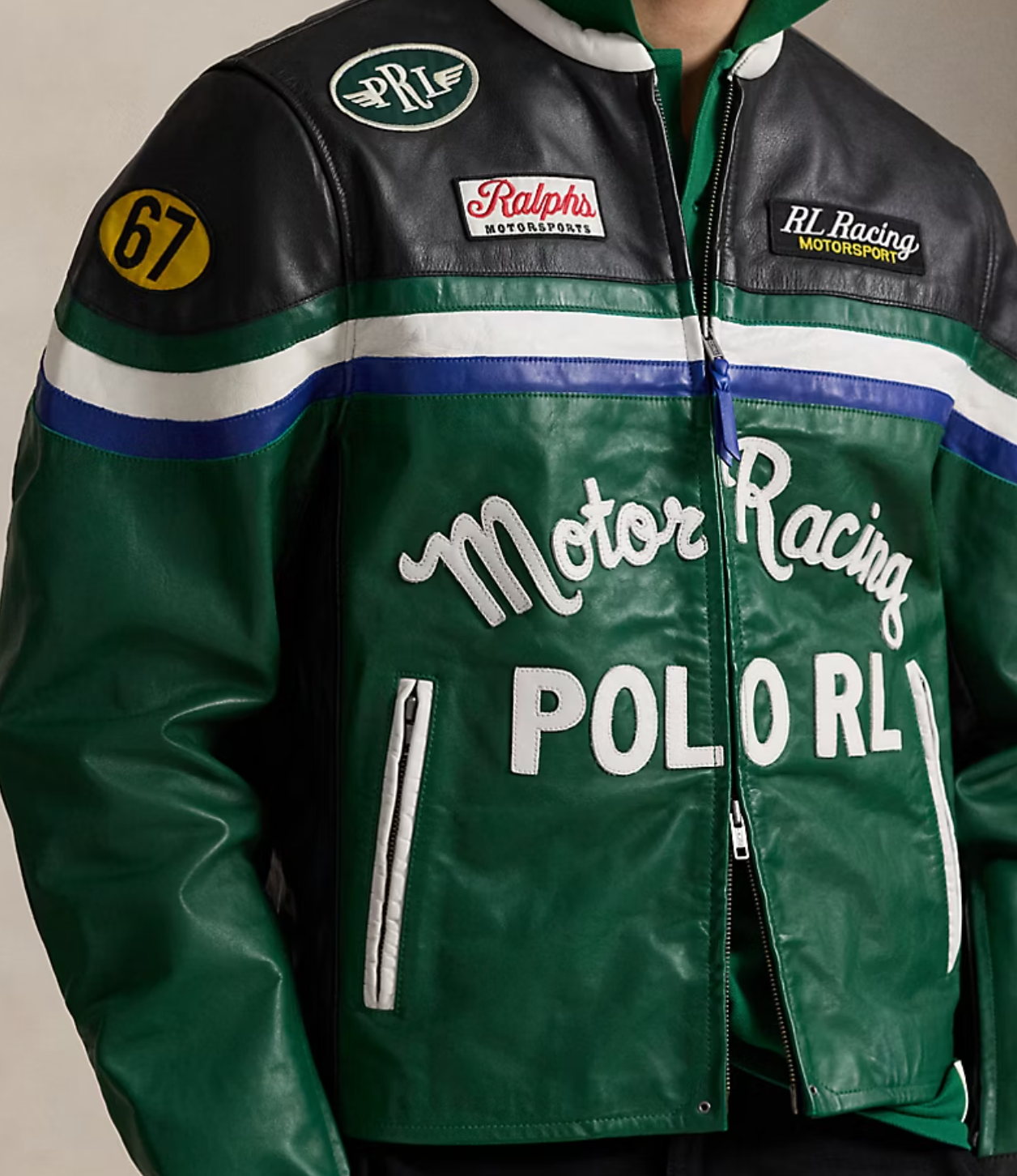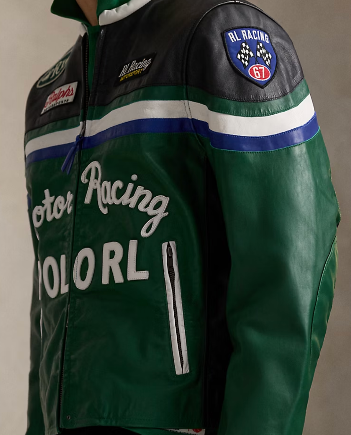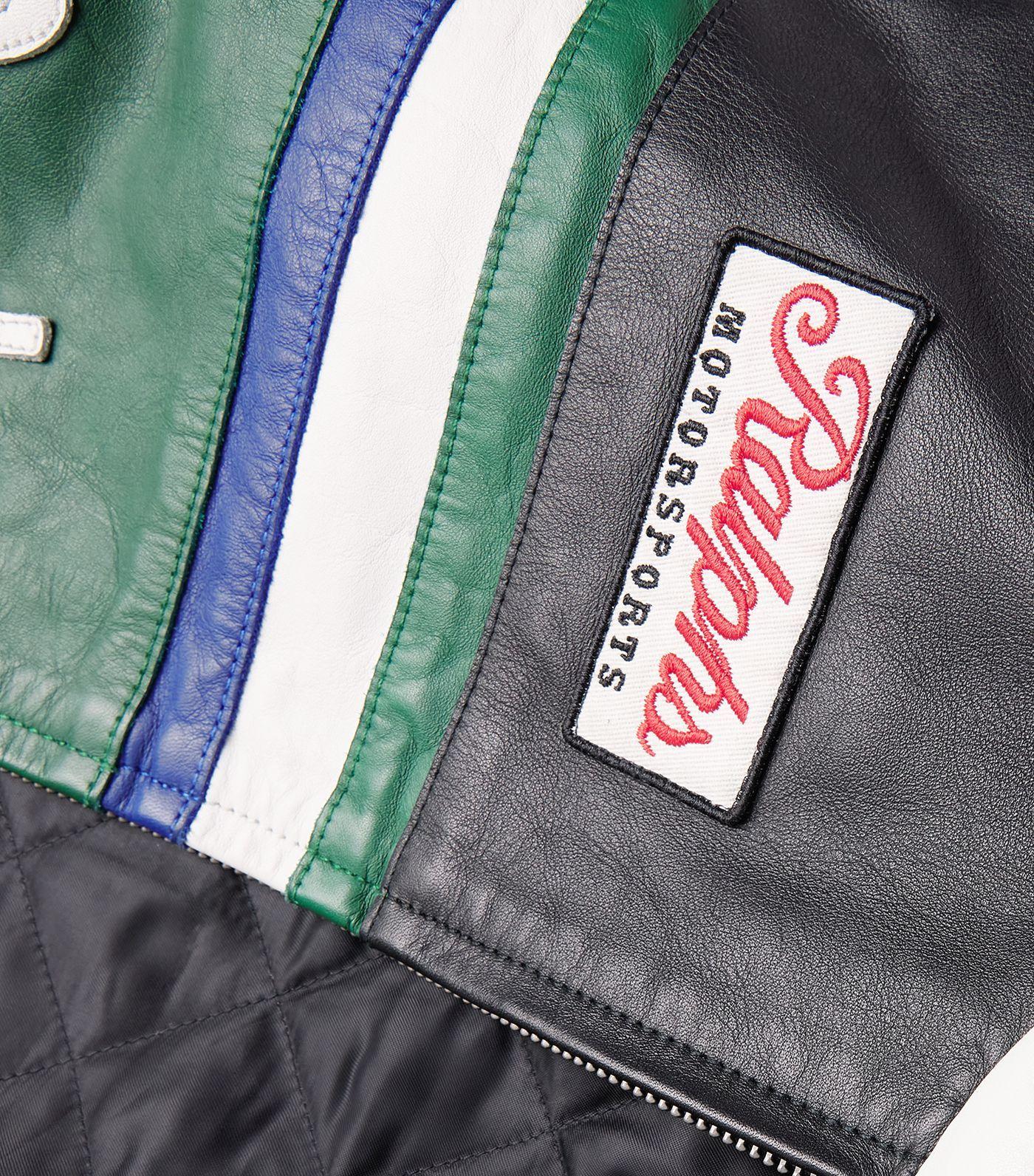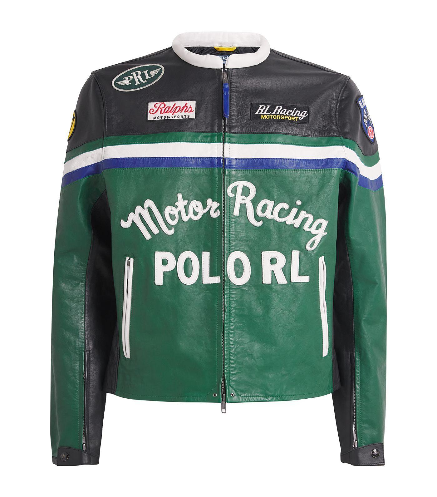 "RL Racing Motorsport" patch on the left chest. "Ralphs Motorsports" patch on the right chest. Leather appliqués