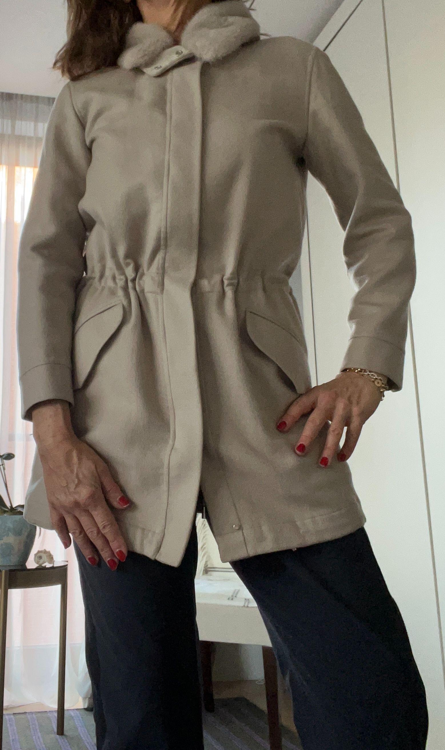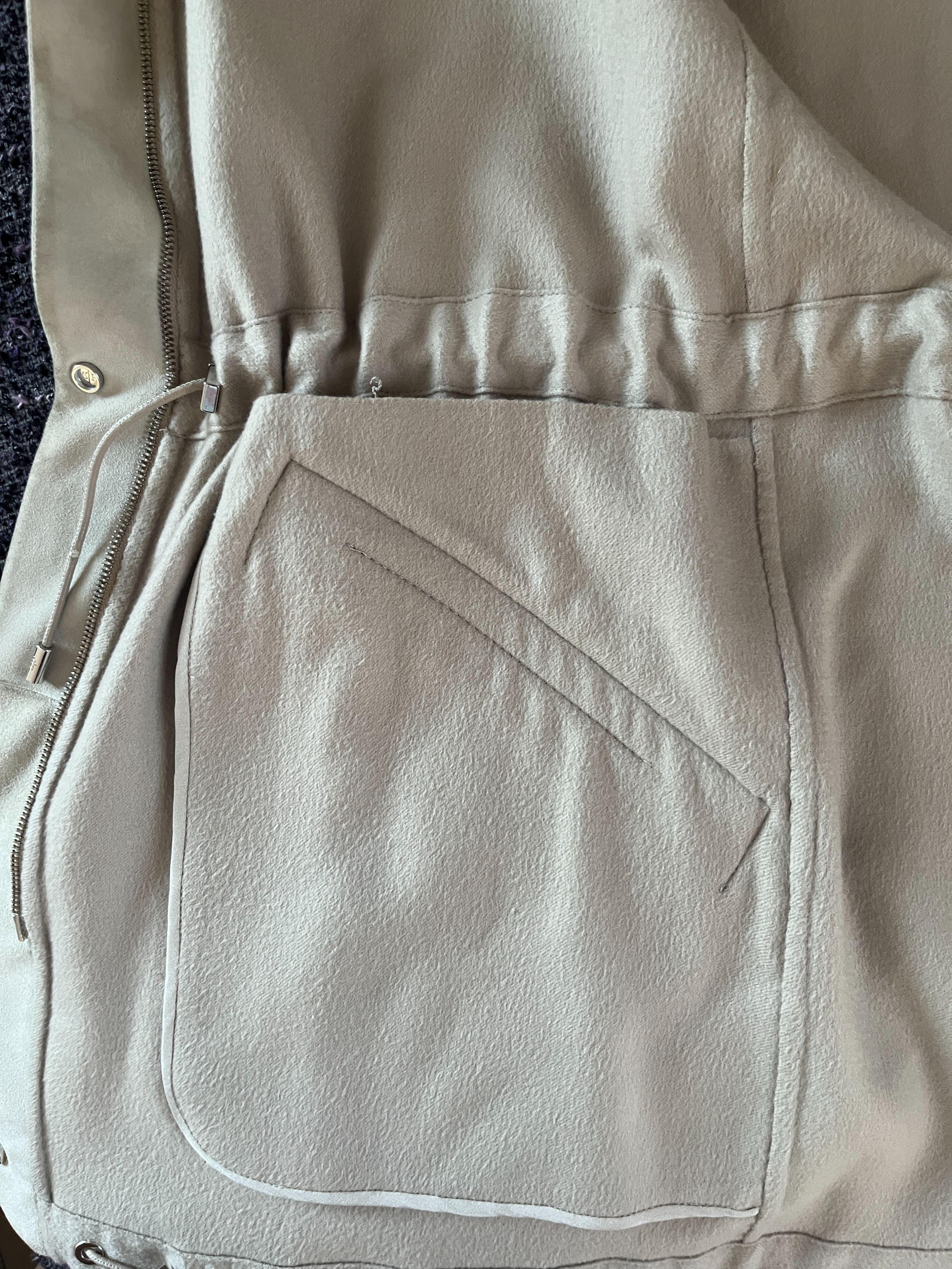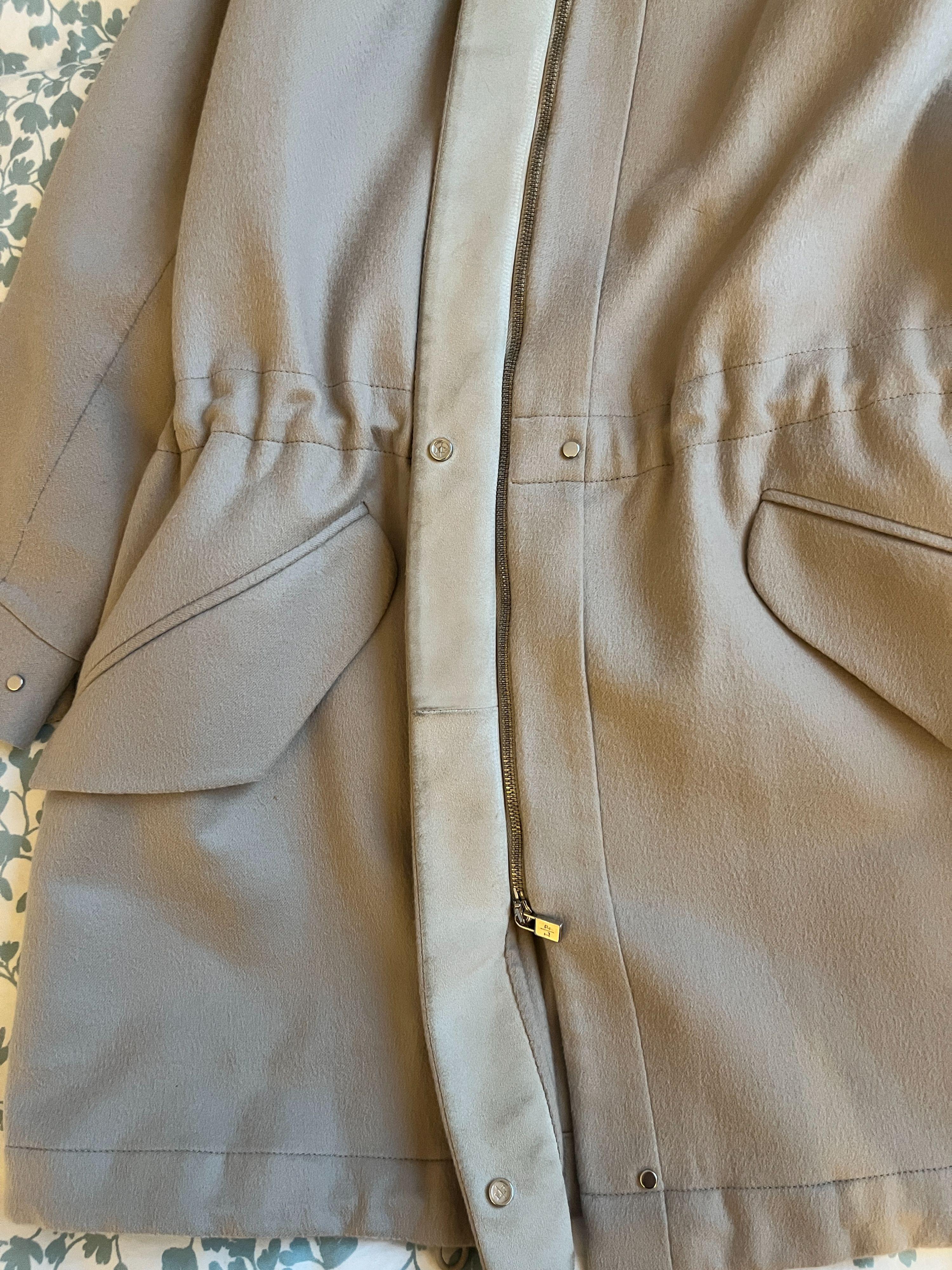 three quarter length cashmere jacket in a light taupe colour. Tailored by high end Italian design company, Loro Piana, in the softest cashmere. With detachable fur collar. Faux front pockets, full front zip and drawstring adjusting the waist. there are closures at the wrists and at the neck by discreet chrome snaps. Worn not more than once or twice. No flaws or marks. Comes with the original hanger and clothing bag. The model is 5'6" and wears a perfect size 42 Italian or 10 UK (the jacket is labelled size 40 Italian so runs slightly large for a size 40).