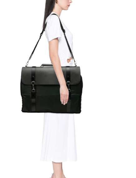 The Sac Gibeciere features a nylon and taiga leather body, a rolled leather handle, an adjustable and detachable strap, a front flap with dual clasp closures, an exterior back zip pocket, and interior zip compartments.