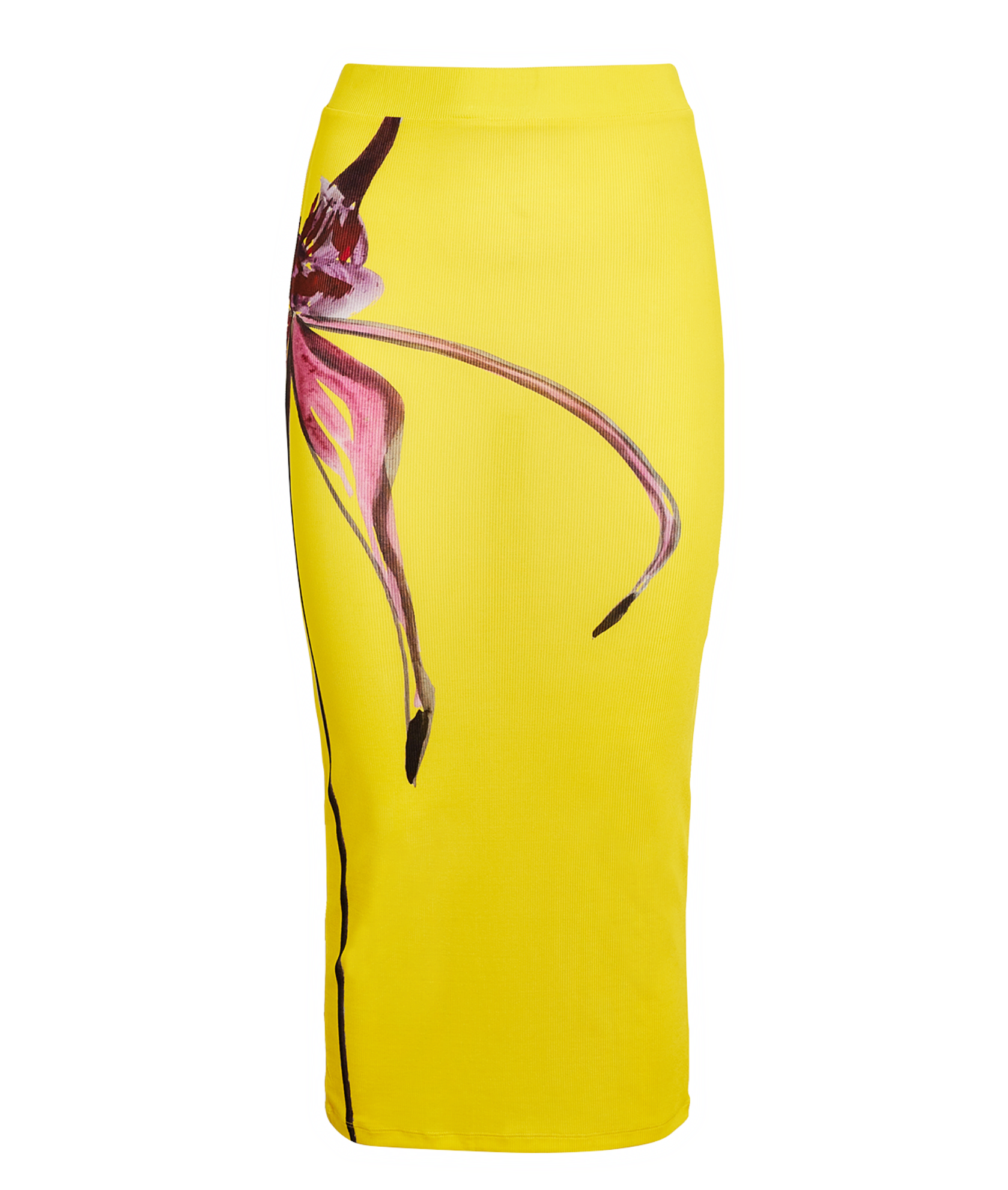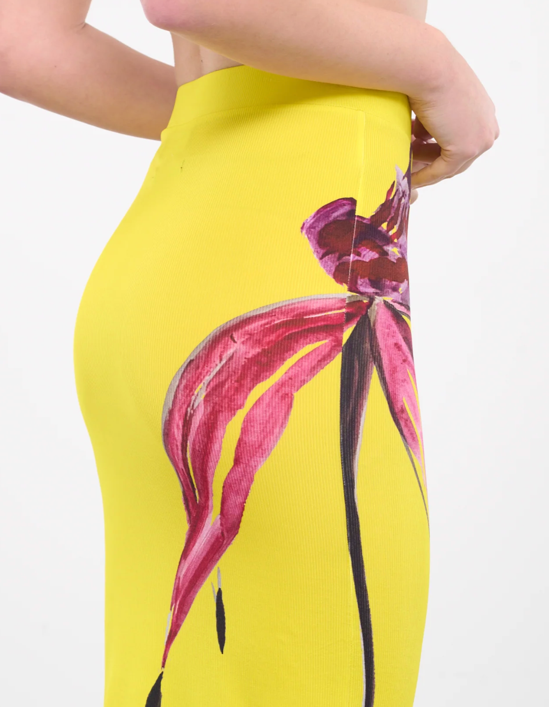 LOUISA BALLOU skirt in yellow, paneled ribbed jersey construction, Caladenia orchid print, elasticated rib-knit waistband, straight hem, midi-length, slim fit.