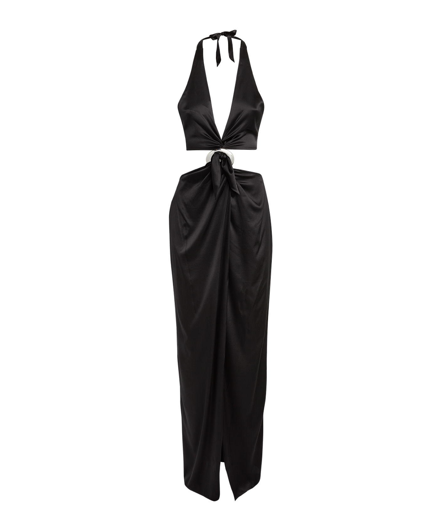 This Louisa Ballou dress is crafted in the USA from lightweight, stretch charmeuse. The sleeveless dress features a halter neckline, a cutout design with ring accent at the front, and a tie at the open back. The shell is made of 96% silk and 4% elastane. It should be dry cleaned.