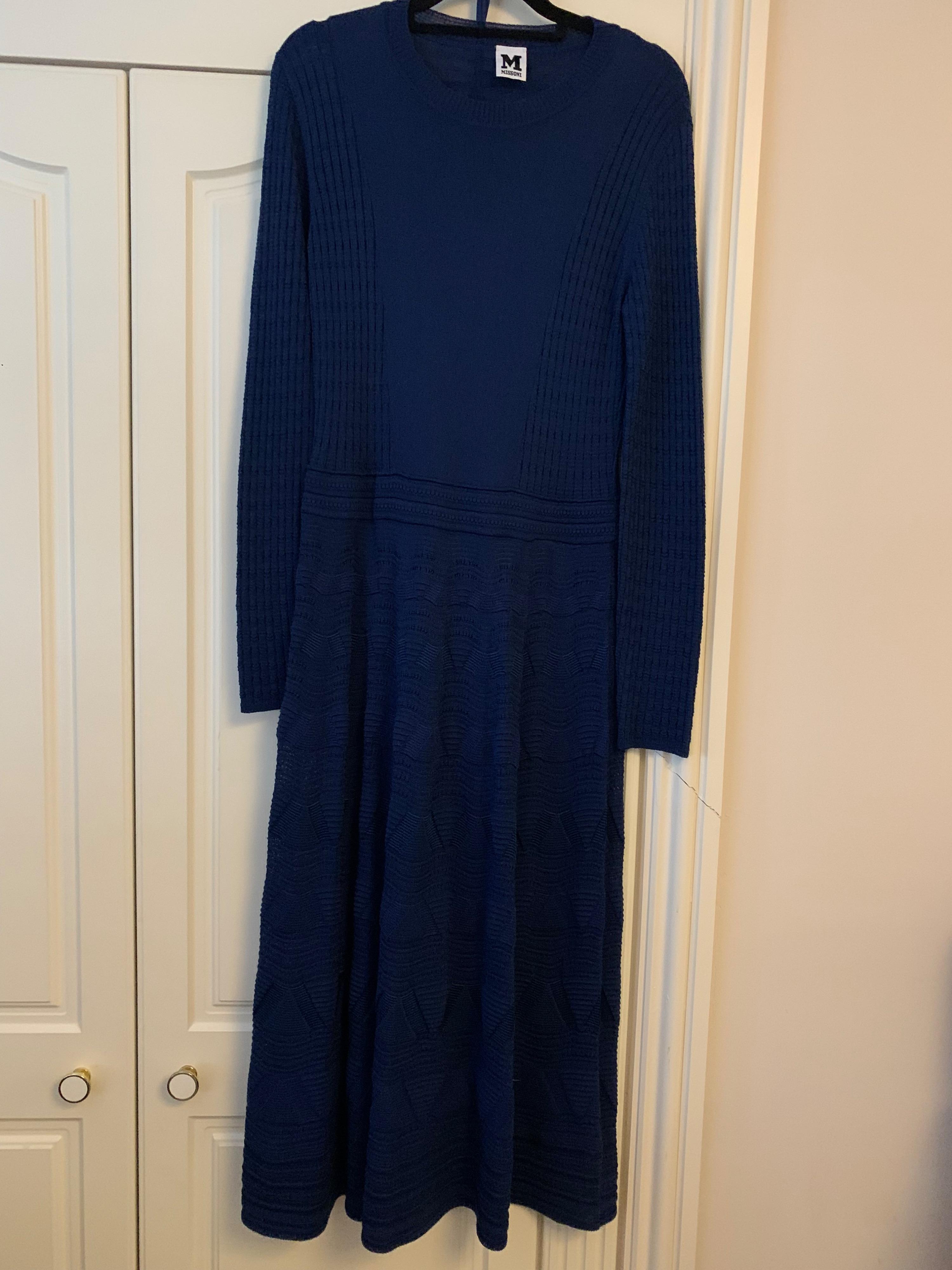 A Missoni classic dress midi length a royal blue colour so a fresh shade wast detail with long sleeves will fit 12/14 has a separate slip if needed