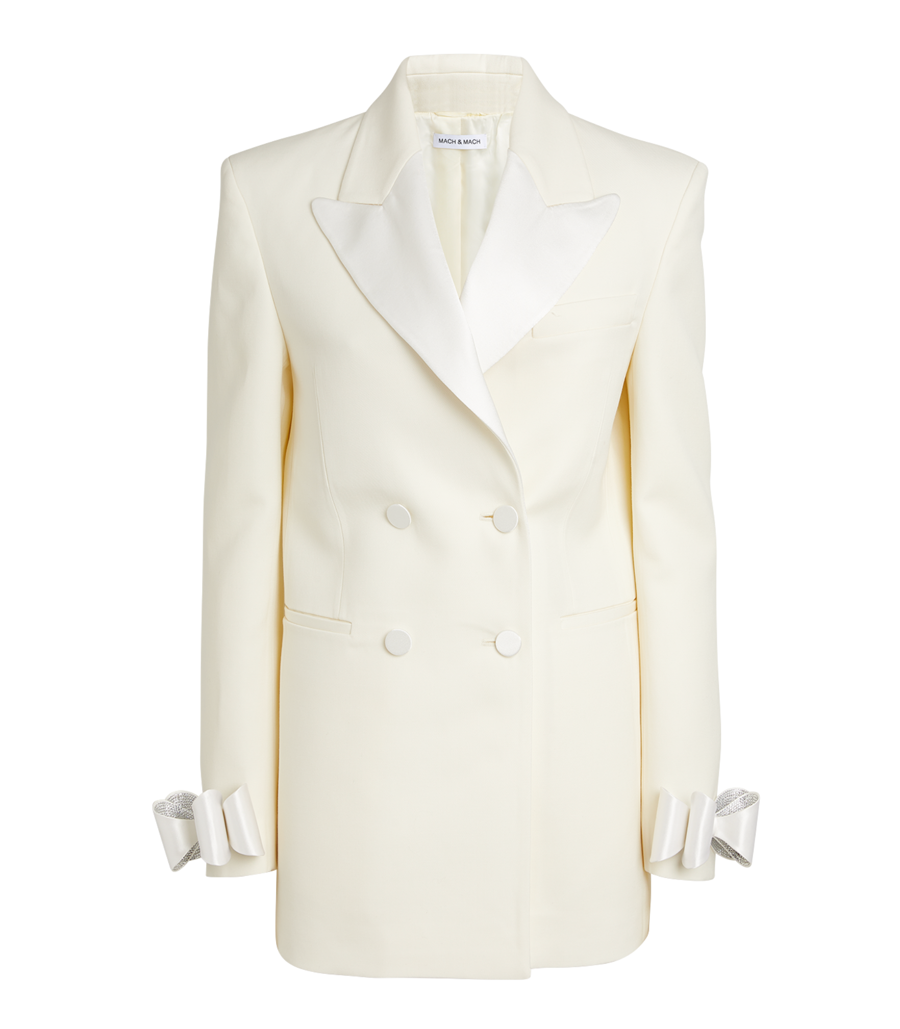 Crafted of wool and silk, Mach & Mach's dynamic double-breasted blazer minidress flaunts sleek peak lapels and crystallized bows at the cuffs.
