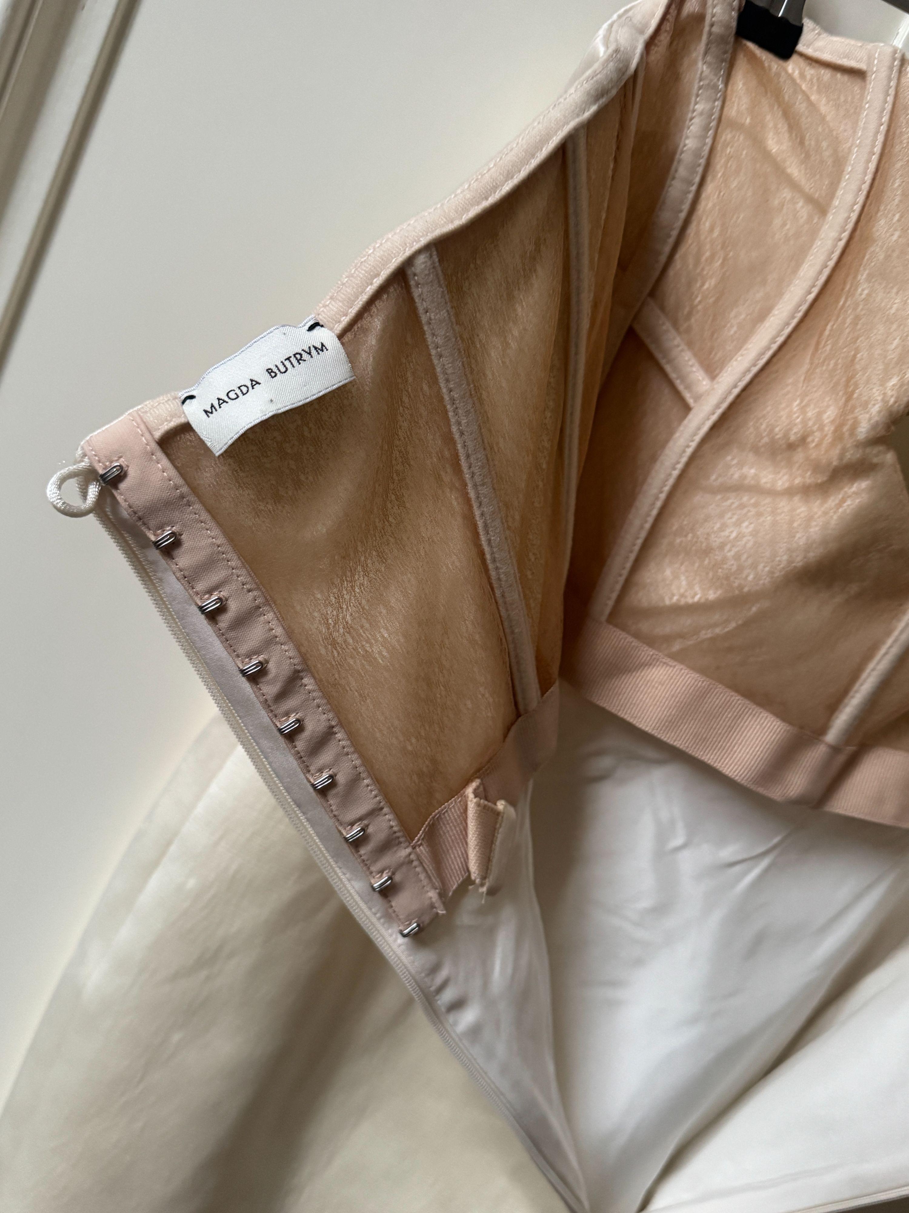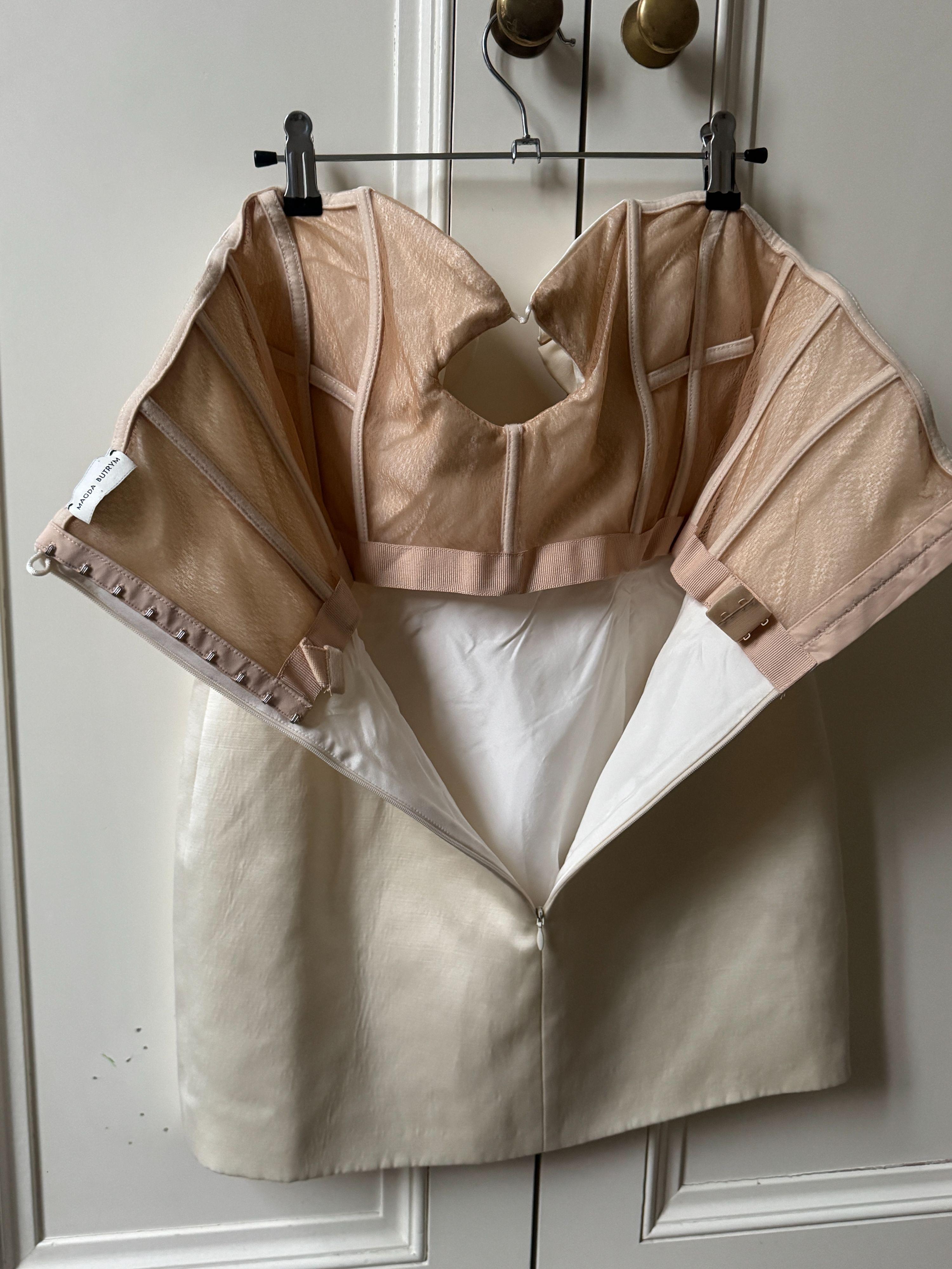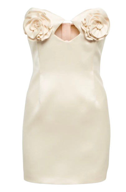 Strapless corset mini dress by Magda Butrym, 100% silk with floral appliques.
