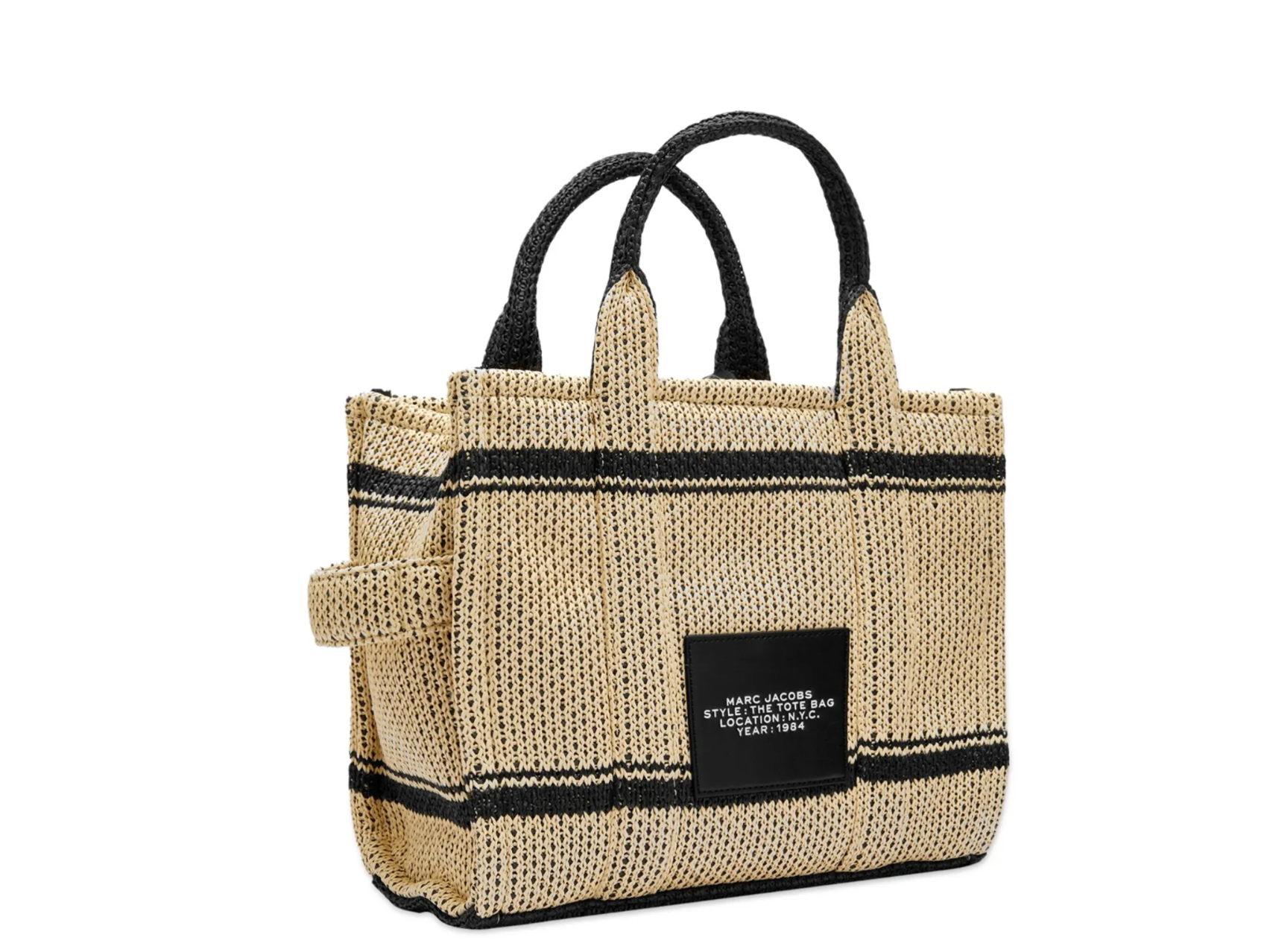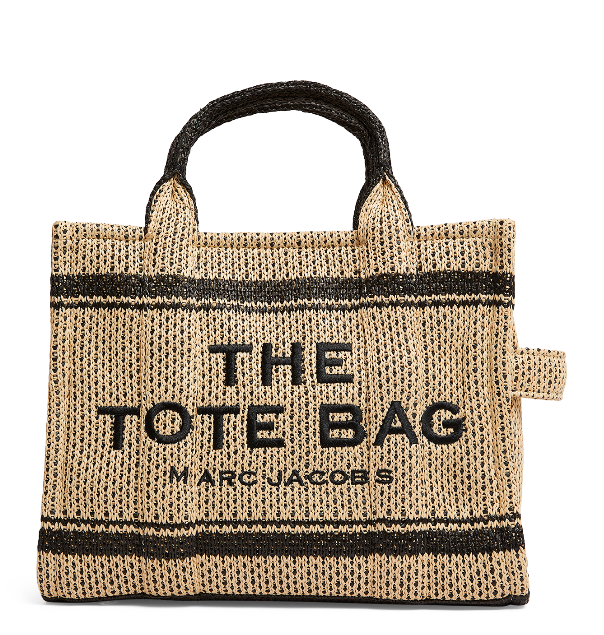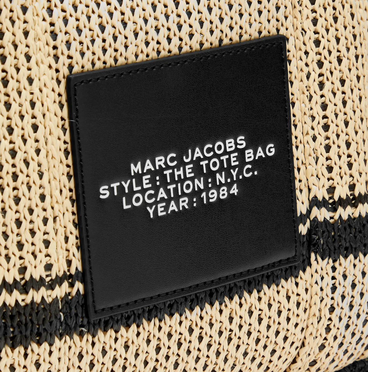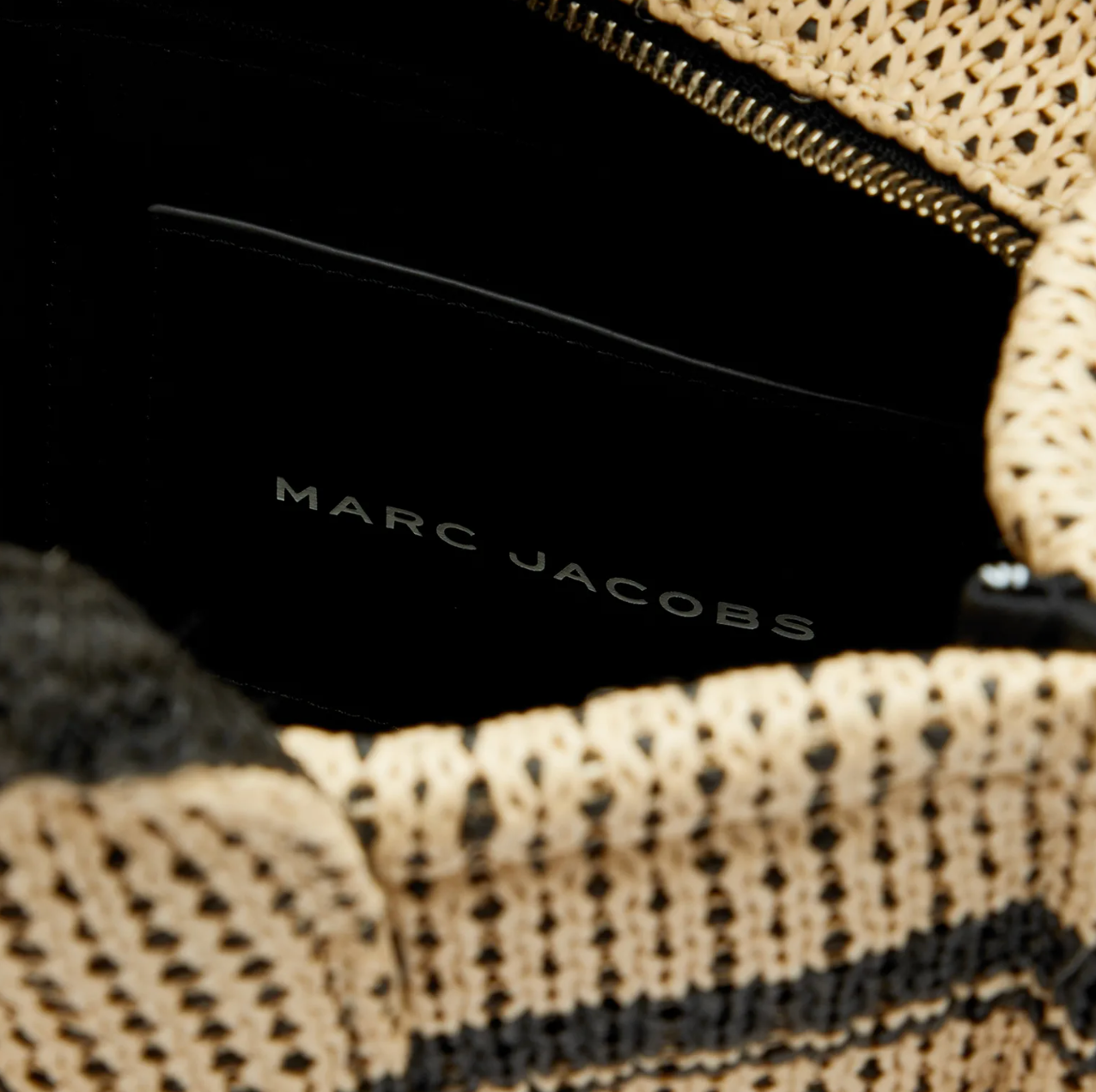 Defined by its structured silhouette and bold front branding, The Tote Bag is an iconic Marc Jacobs’ design. Seen here in a woven natural and black hue, the accessory opens up to a spacious interior complemented by multiple pockets for added functionality.