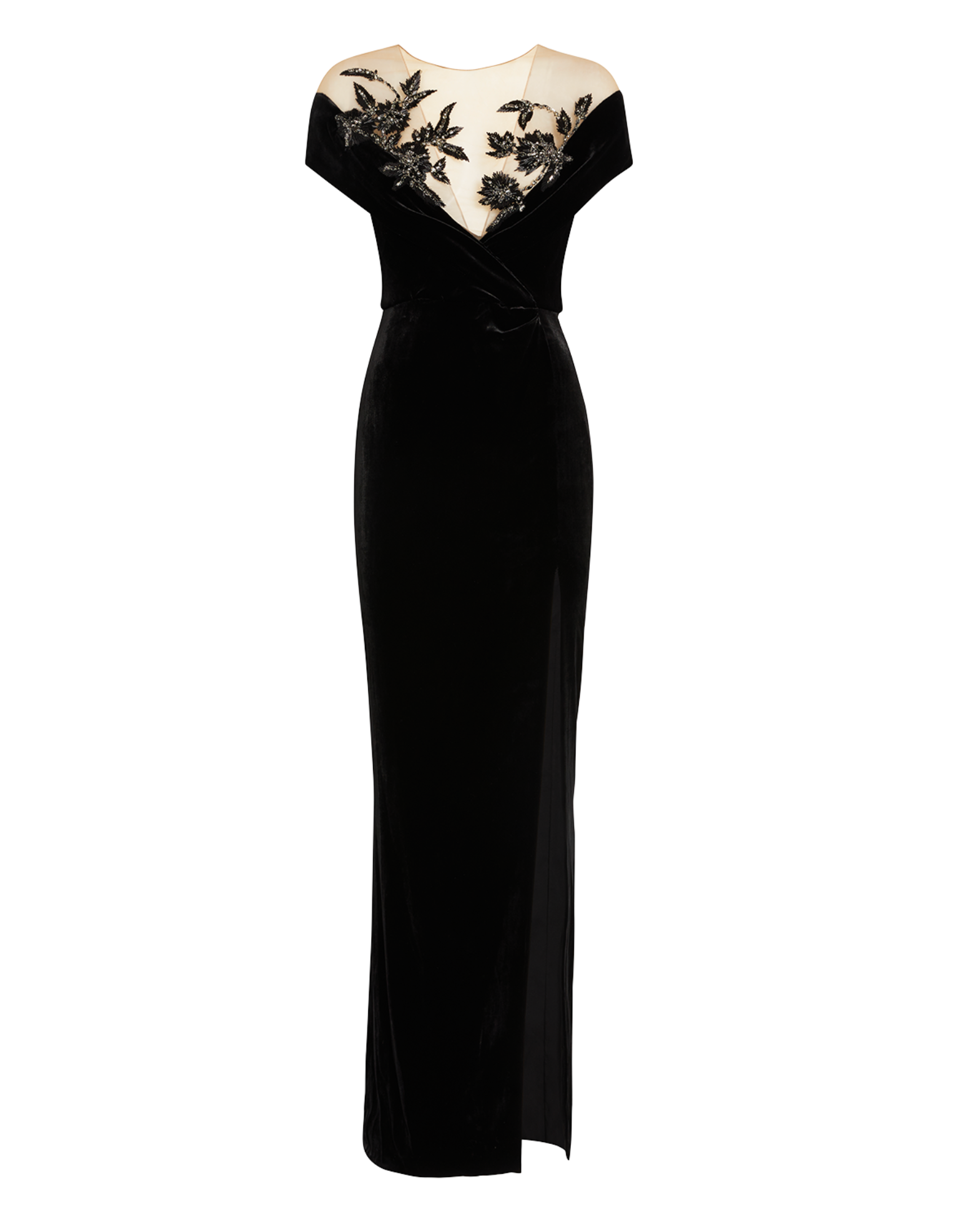 Illusion tulle yoke off the shoulder slinky velvet gown with crystal and bugle beaded embroidery at neckline.