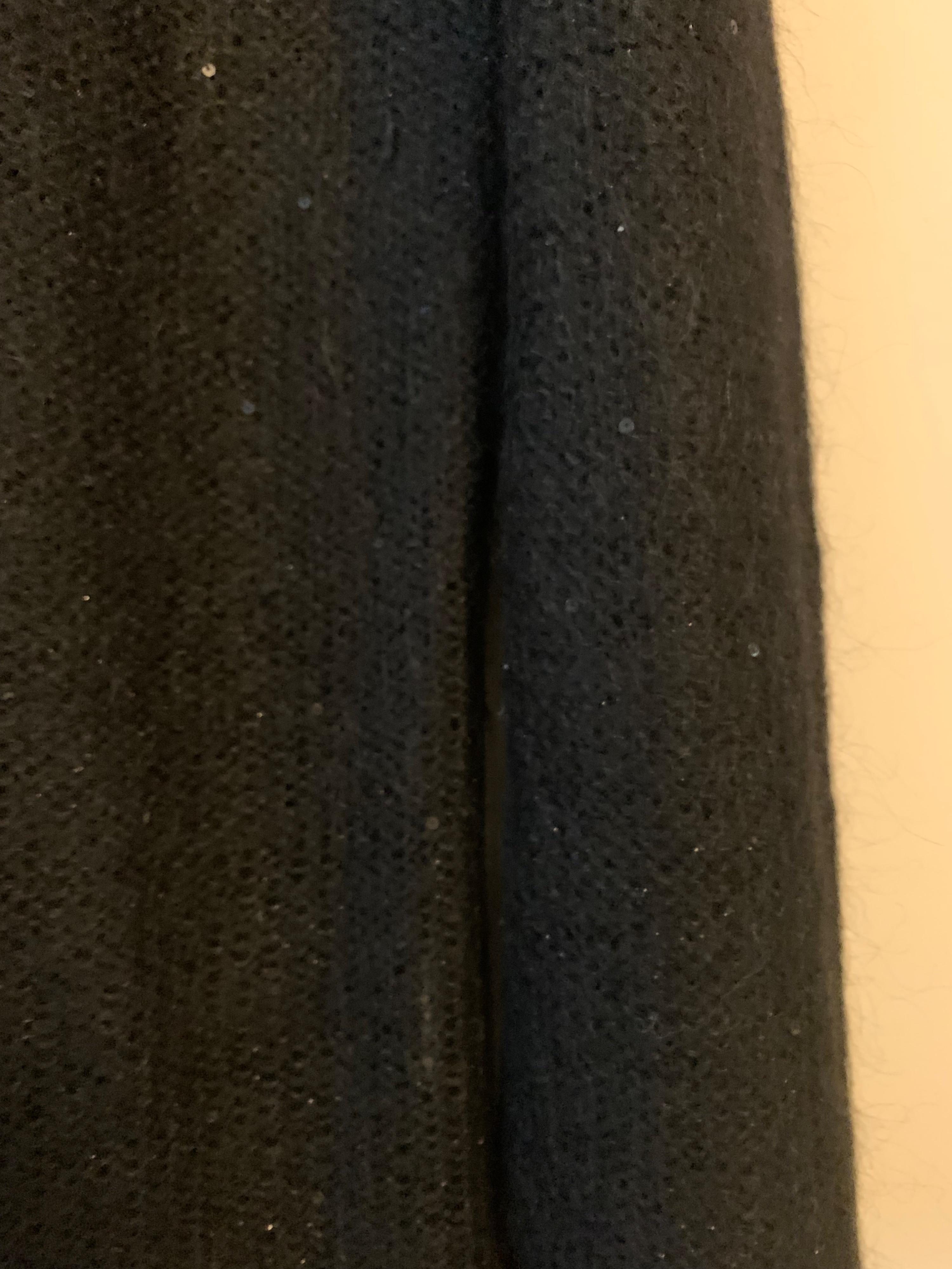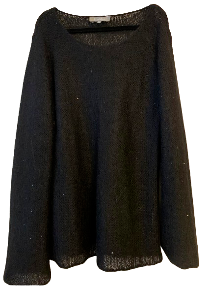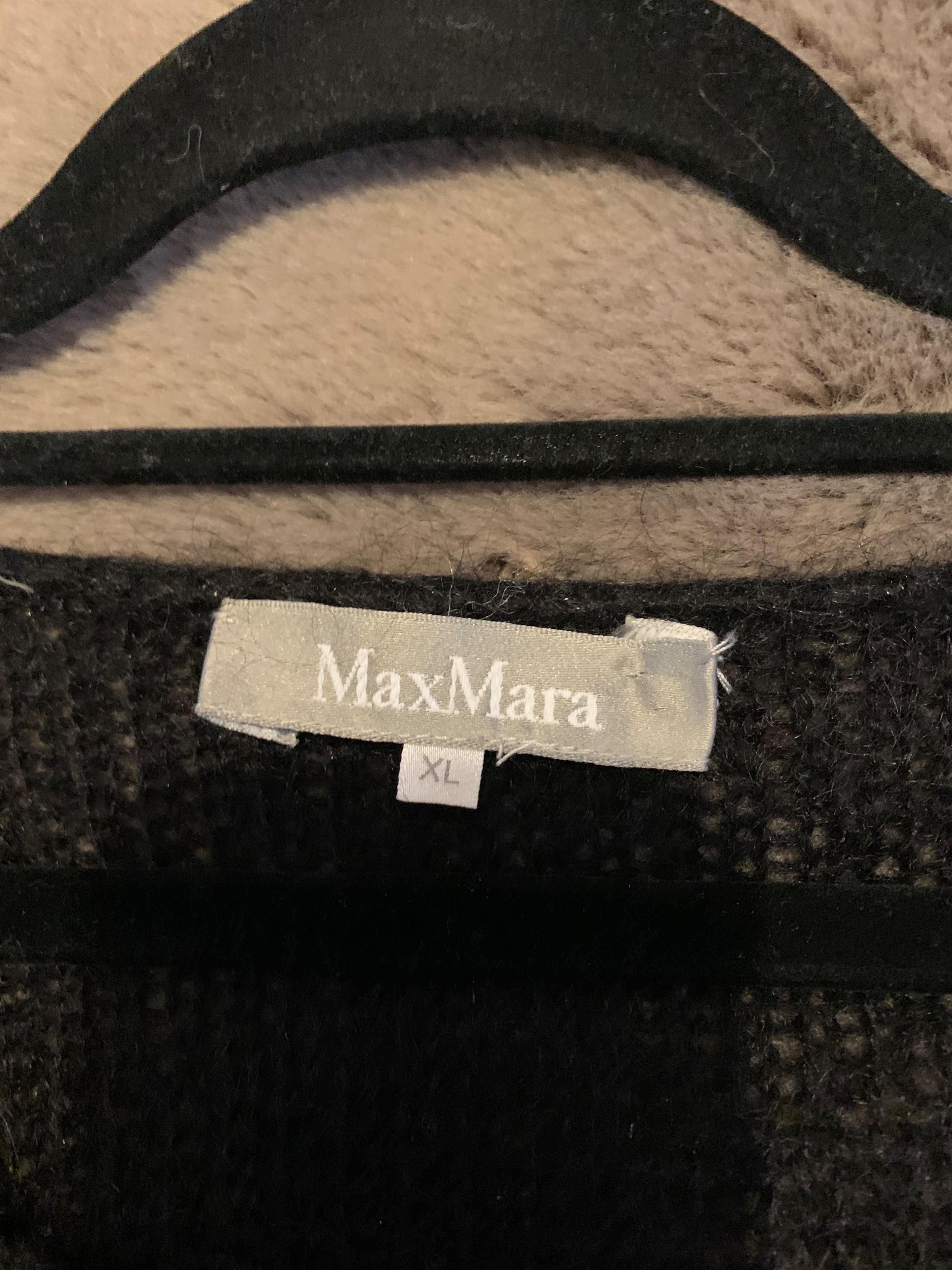 Black Maxmara jumper slightly transparent worn with a vest or not. Just past hip slight sparkle in the knit curved neckline fit a 12/14 a relaxed look with a shape