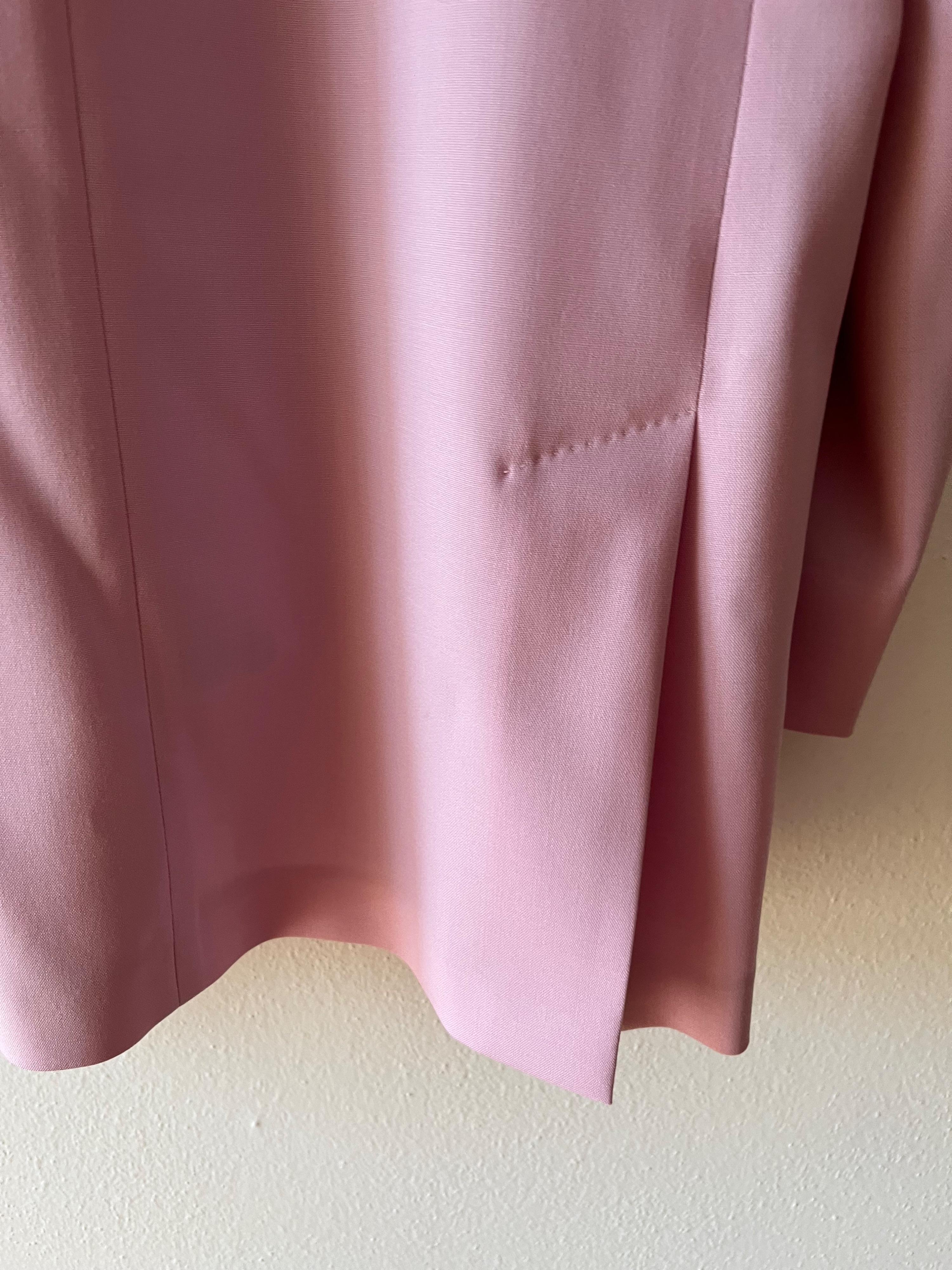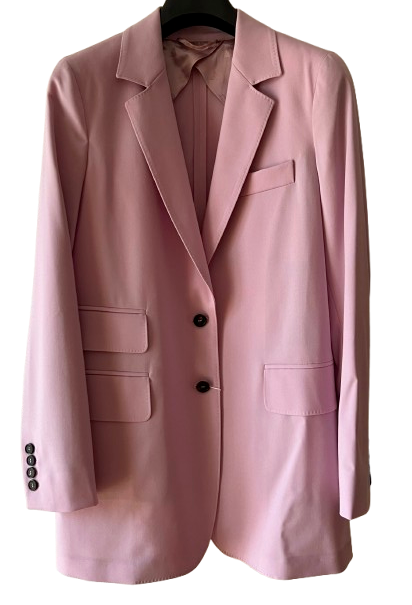long one breasted jacket in pale pink. Partially lined with logo lining.