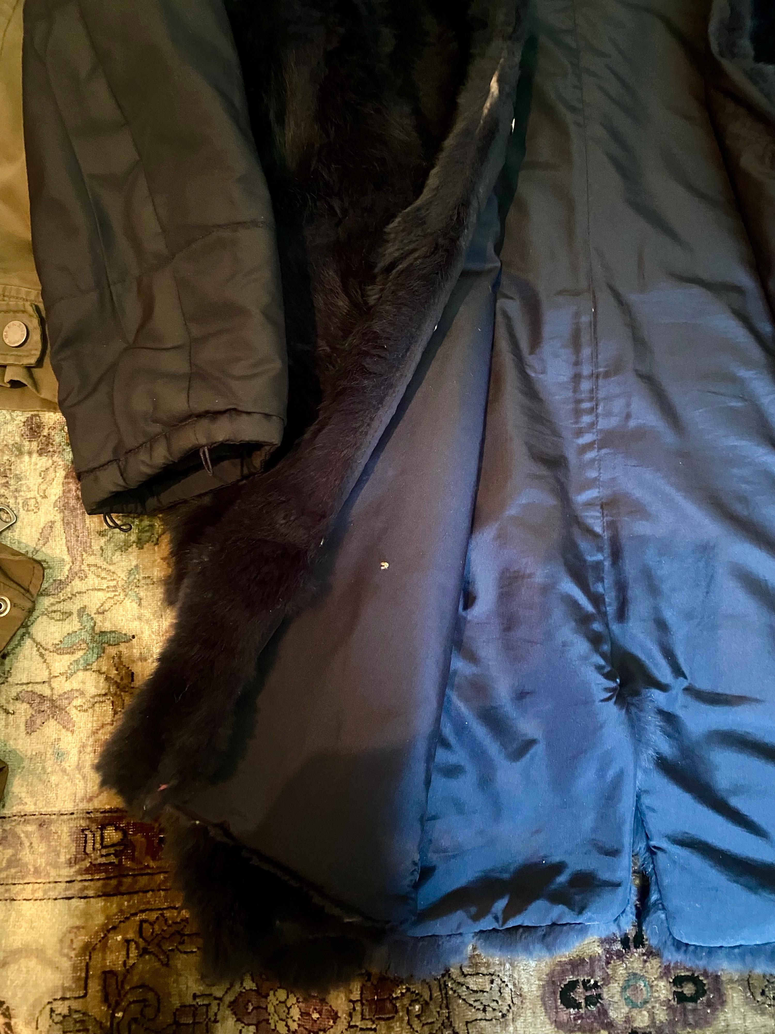 Two parkas in one. Cotton outer and genuine rabbit fur inner. In two parts and can be worn together or/and separately. Fur part is fully removable (the photo shows some worn areas of the fur, but it is not really visible when wearing it because it is inside). There are signs of wear on the upper part and two small spots on the bottom (see additional photos). Otherwise, it is in great preloved condition, perfect for layering, traveling and every day wear.