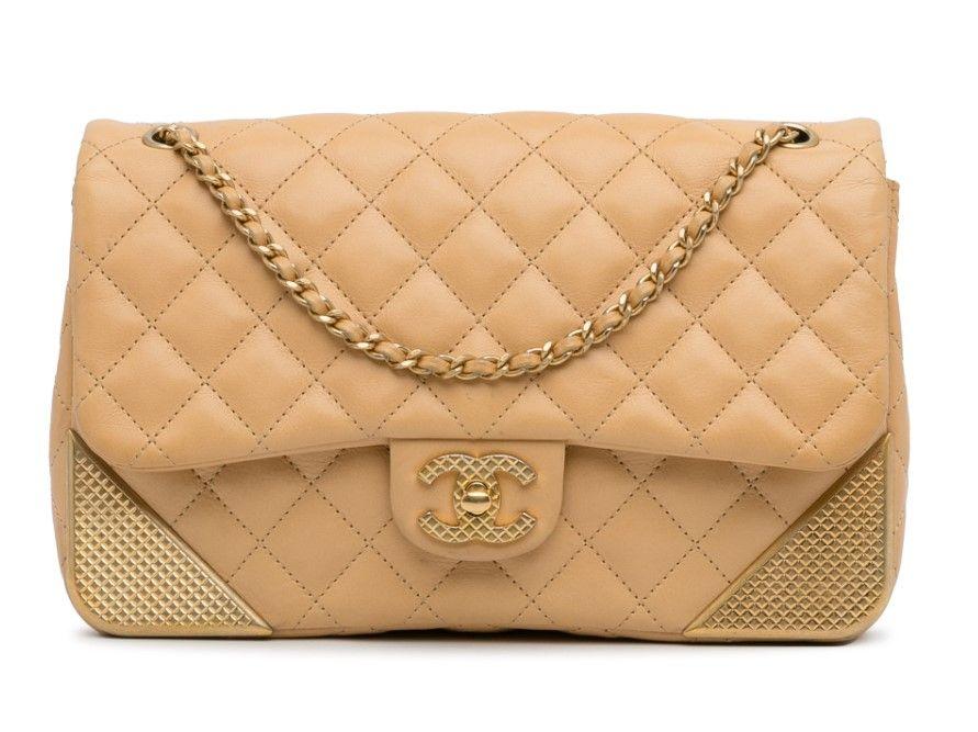 This shoulder bag features a quilted lambskin body with metal edges, leather woven chain straps, a flap with interlocking Cs and a twist lock closure, an exterior back slip pocket, and an interior zip pocket.