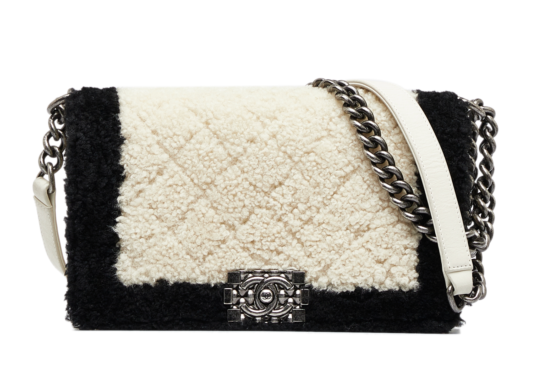 The Boy flap features a fur body with leather trim, a silver-tone curb chain strap, a front flap with push lock closure, and an interior slip pocket.