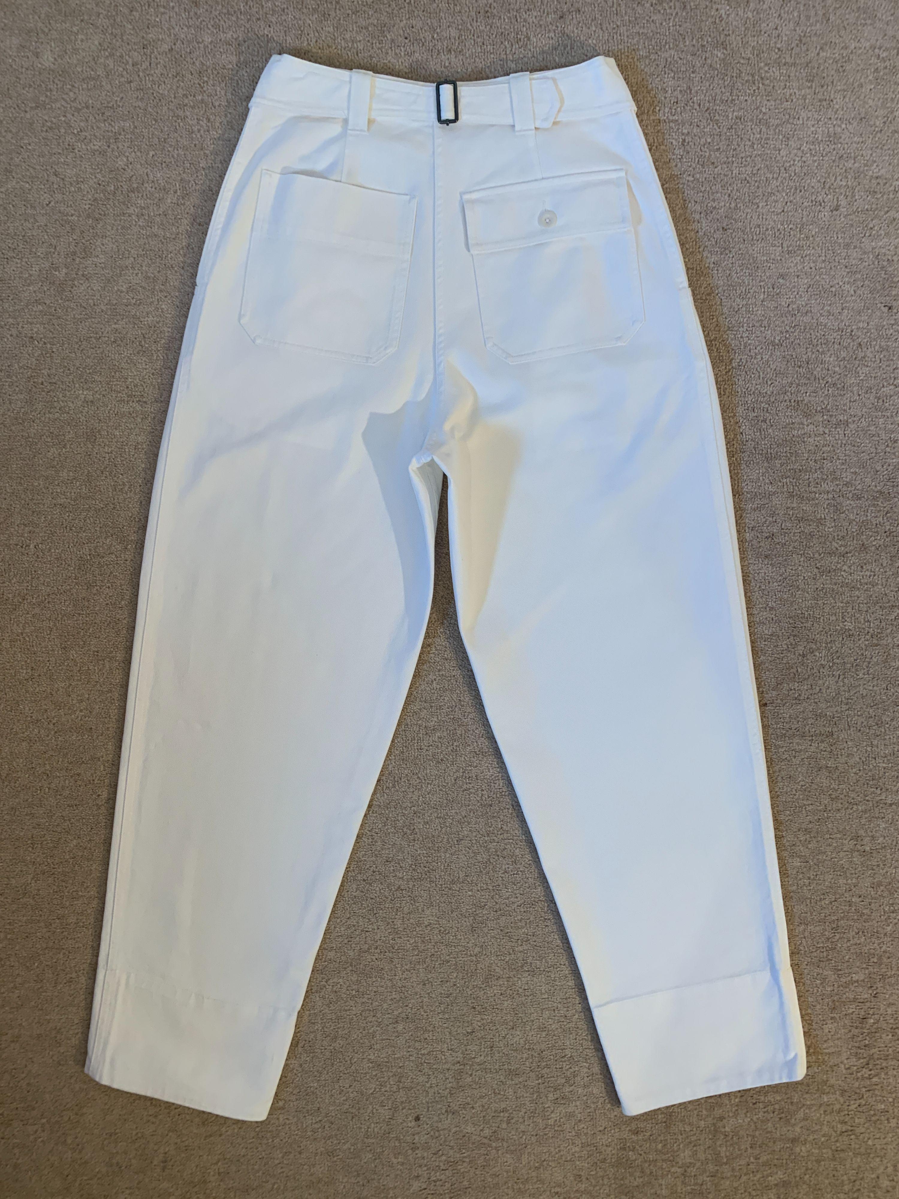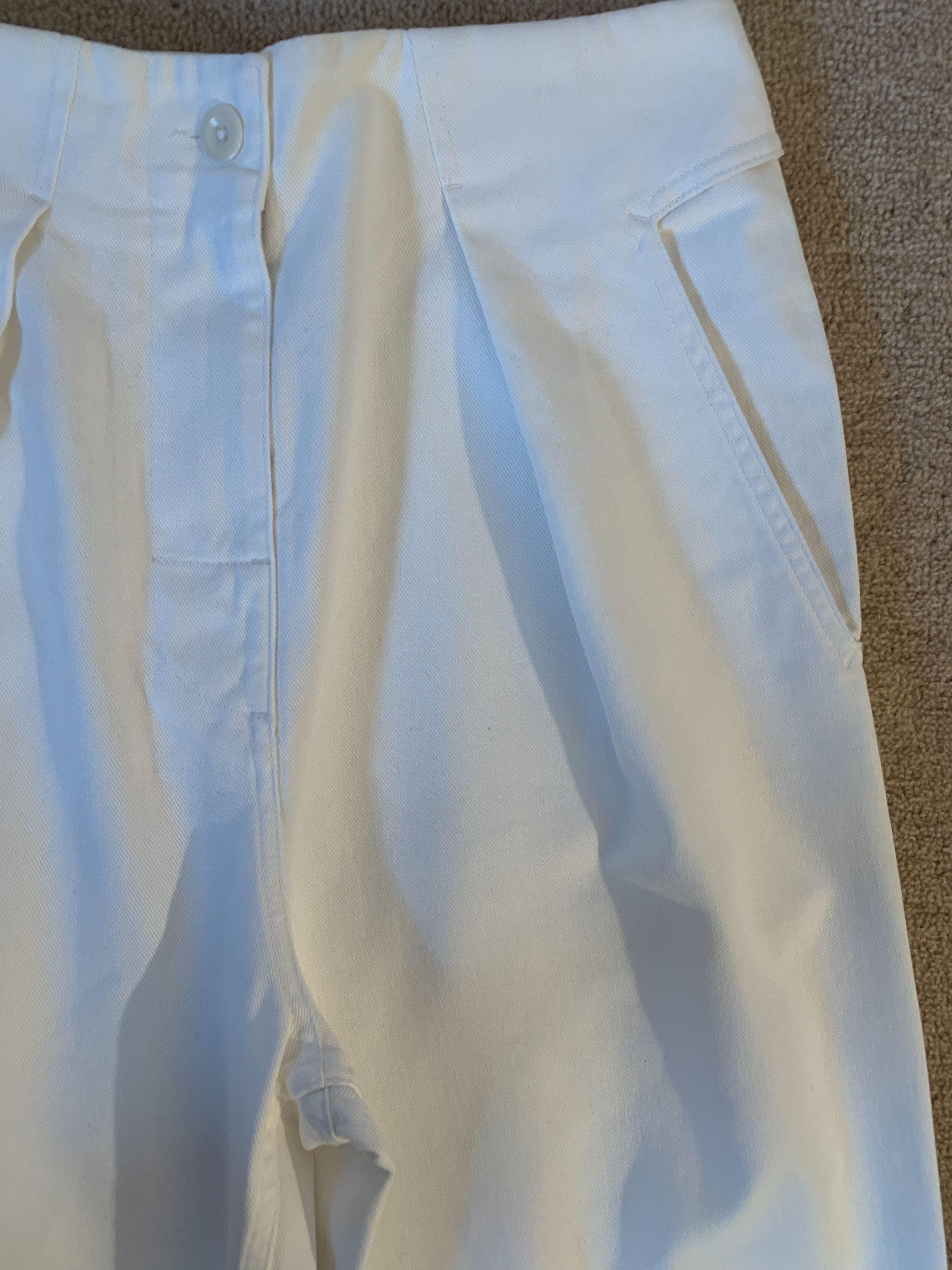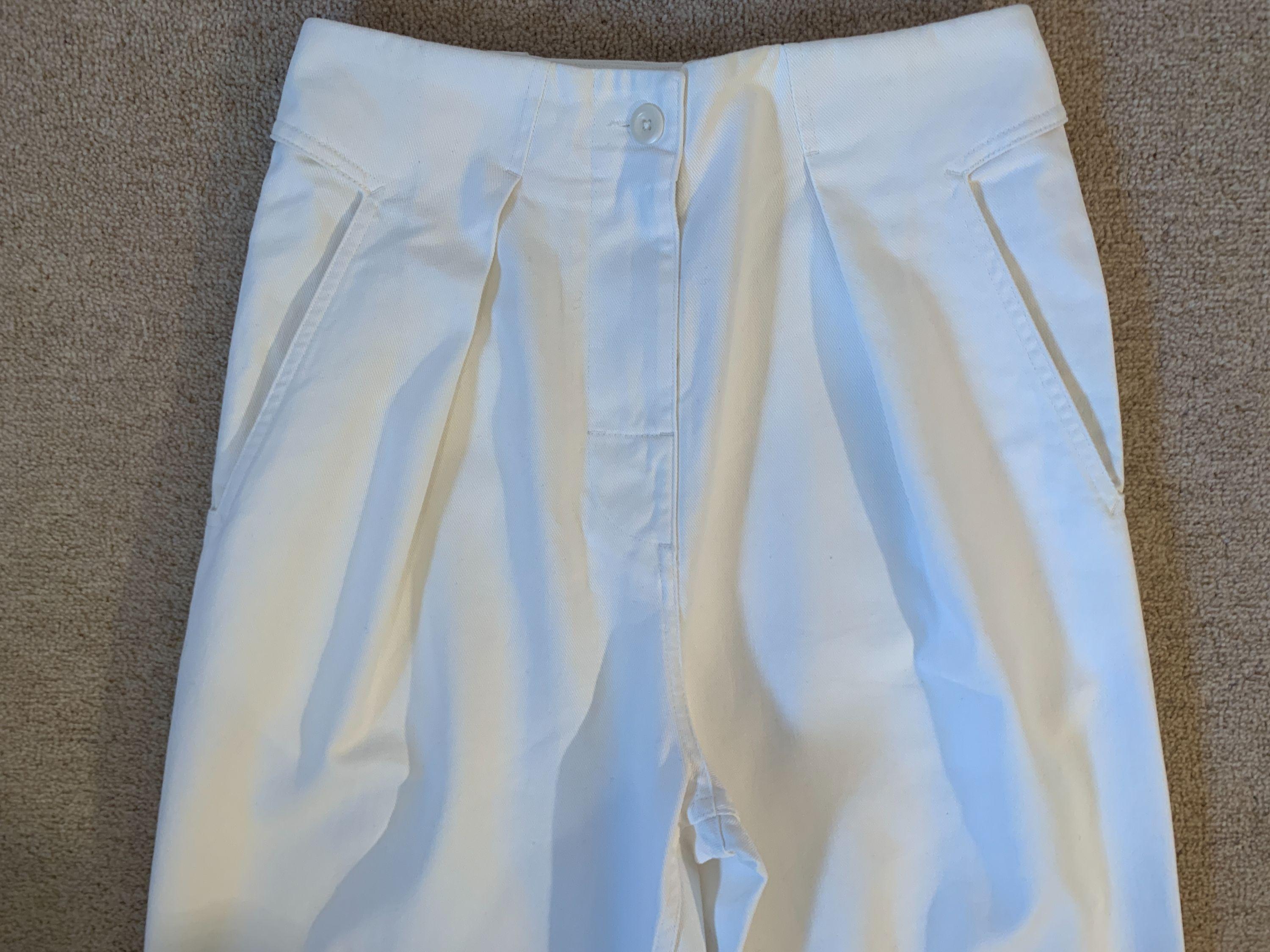 MHL by Margaret Howell off white soft cotton twill pleated front, relaxed leg, self waistband with cinch back trousers, slant side pockets. Button through flap patch back pocket. There is a option to fold up at the double seam creating a 4.5" turn up.