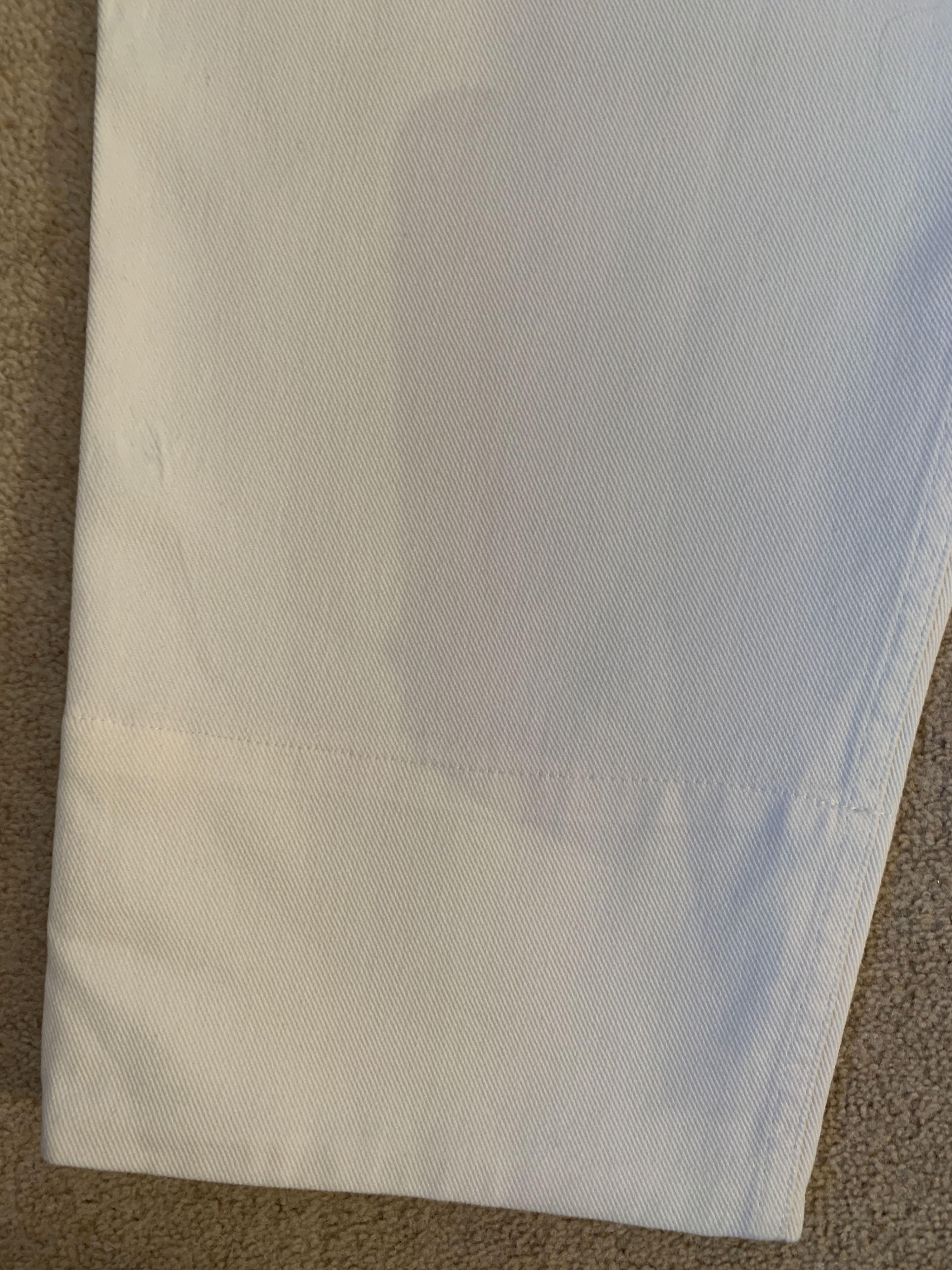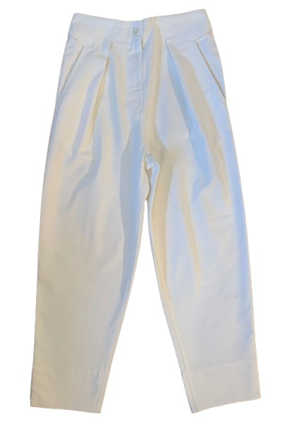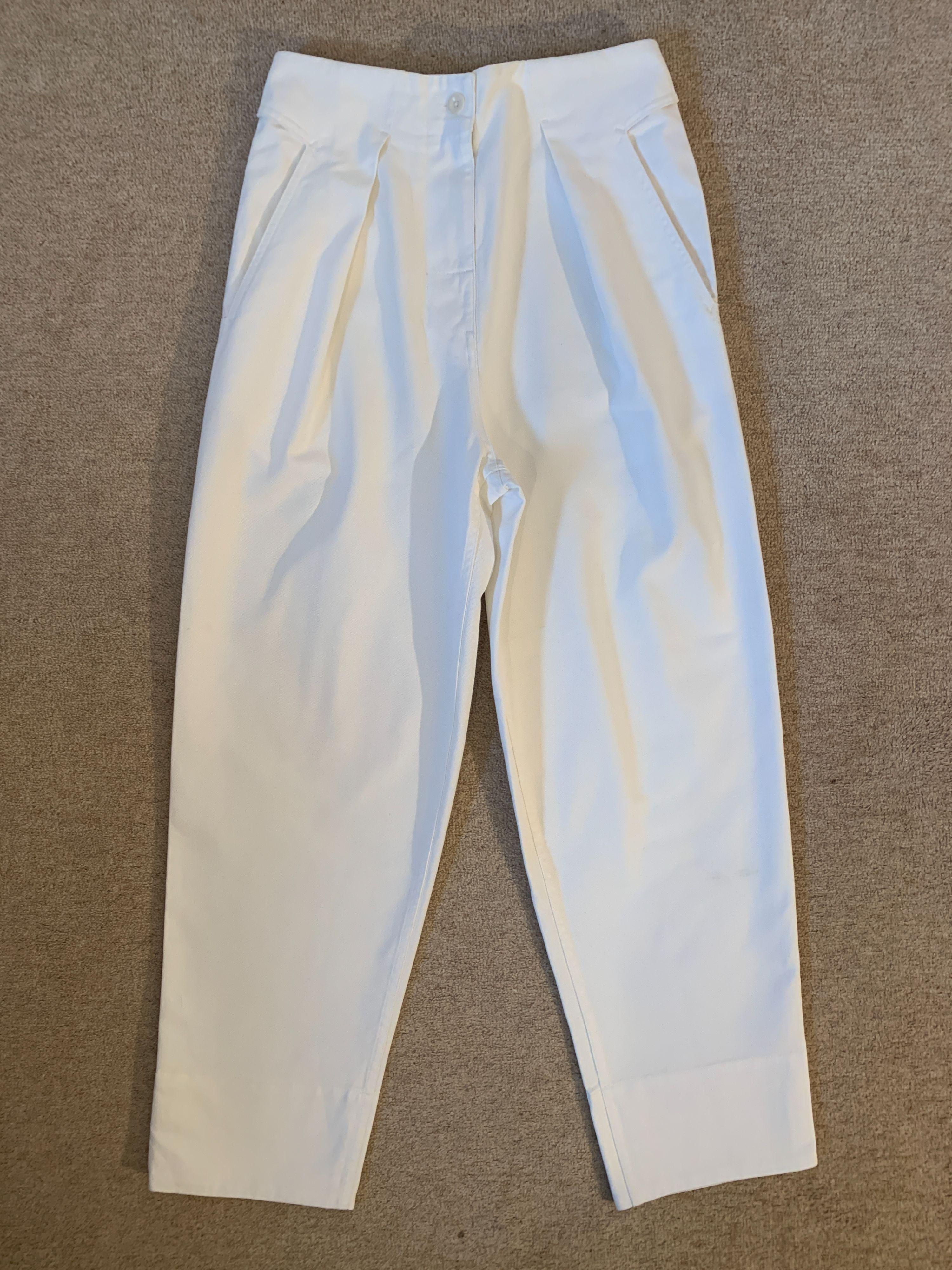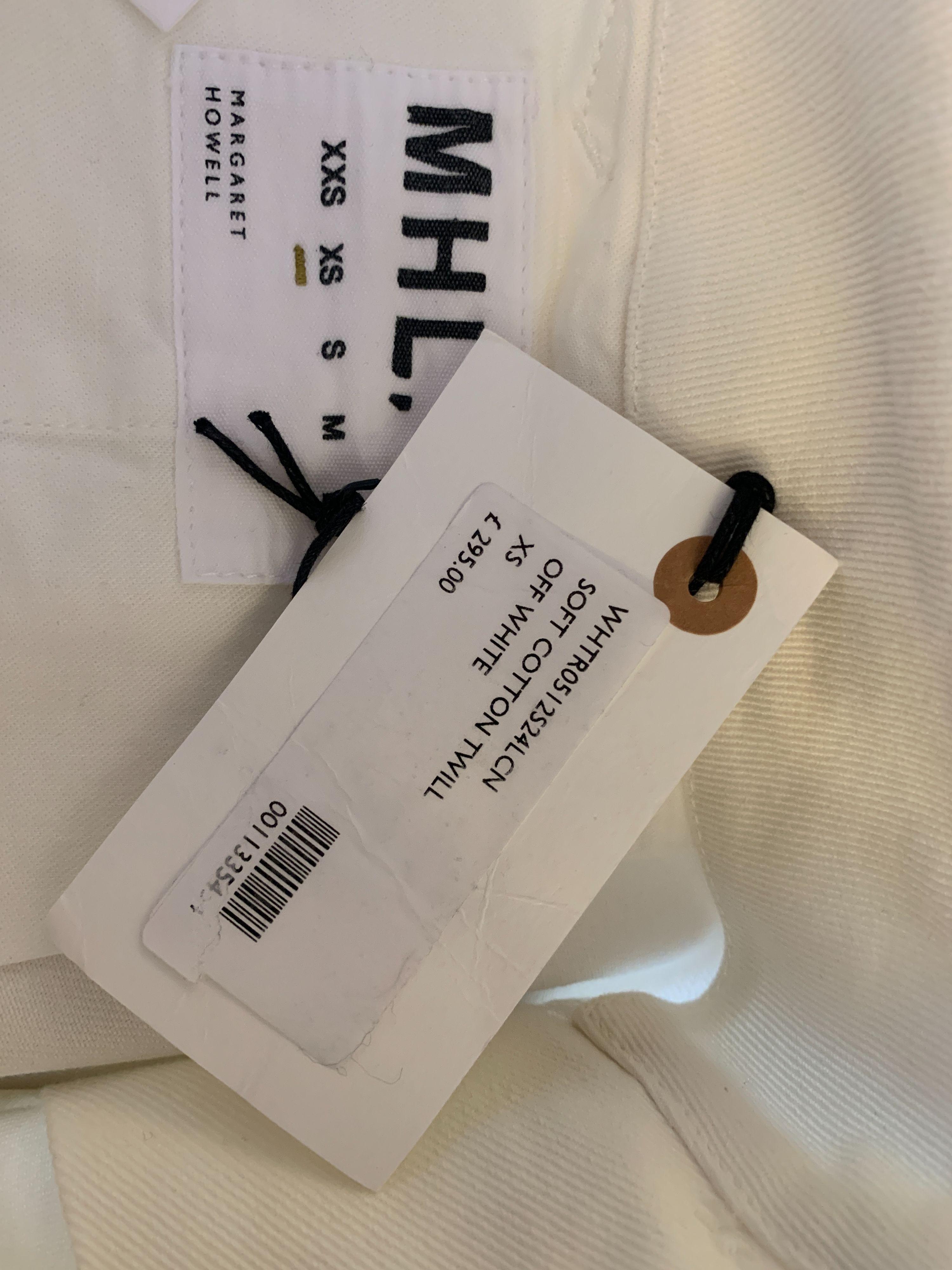 MHL by Margaret Howell off white soft cotton twill pleated front, relaxed leg, self waistband with cinch back trousers, slant side pockets. Button through flap patch back pocket. There is a option to fold up at the double seam creating a 4.5" turn up.