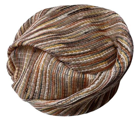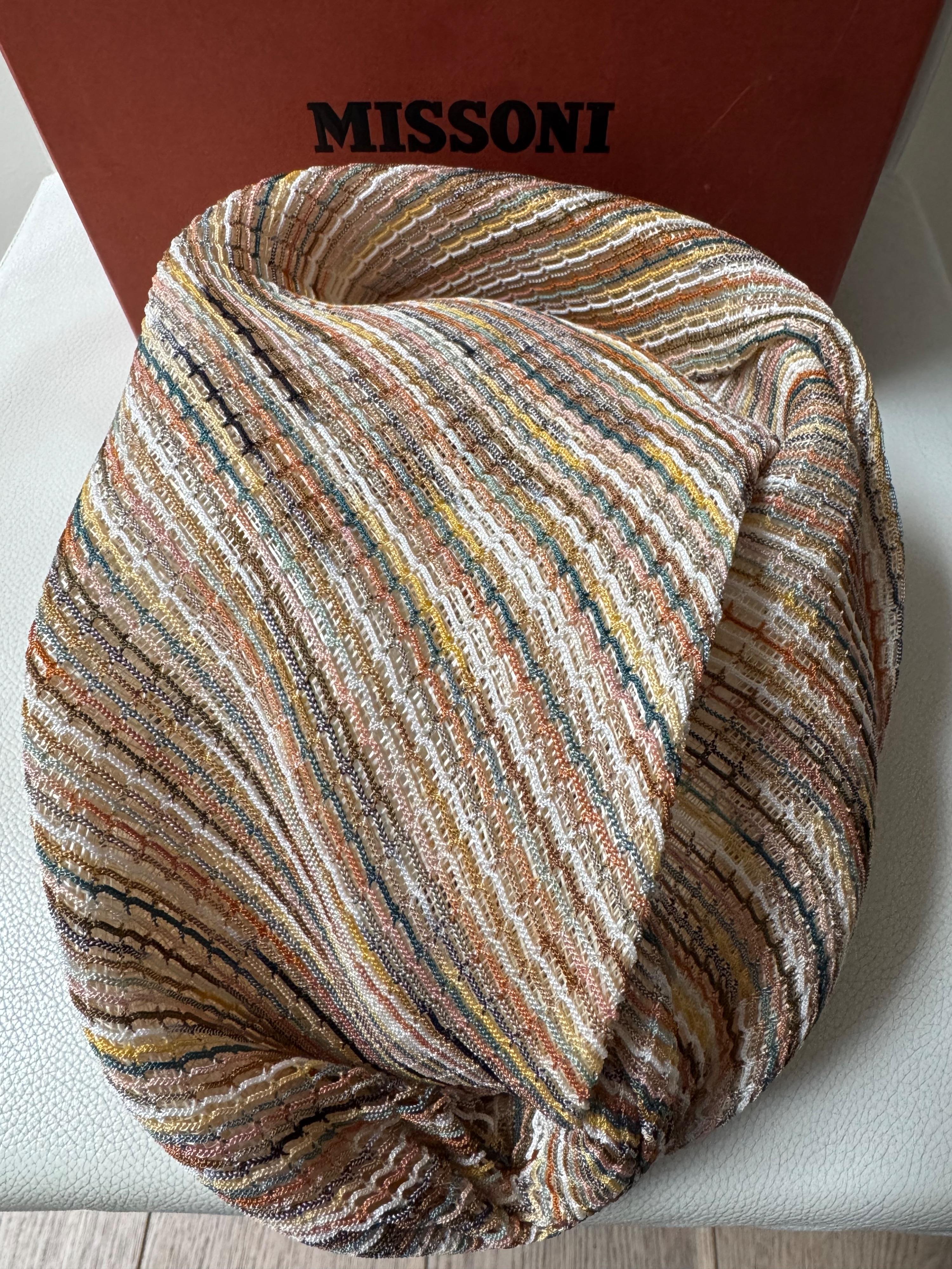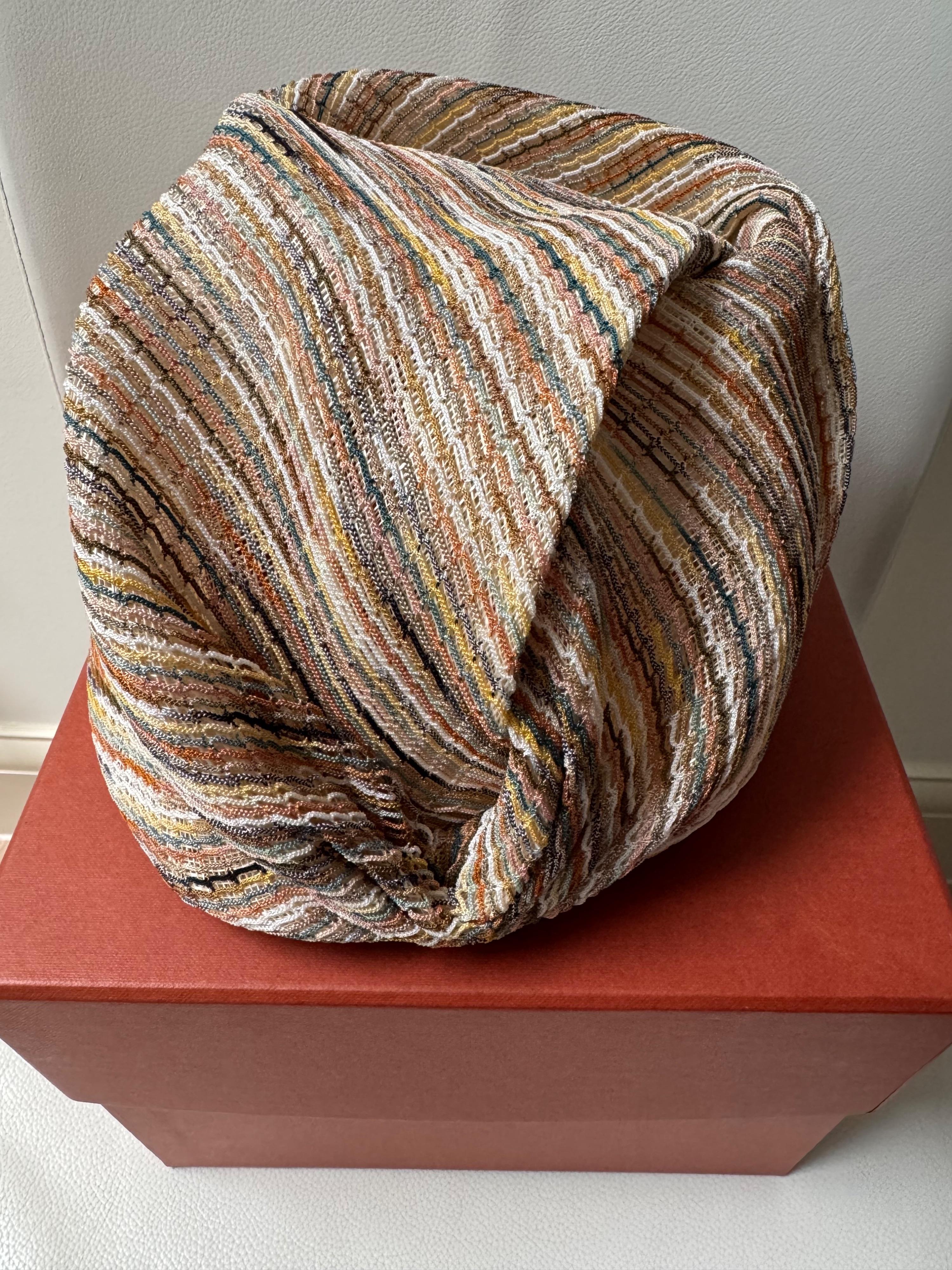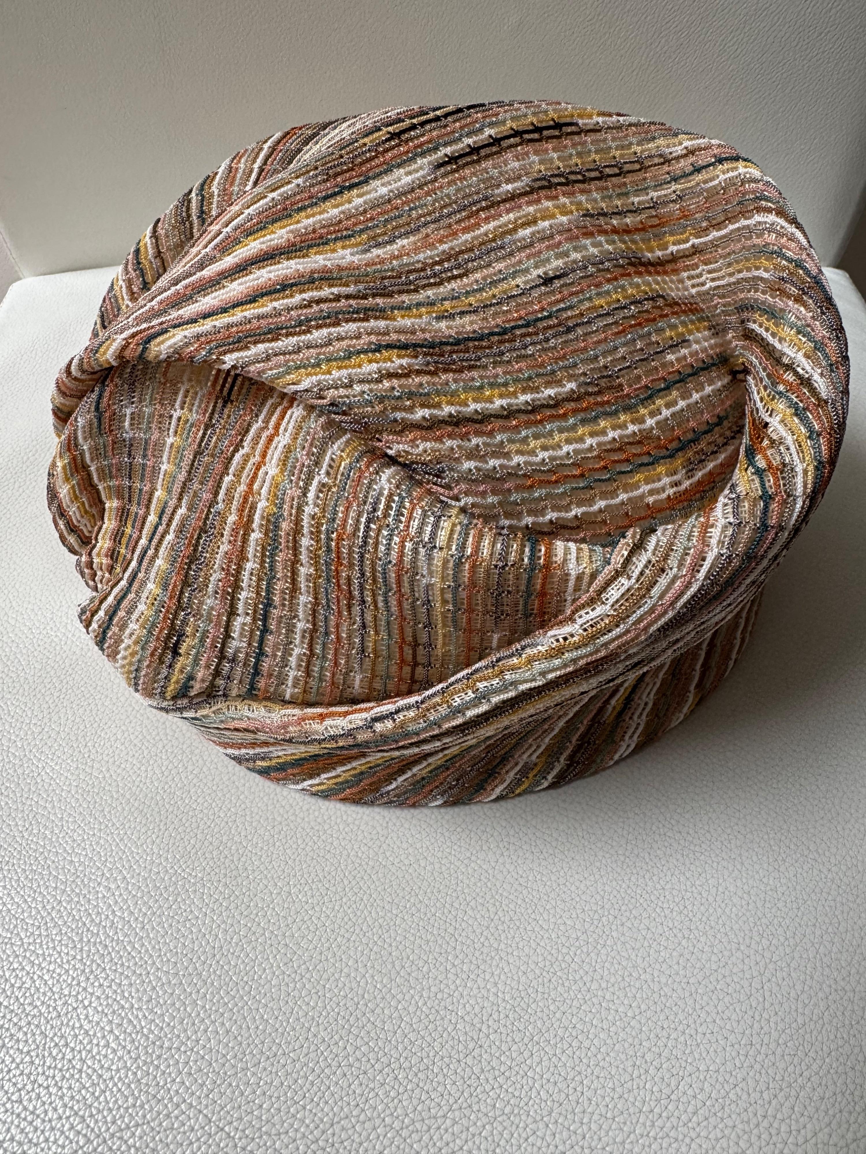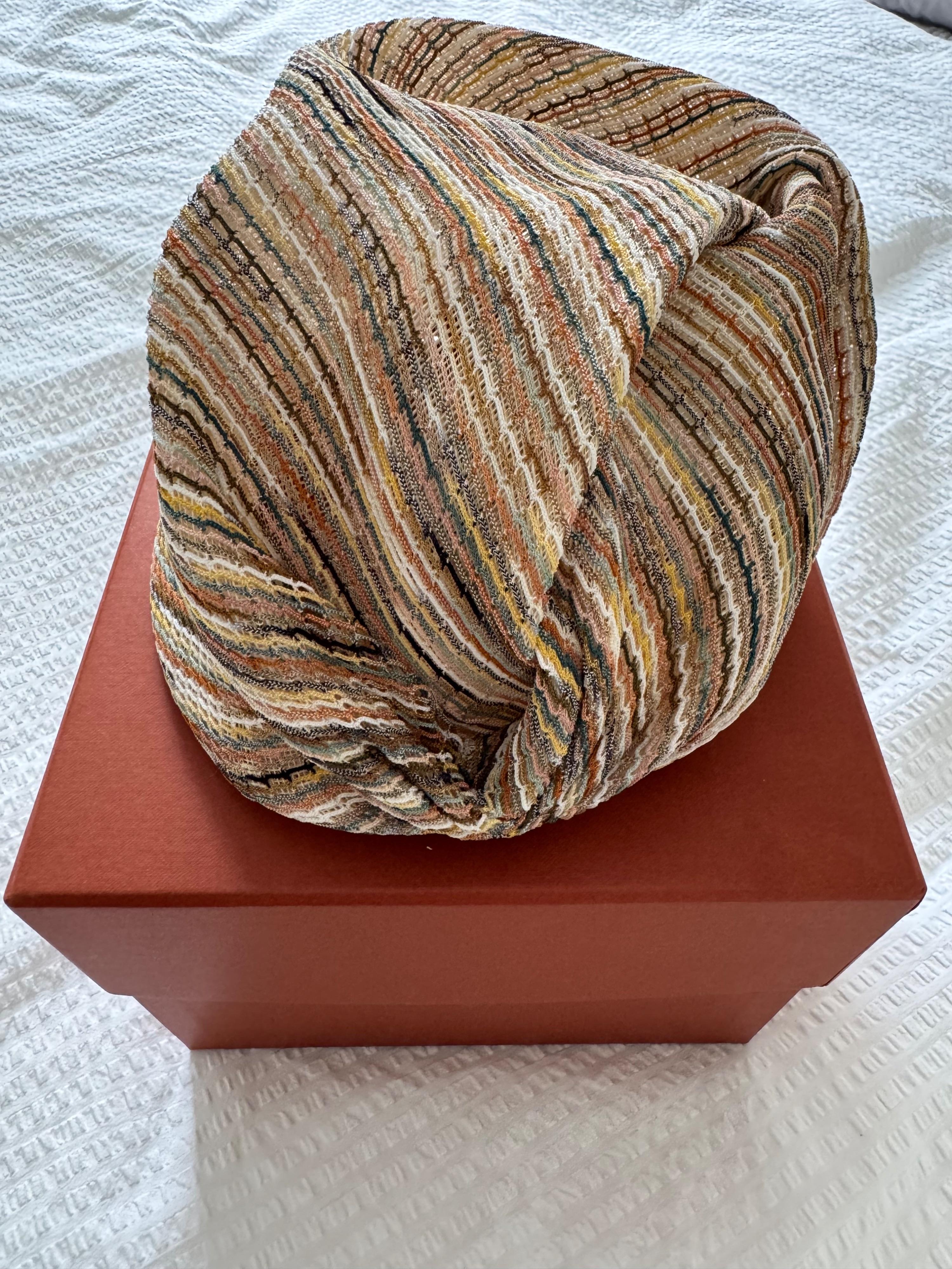 Missing straw beige multicoloured turban perfect for vacation.Cones in original box never worn size medium.