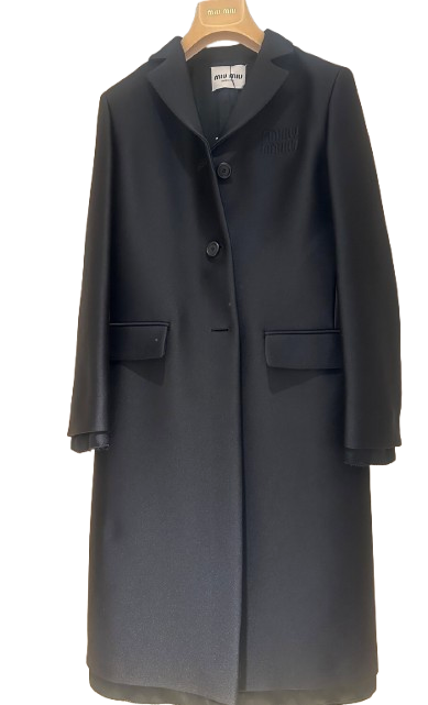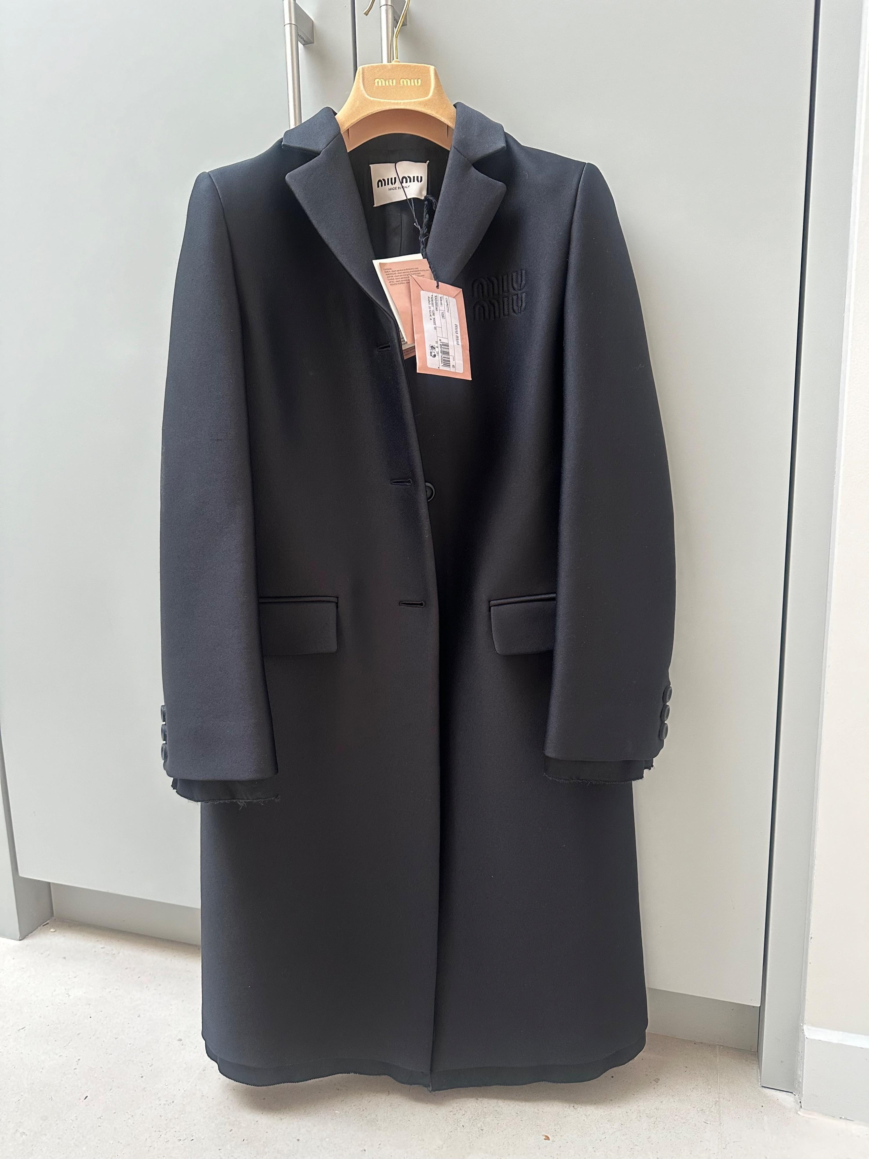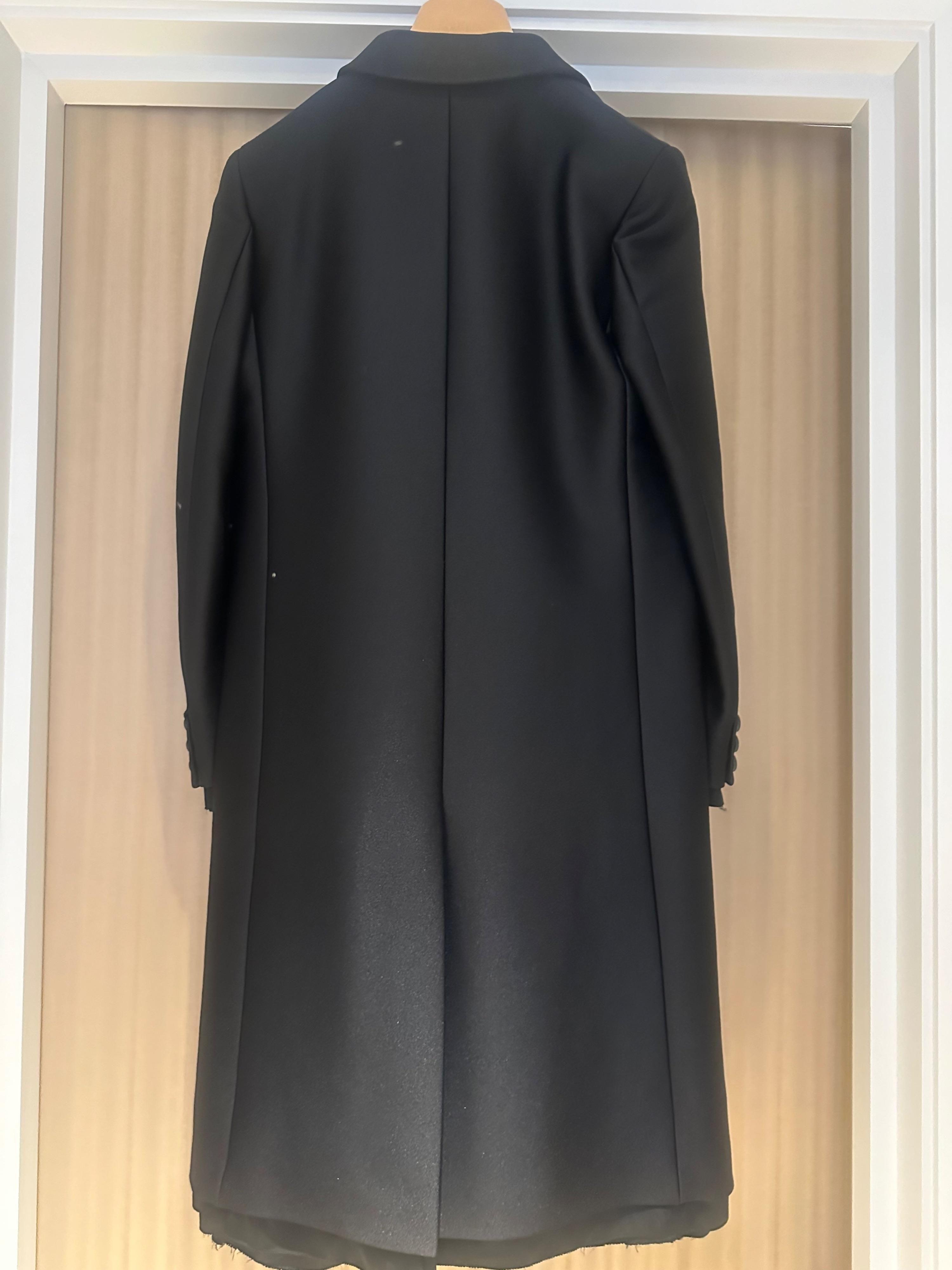 Stunning elegant, three button logo coat. Silk Trimming on the sleeves and the ham.
