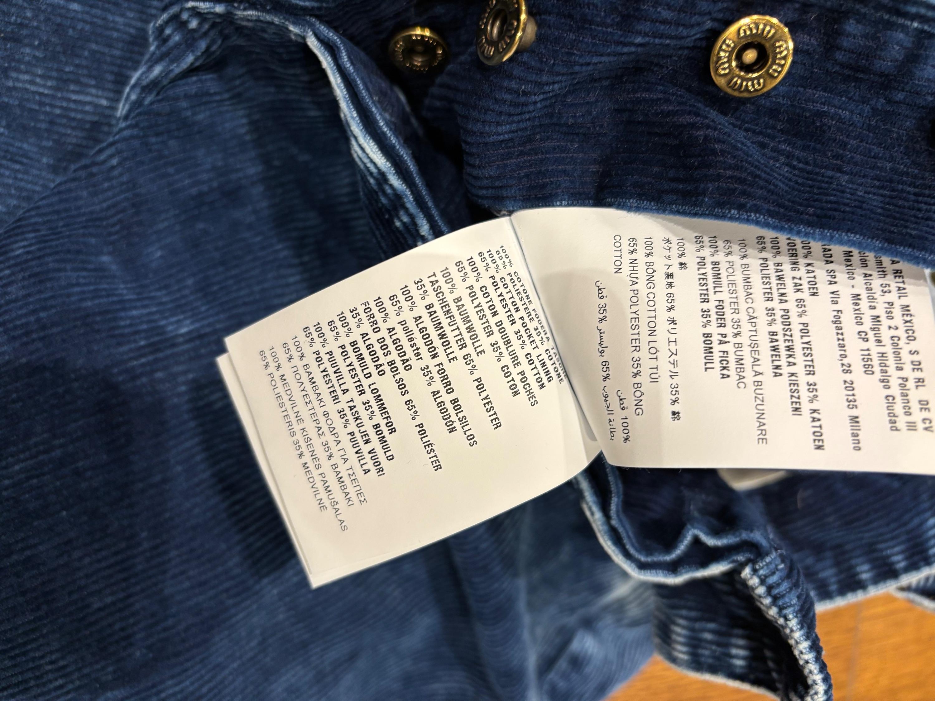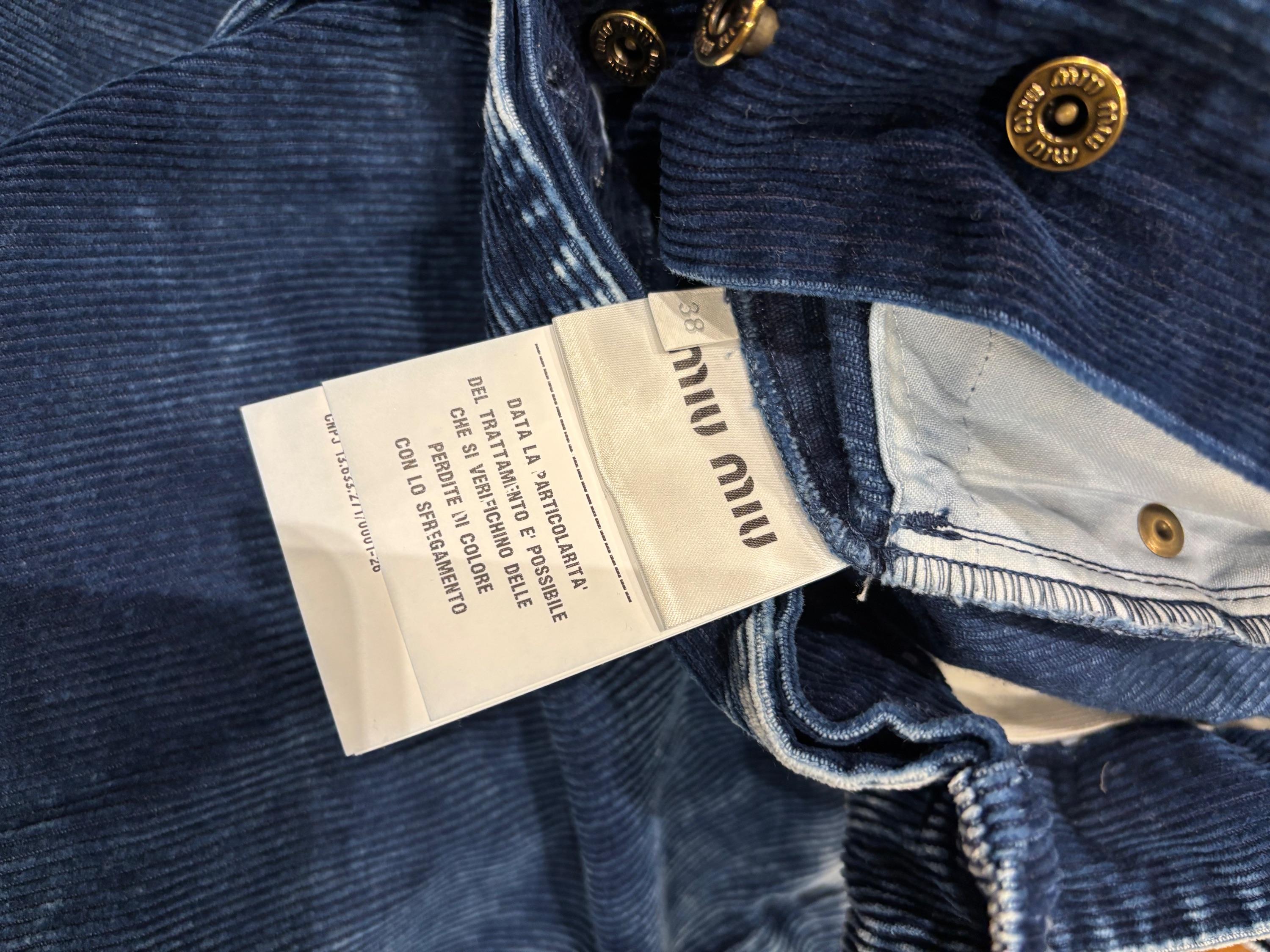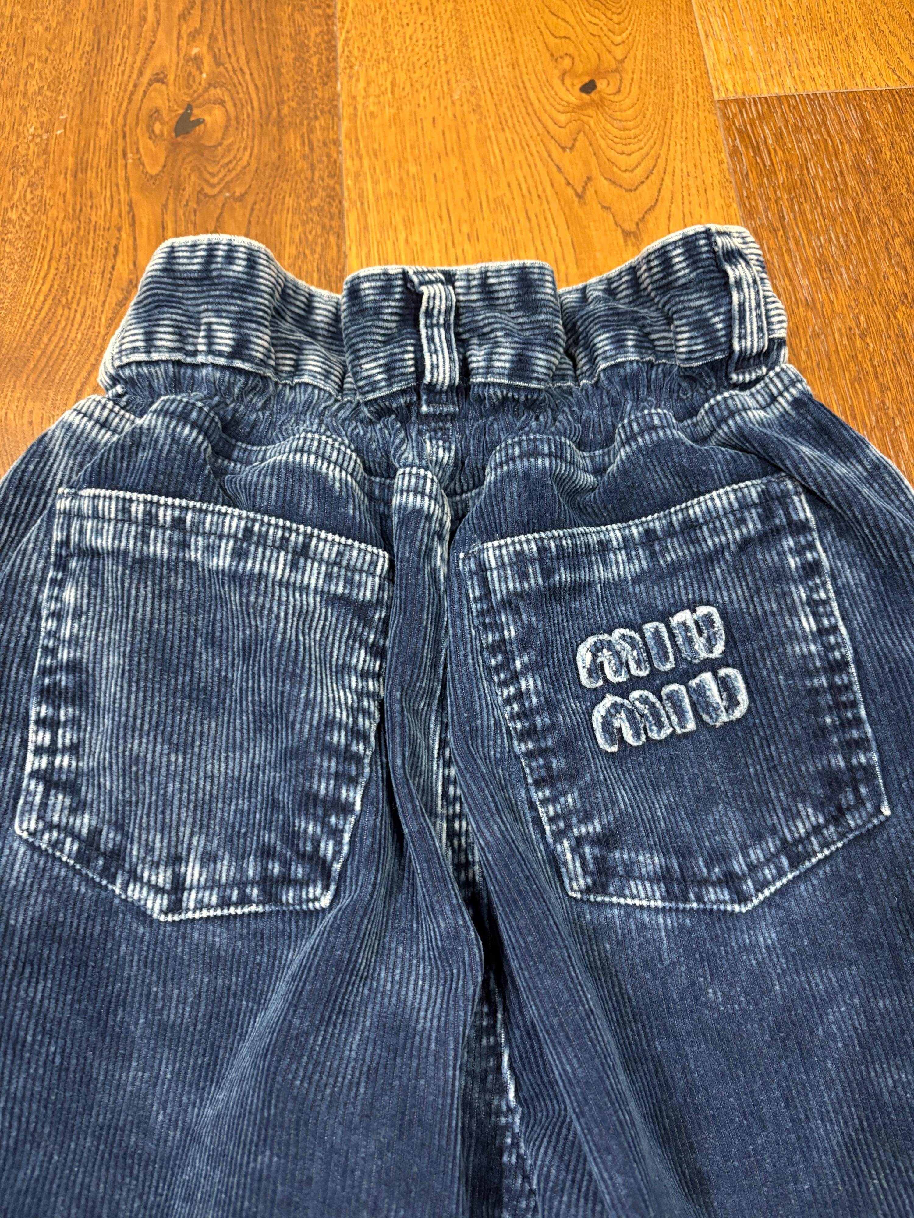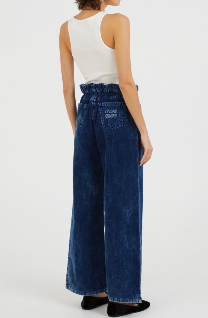 Blue corduroy wide-leg pants with a paperbag waist and embroidered Miu Miu logo on the back pocket. Made in Italy.