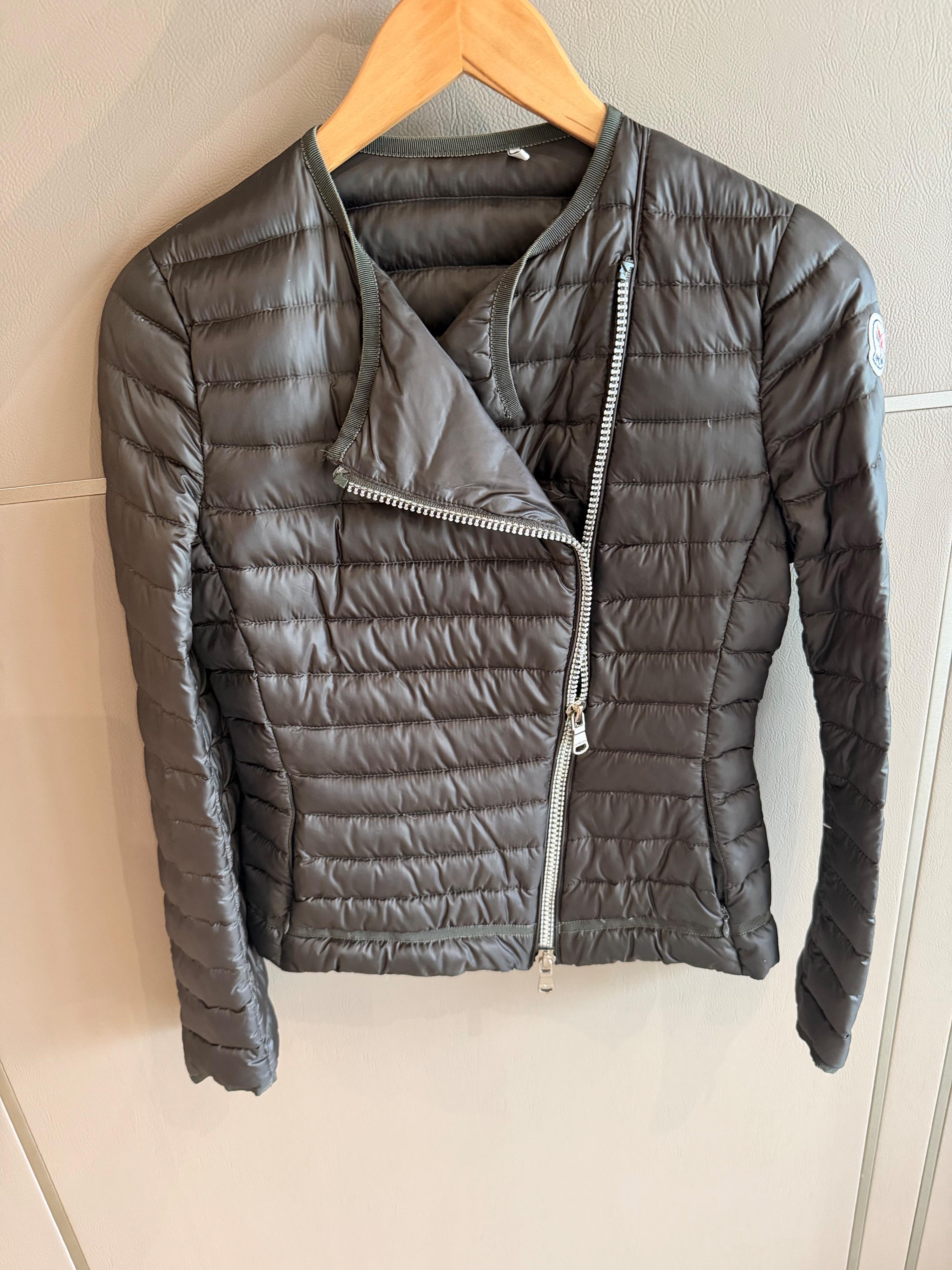 Elegant and lightweight Moncler jacket in a military green color, filled with premium feather down for warmth without bulk. Slim, feminine fit with signature quilted design and stylish asymmetrical zipper. Ideal for spring, autumn, or layering in winte