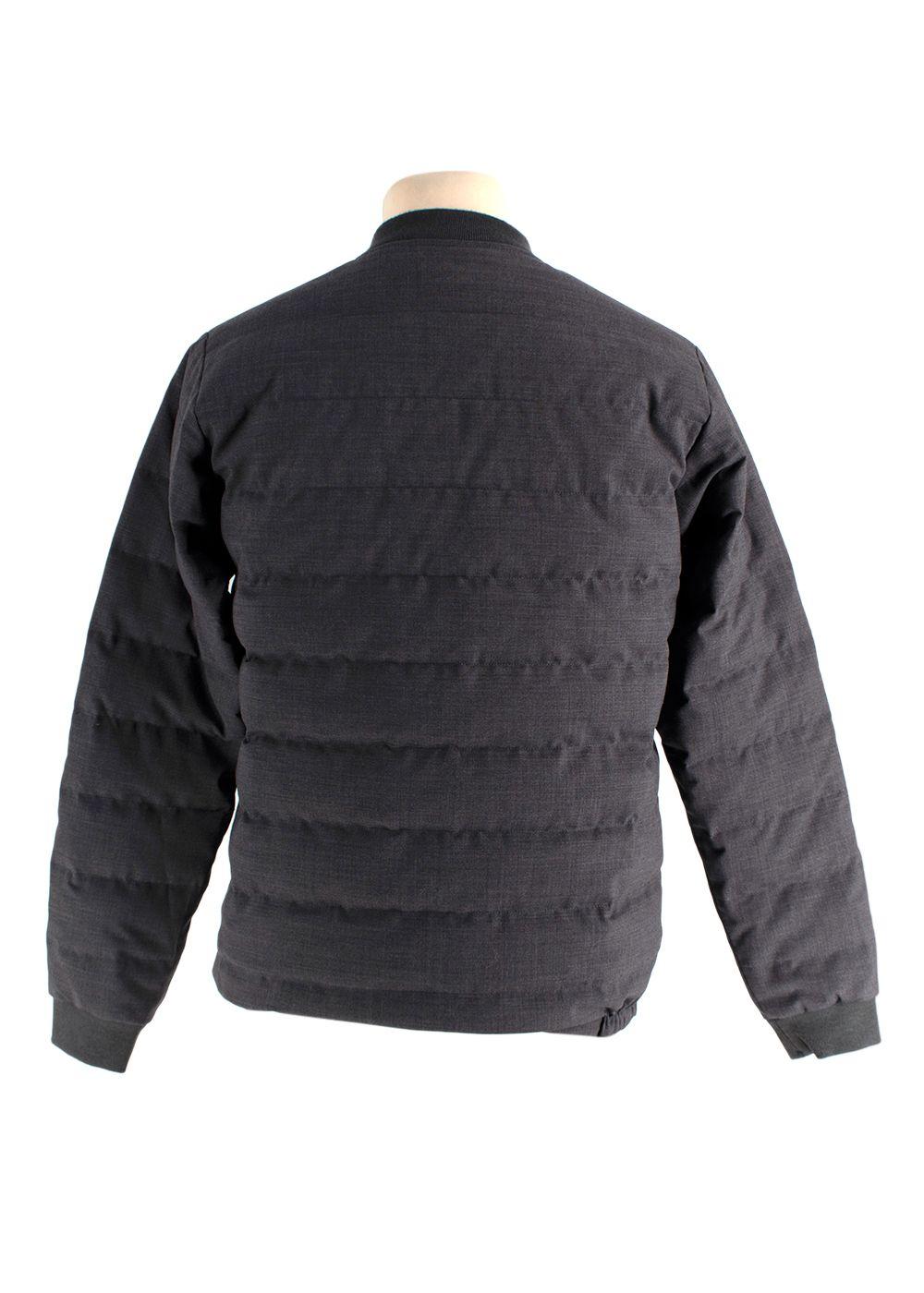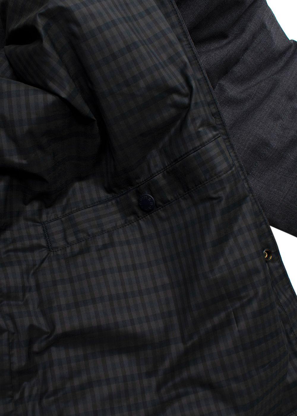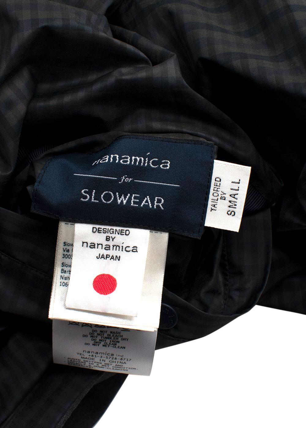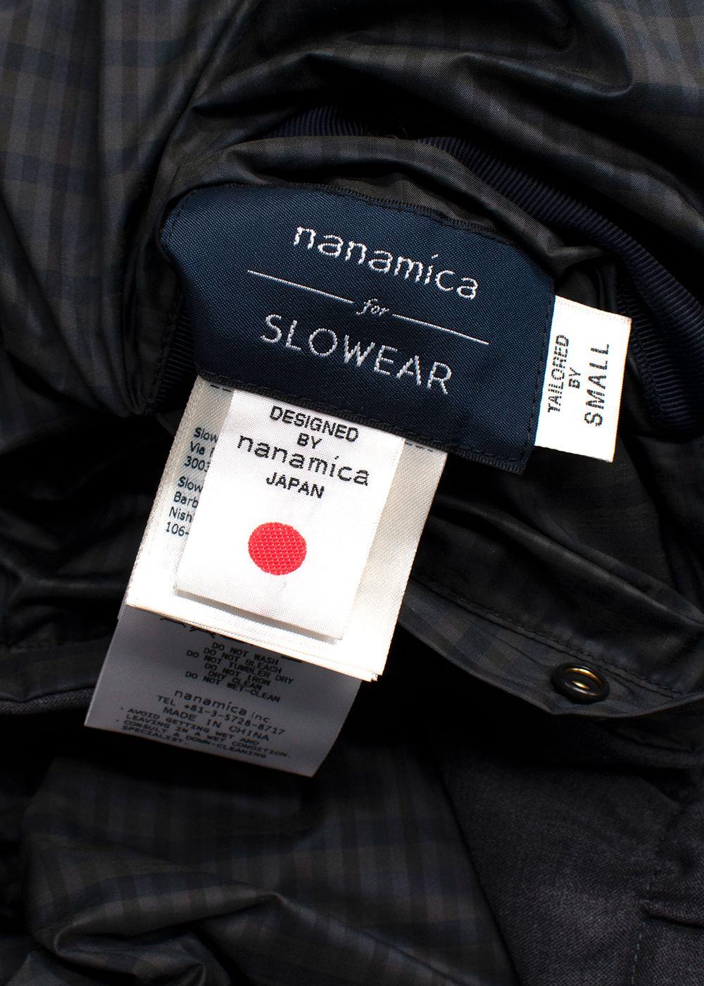 one side shows a dark quilted/padded look, the other a flatter, more matte shell — consistent with nanamica’s reversible design language. The tag shows “nanamica for SLOWEAR,” a collaboration or distribution under SLOWEAR.