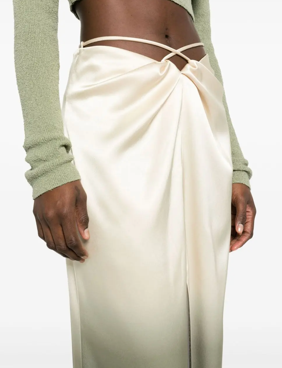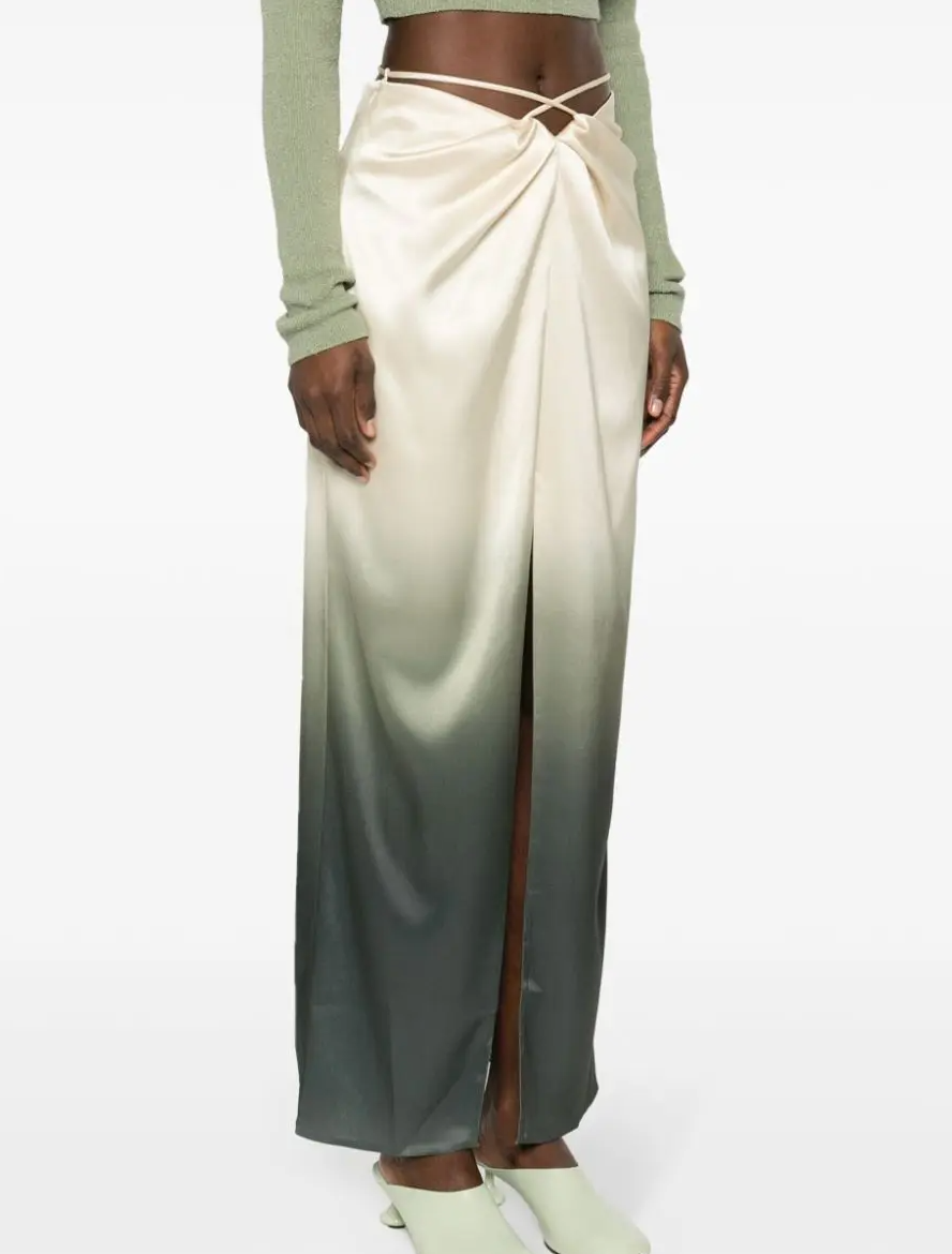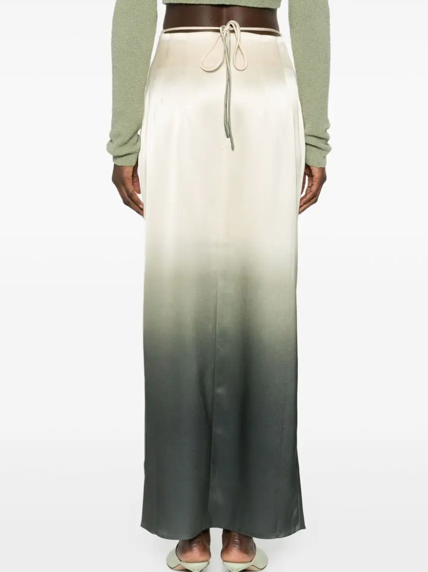 This maxi skirt from Nanushka features an ombré effect and is crafted from satin. It has a high waist, asymmetric draped waistline, tie back fastening, and a straight hem.
