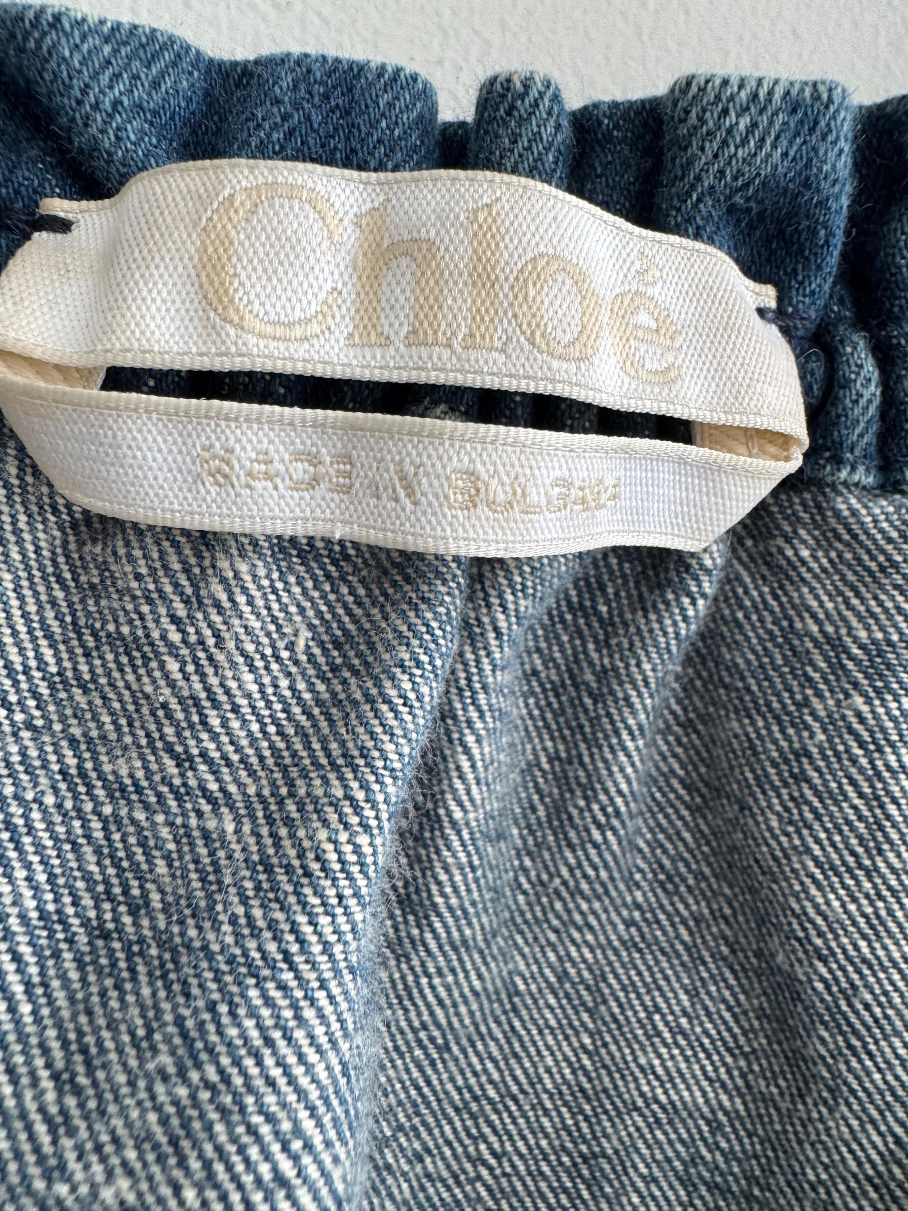 Blue cotton off the shoulder denim dress from Chloé featuring an off the shoulder design, long sleeves, a drawstring waist, elasticated cuffs, distressed effects, a long length and a stonewashed effect.