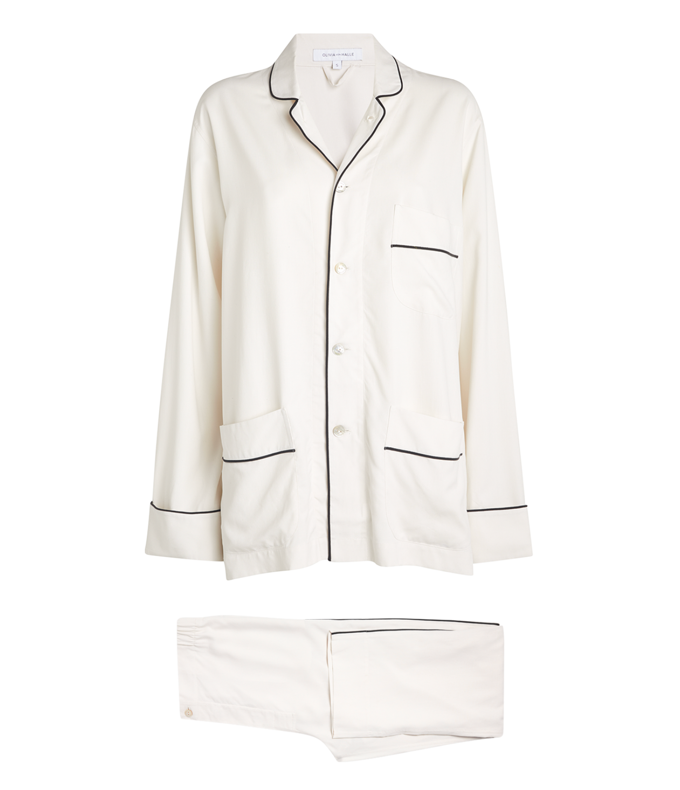 Constructed with a timeless silhouette that is a luxuriously soft, elegant fit for all genders, the Laurent silk pyjama set is a classic Olivia von Halle piece. This luxurious ivory silk pyjama set, with its smooth texture and chic detailings, including navy piped silk trims, makes it luxury loungewear beyond compare. This style and silhouette is suited to all, and does not adhere to gender boundaries.