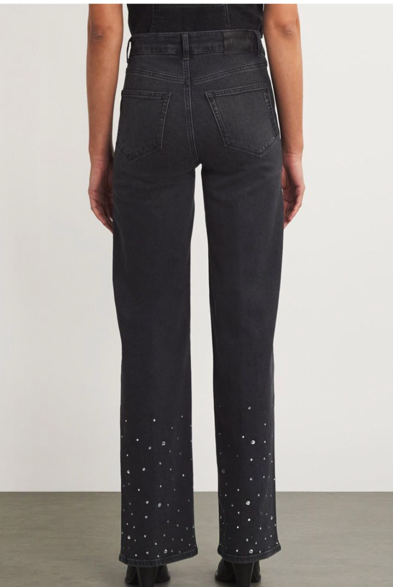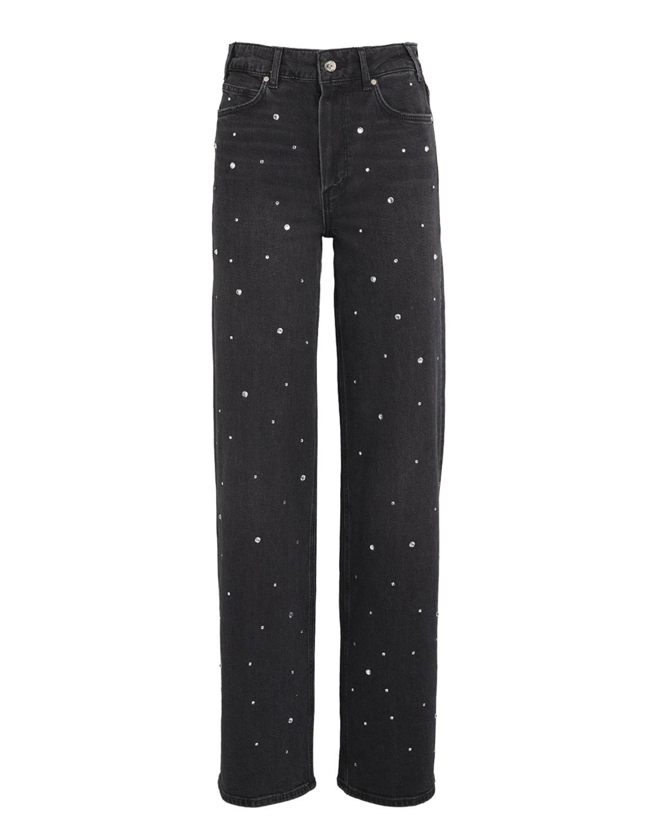 These stretch-denim jeans by PAIGE feature a relaxed fit, high-rise, and wide leg. They have belt loops, five pockets, a brand patch at the back, pressed creases at the front and back, a faded wash, whiskering, and crystal embellishment on the leg. They are made of 94% cotton, 5% polyester, and 1% elastane and feature a button and zip-fly fastening.