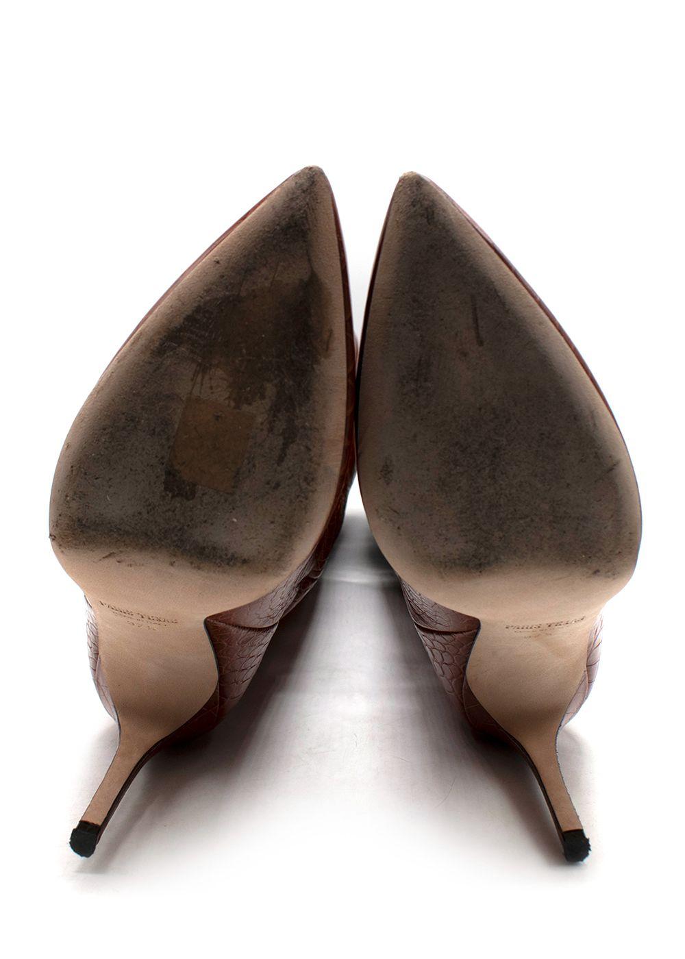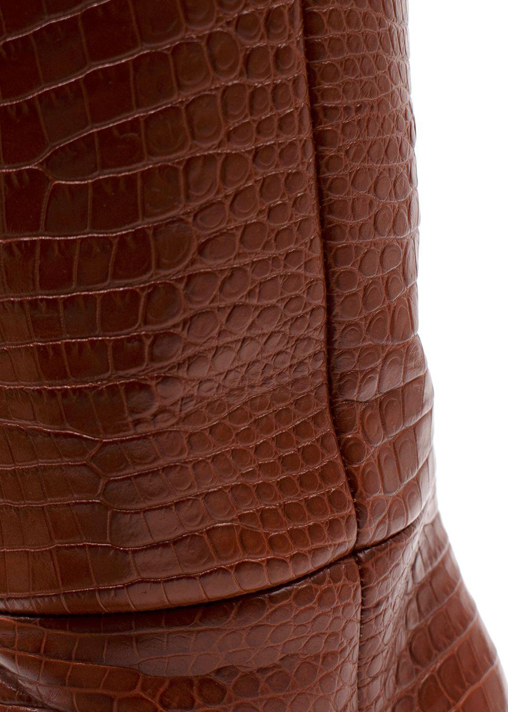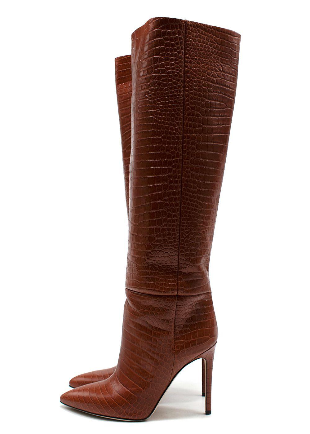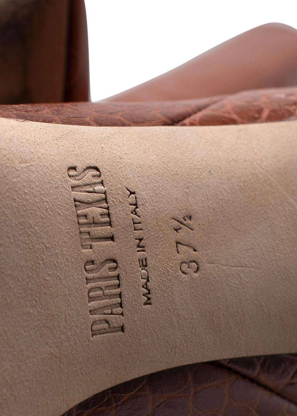 These appear to be a pair of Paris Texas knee-/calf-length stiletto boots in brown crocodile-embossed leather. The pointed toe, high stiletto heel, and smooth croc-print leather with tonal stitching all match common Paris Texas designs. The “Made in Italy” stamp on the sole also lines up with the brand’s usual manufacturing origin.