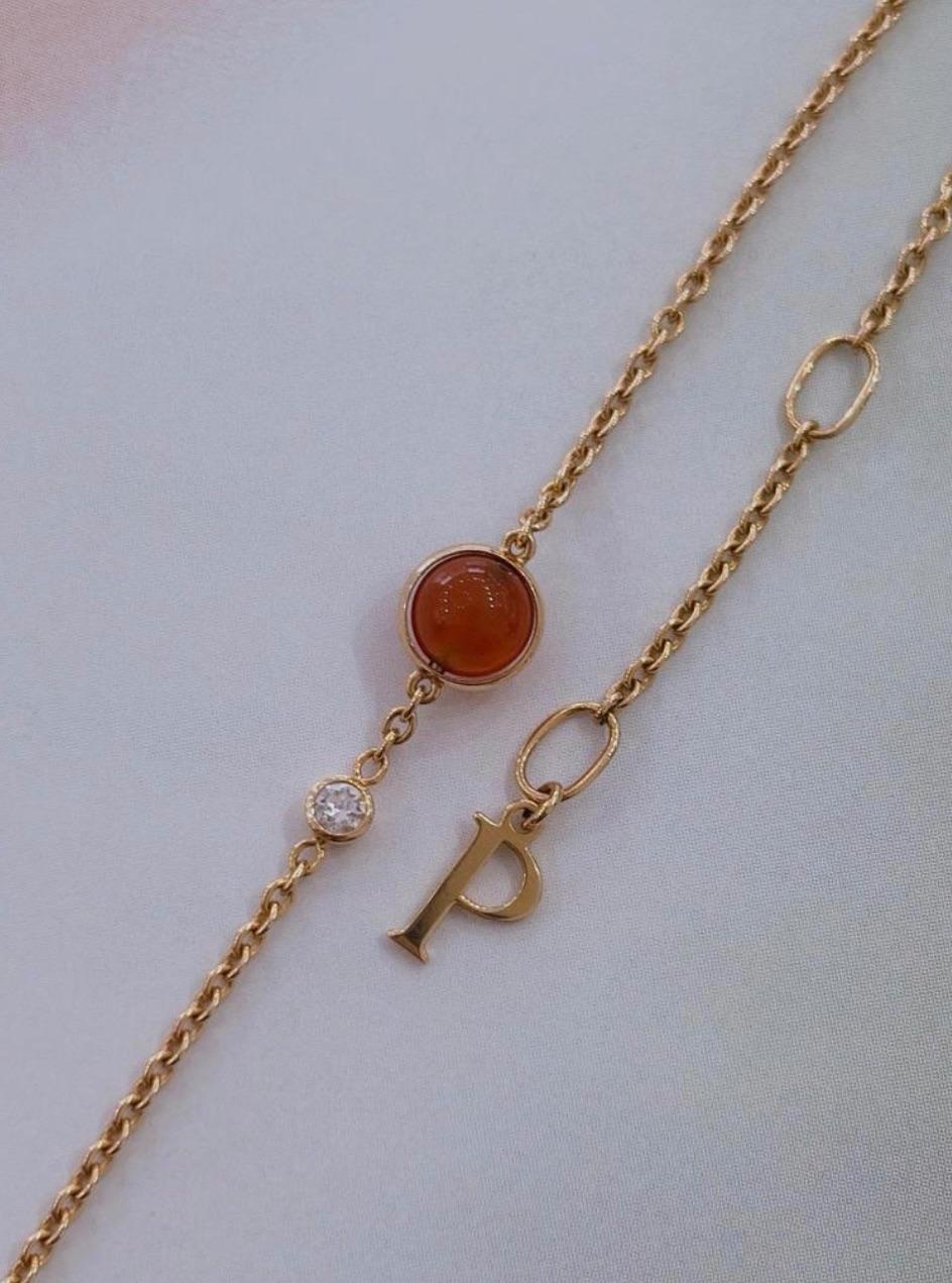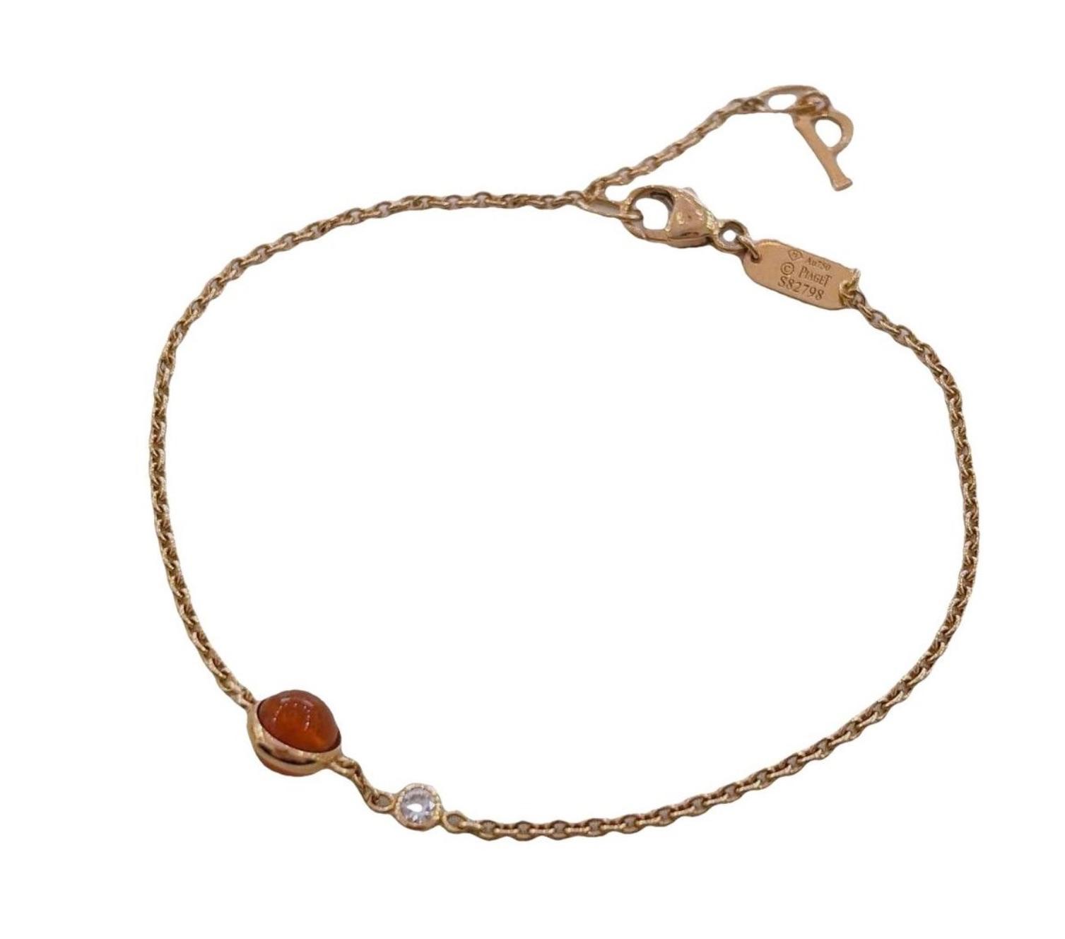 Piaget18ct rose gold possession bracelet with single solitaire brilliant cut diamond (0.05 ct)and carnelian bead. The carnelian is set in signature possession setting so you can twirl it in any direction. Retails for £1570. No accessories or box.