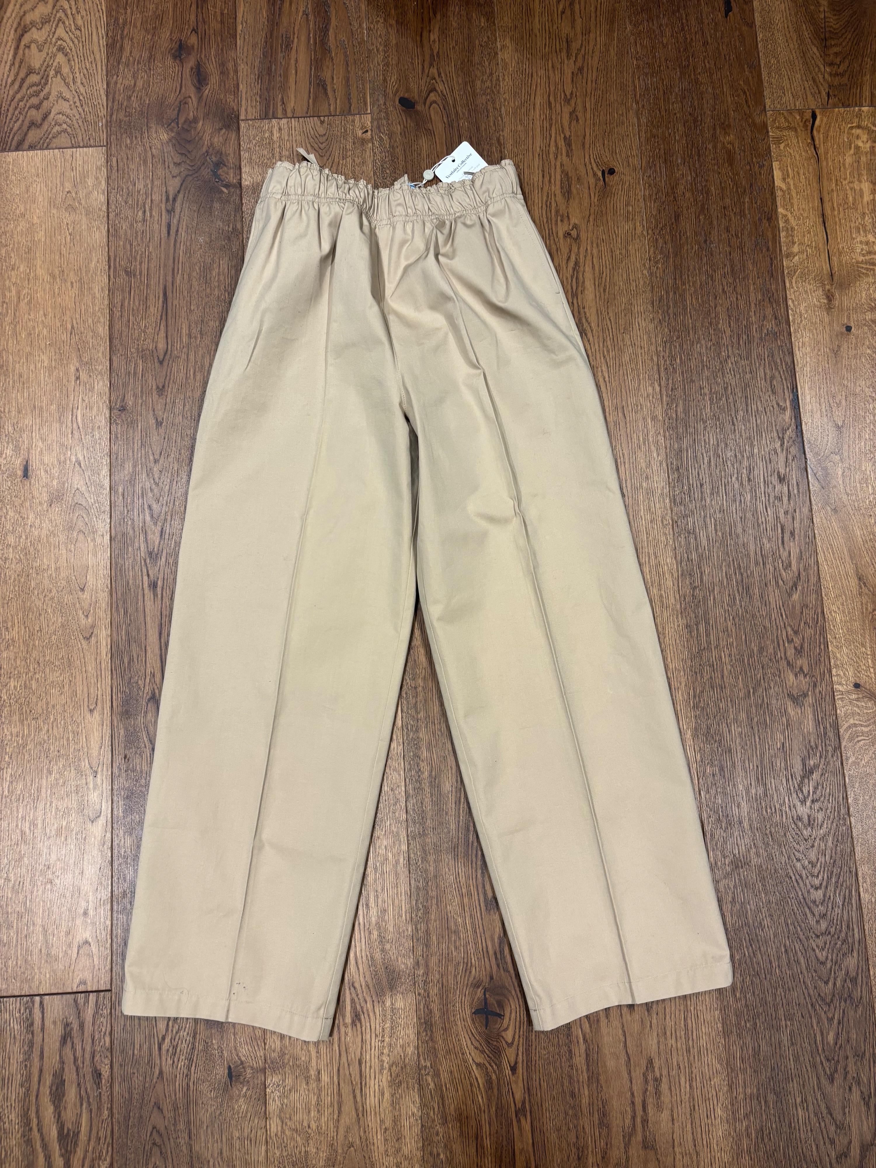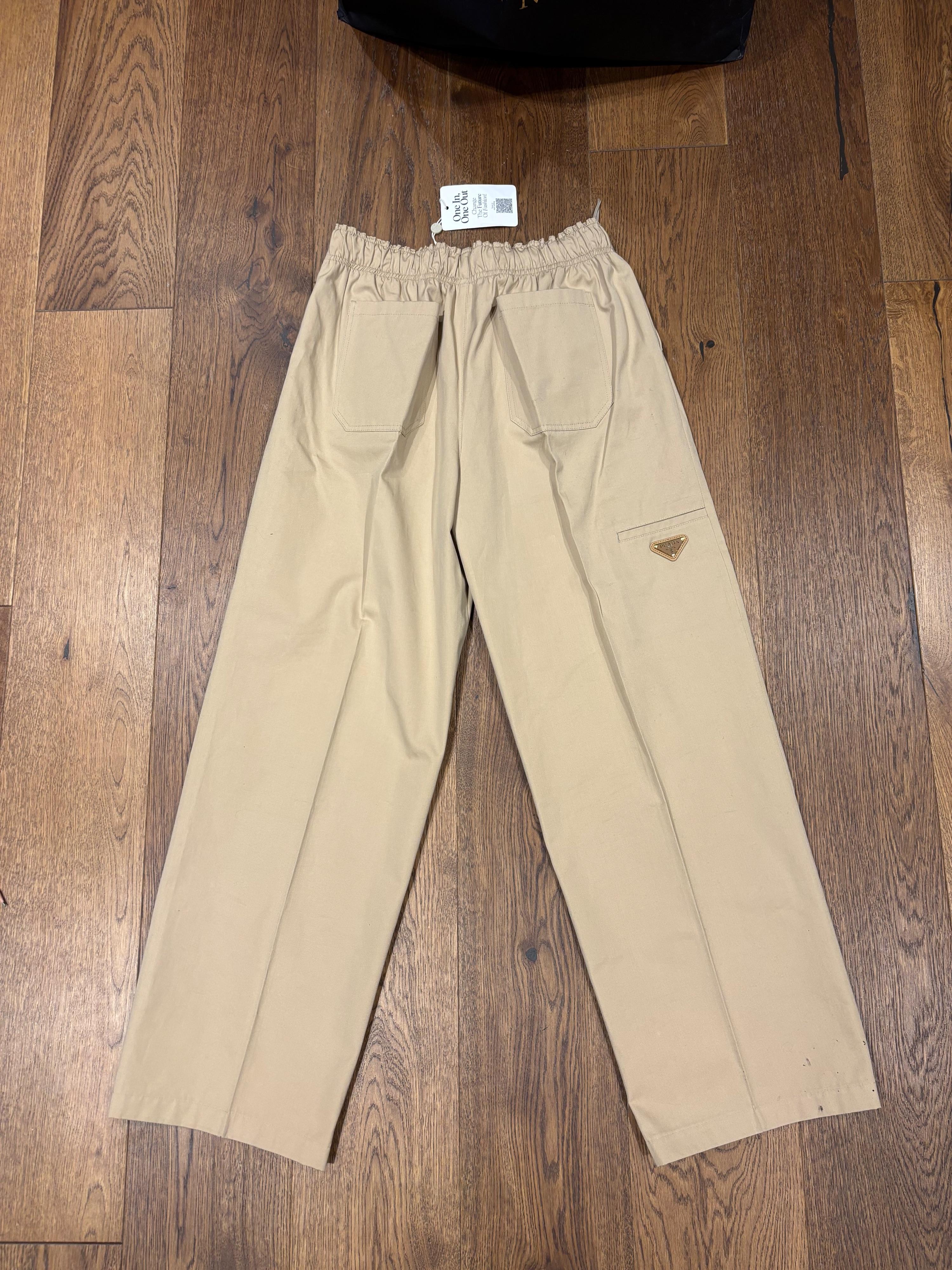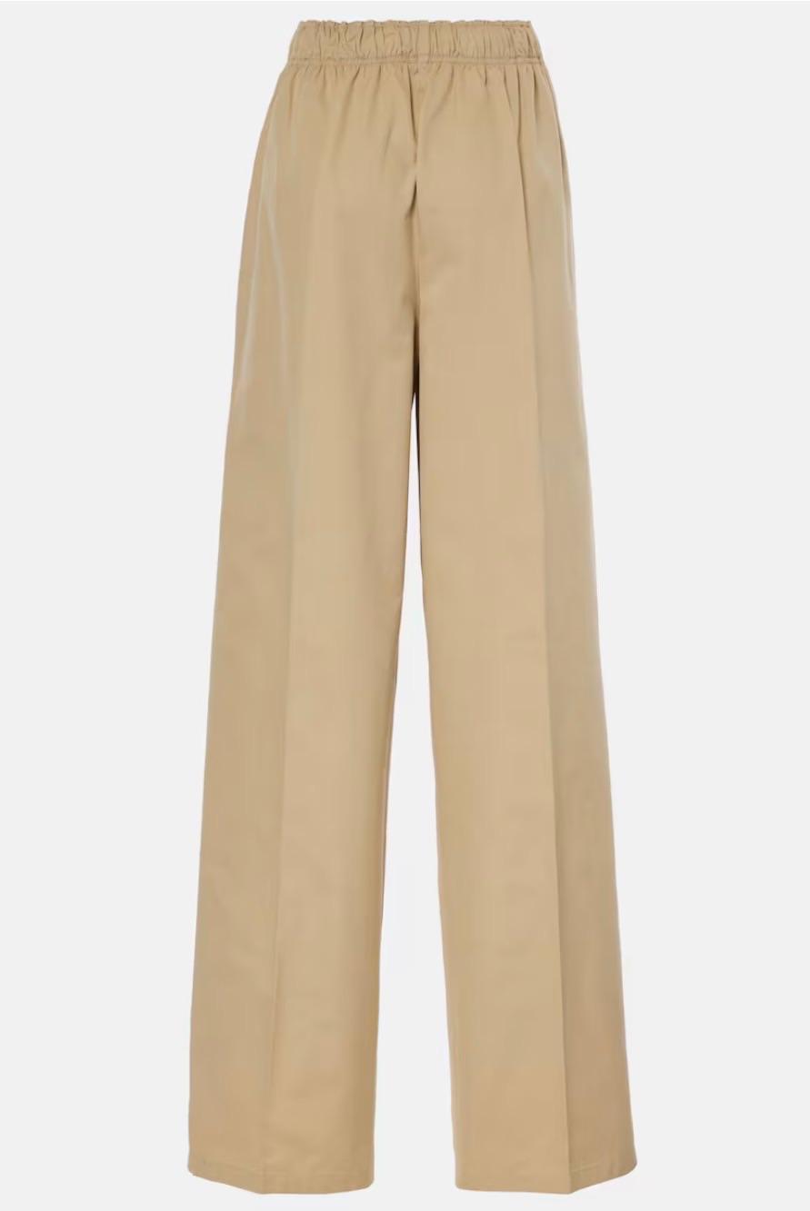 Beige cotton wide leg trousers from Prada. Features an elasticated waistband, side pockets, and a signature Prada triangle logo detail on the left leg. The trousers have a relaxed, wide-leg silhouette.