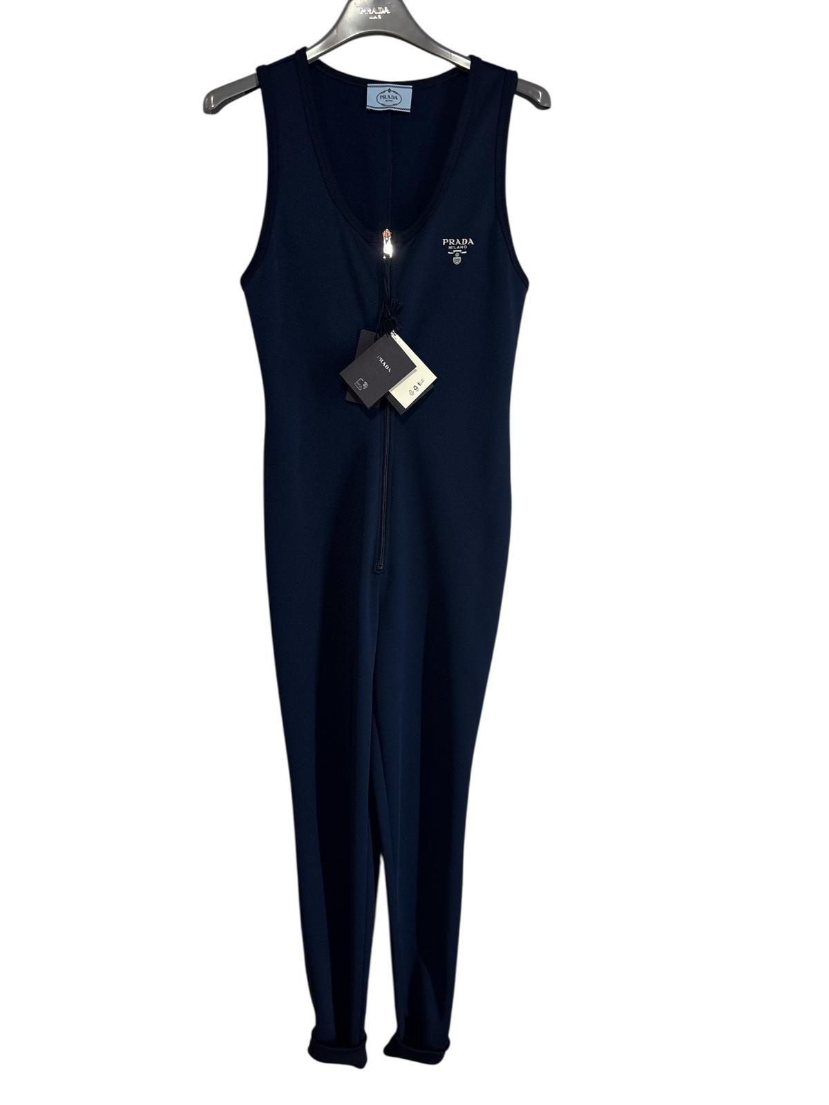Elegant Prada jumpsuit crafted in refined blue technical fabric, featuring a clean and contemporary silhouette that reflects the brand’s iconic minimalist aesthetic.