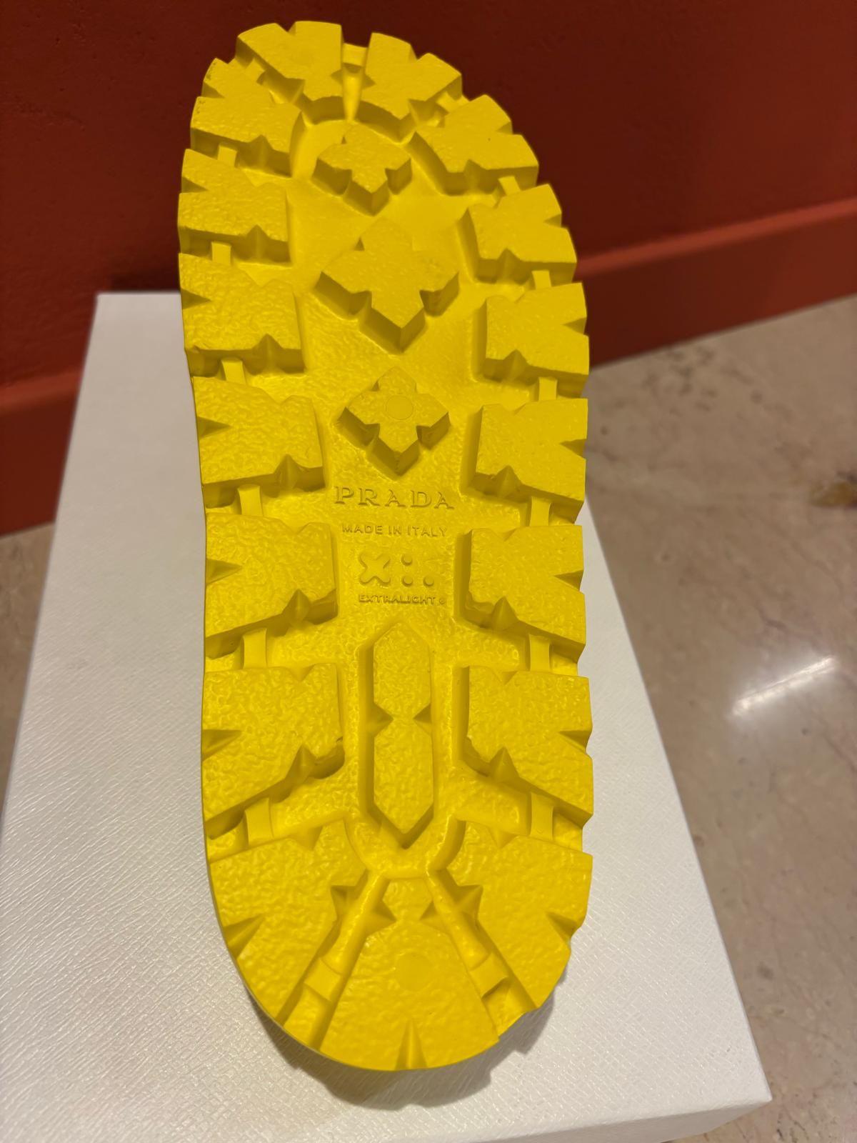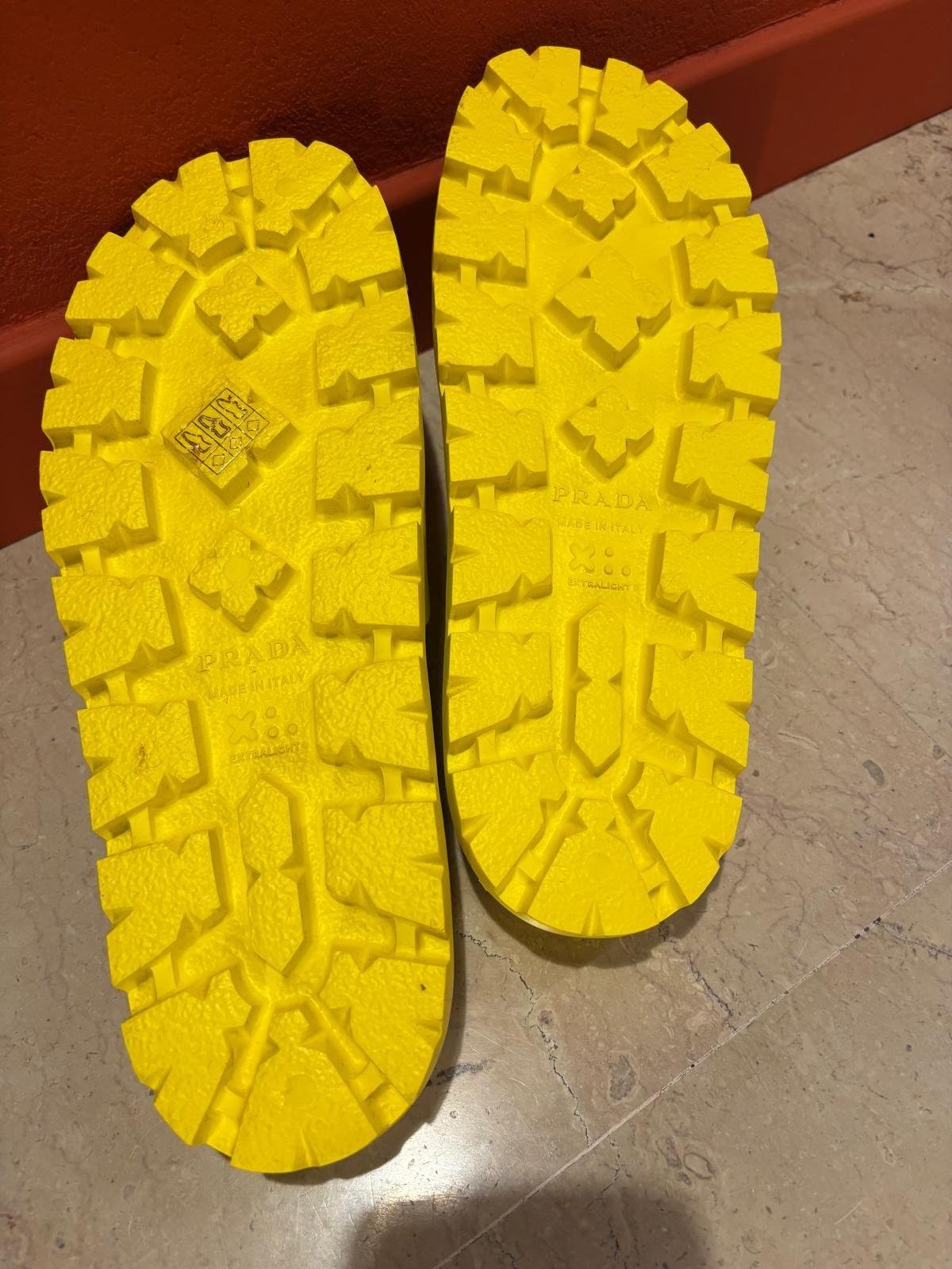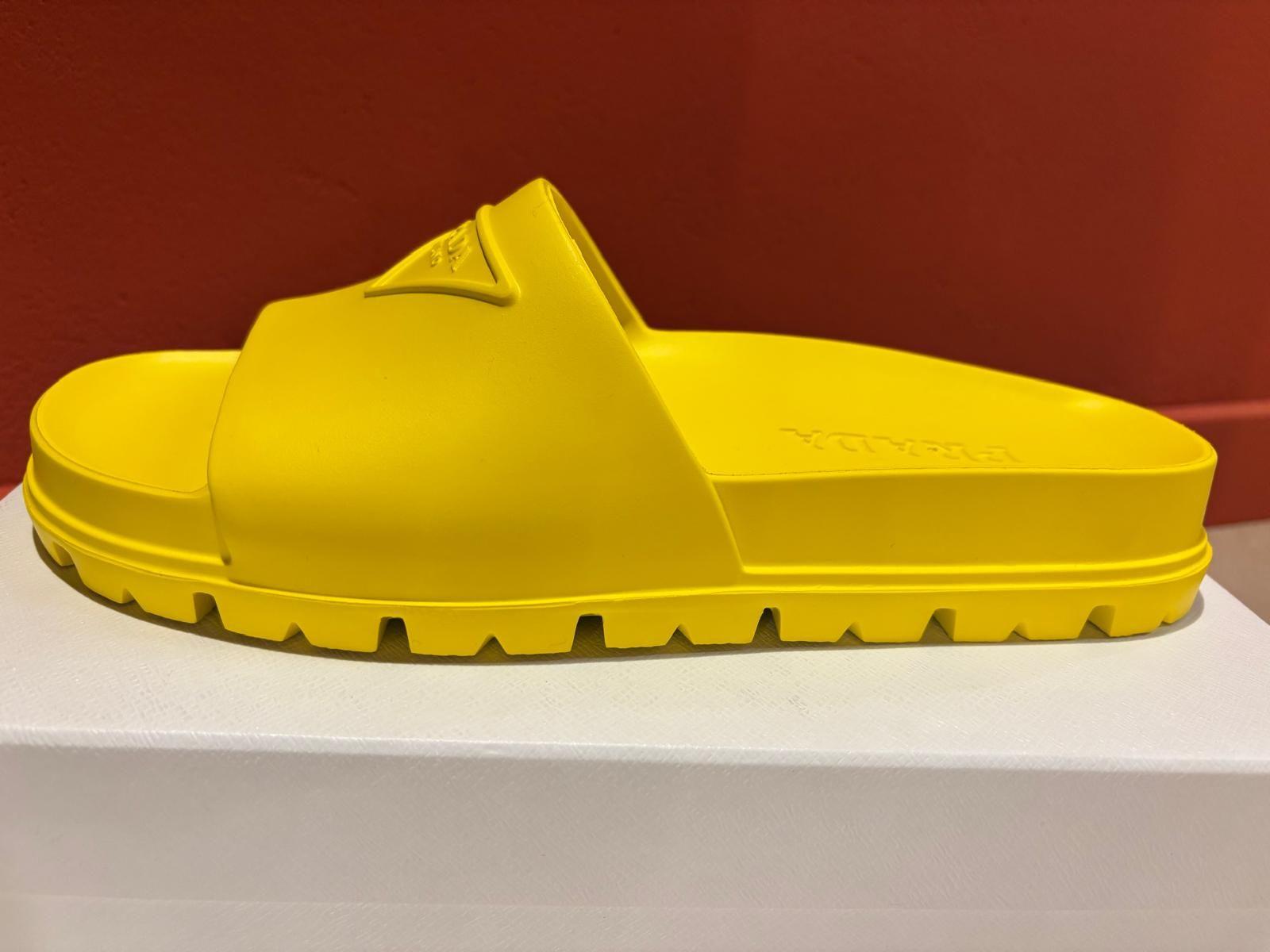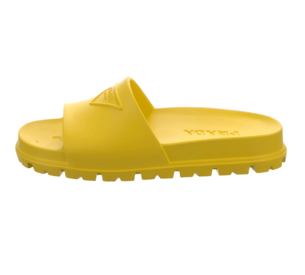 Prada rubber slide sandals in a vibrant yellow tone, featuring a bold and contemporary design. The slip-on silhouette is defined by the iconic Prada Milano triangular logo in relief on the front strap, a signature detail of the brand.