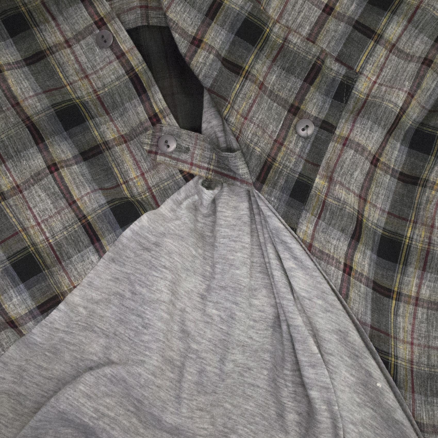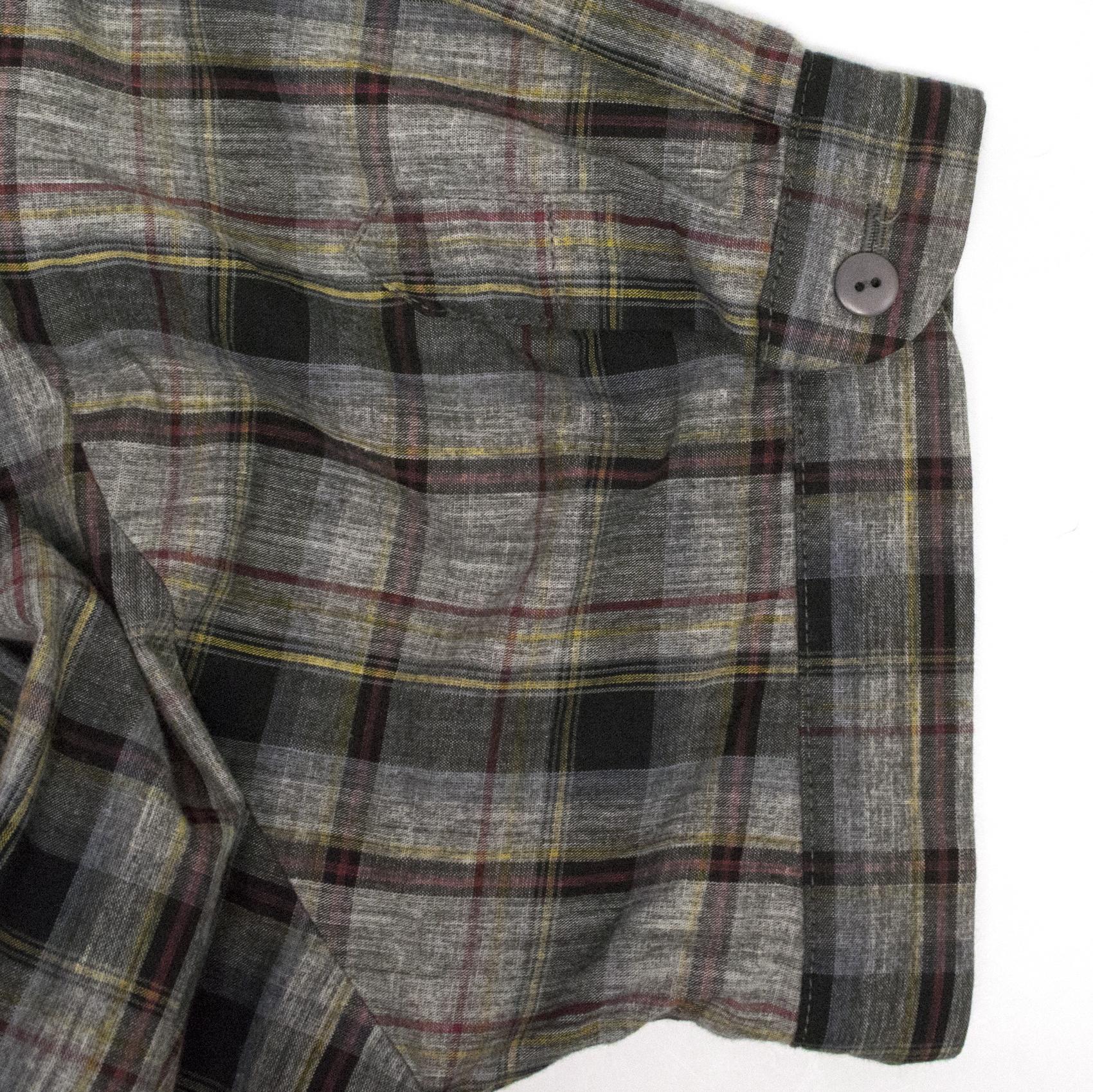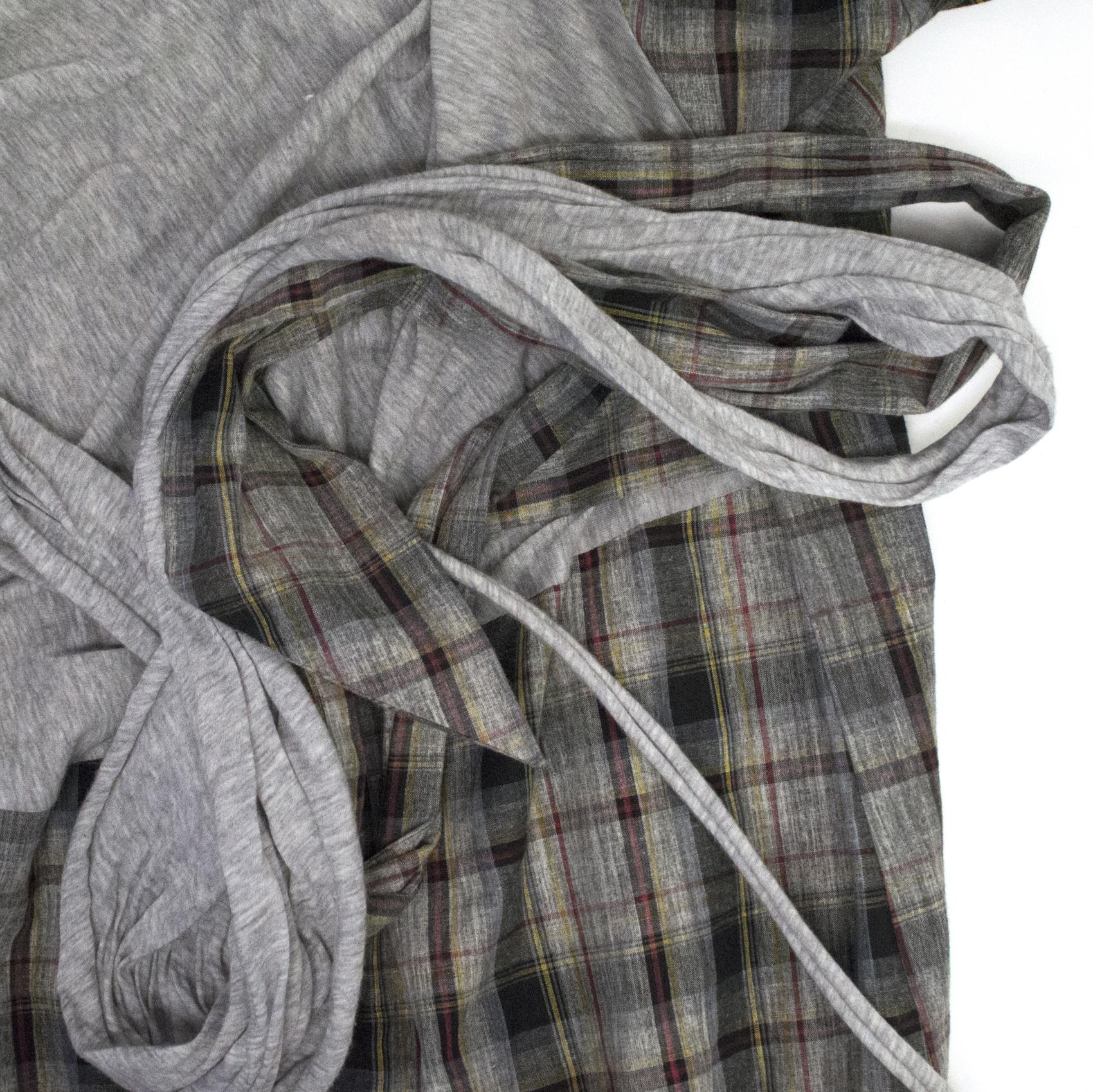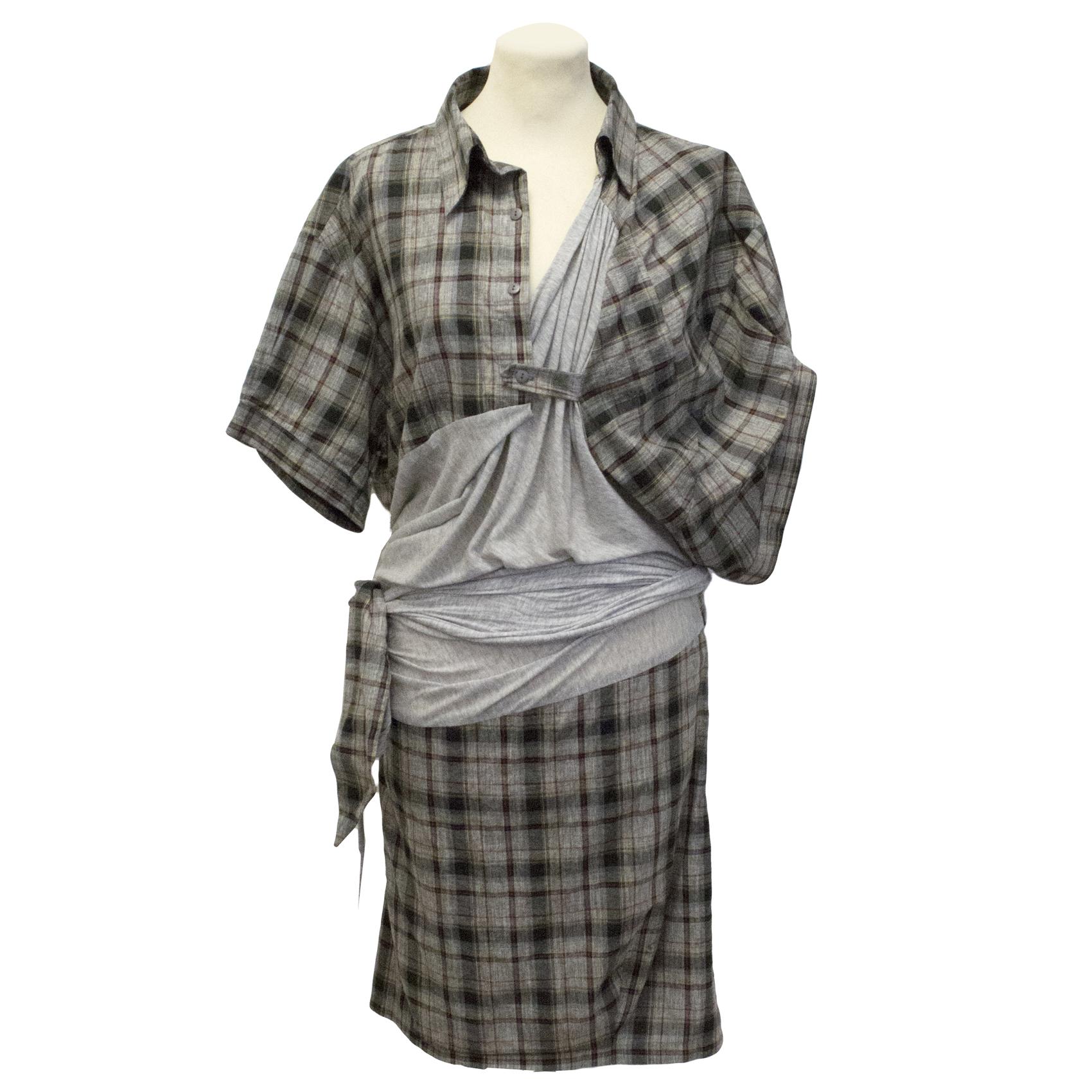 Preen grey dress with tartan pattern and grey fabric. The asymmetrical neckline gives this piece a unique and edgy look. The grey fabric can be tied at the waist into a bow, making it adjustable to size.