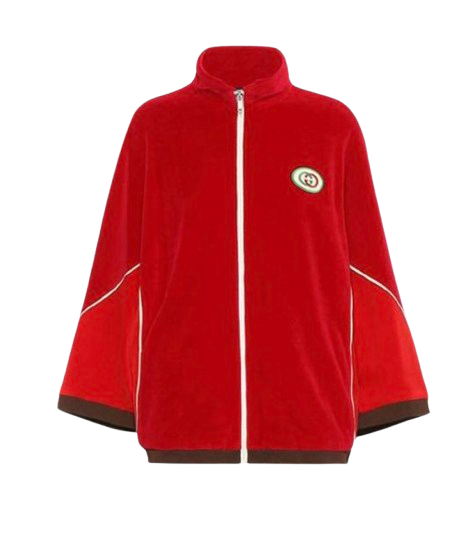 Gucci homage to the 80s, velvet tracksuit top. Chenille velvet, a retro mix of Red, Brown and cream trim.